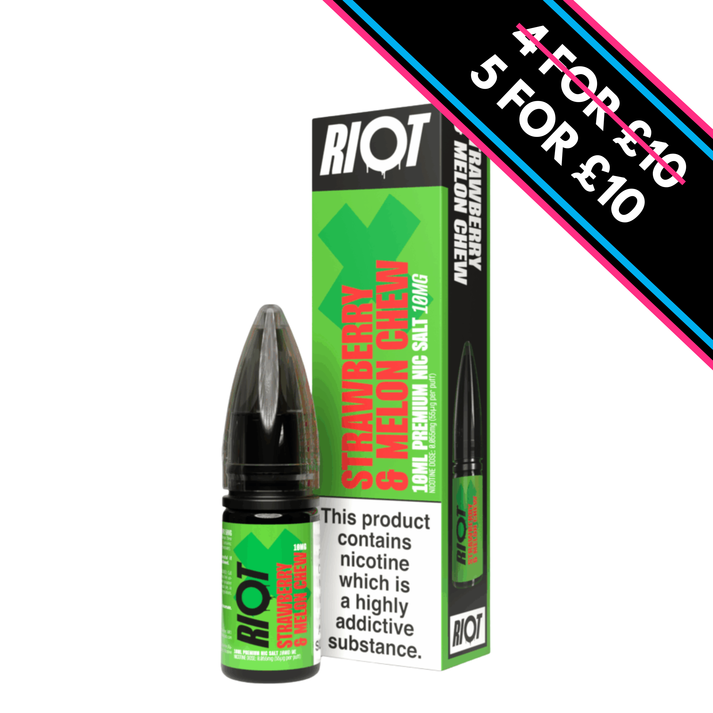 Each bottle contains 10ml of 10mg nicotine salt e-liquid, with Riots classic and sweet e-liquid formulation used throughout the range.