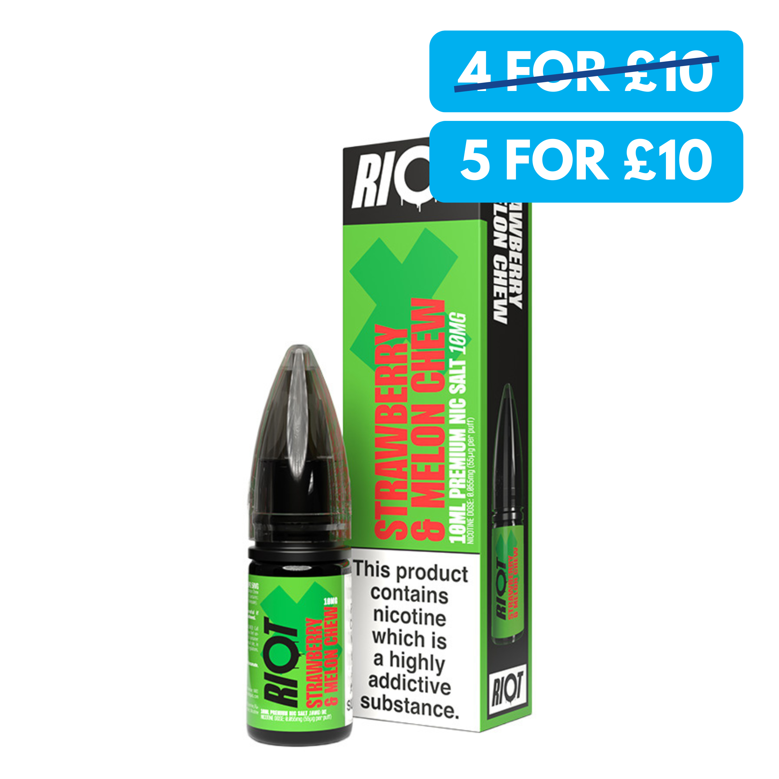 Each bottle contains 10ml of 10mg nicotine salt e-liquid, with Riots classic and sweet e-liquid formulation used throughout the range.