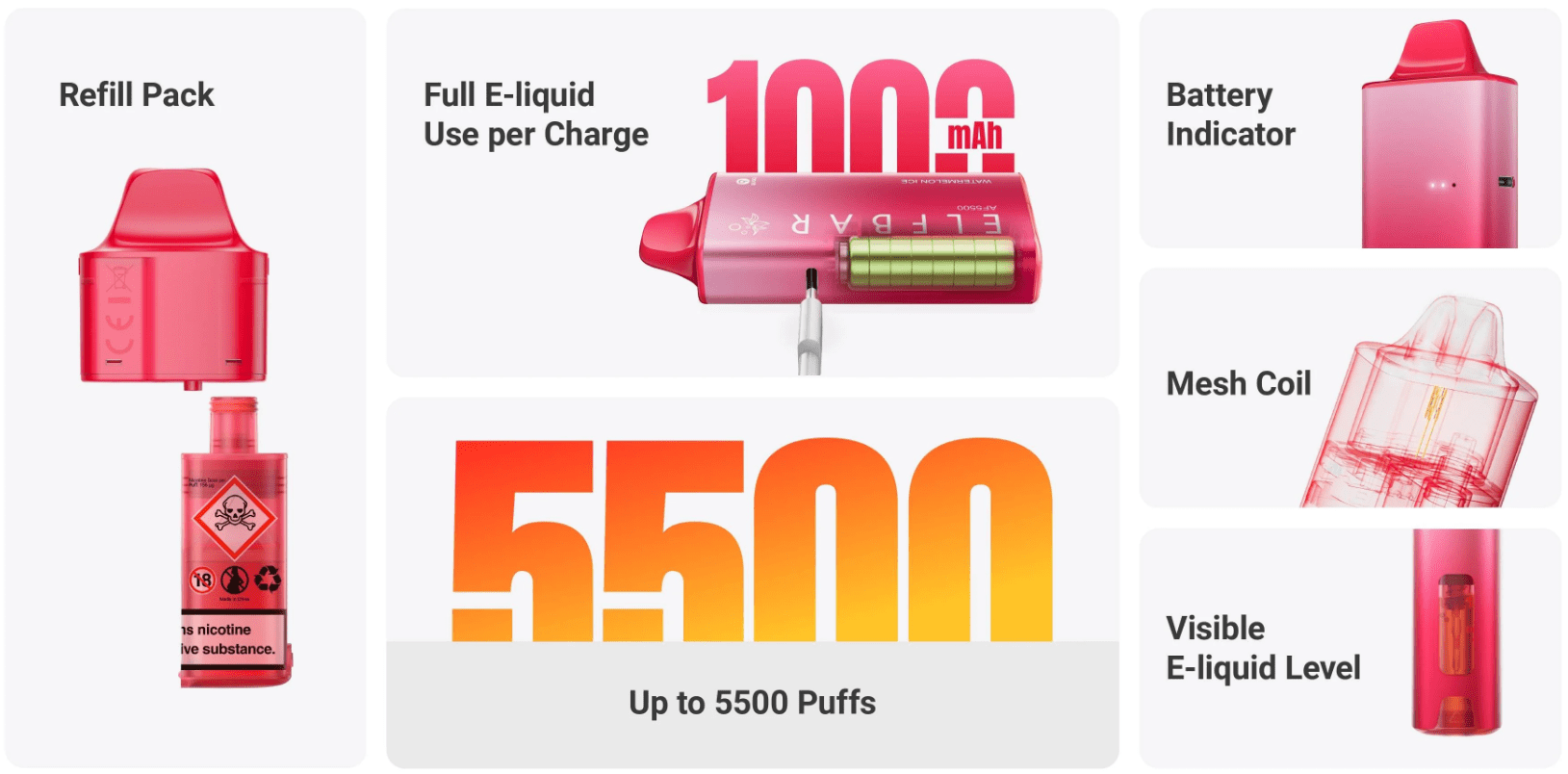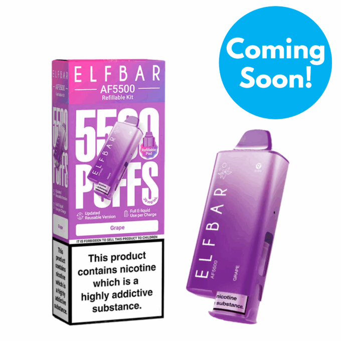 The Elf Bar AF5500 offers up to 5500 puffs (approx.), which puts it in the big puff category of vapes. That means it’s designed to last significantly longer than a standard 600 puff device, making it ideal for people who don’t want to constantly refill or replace the pods.