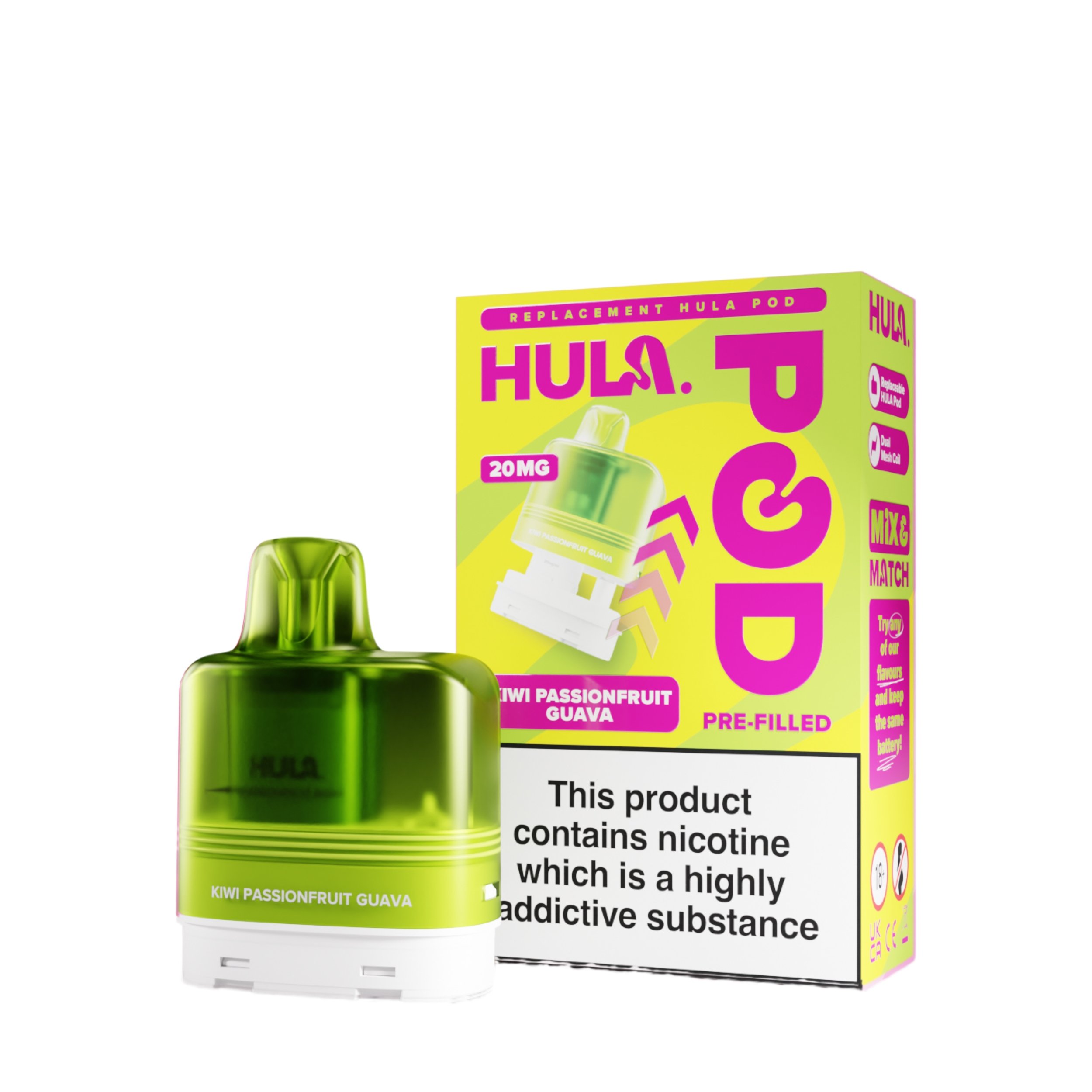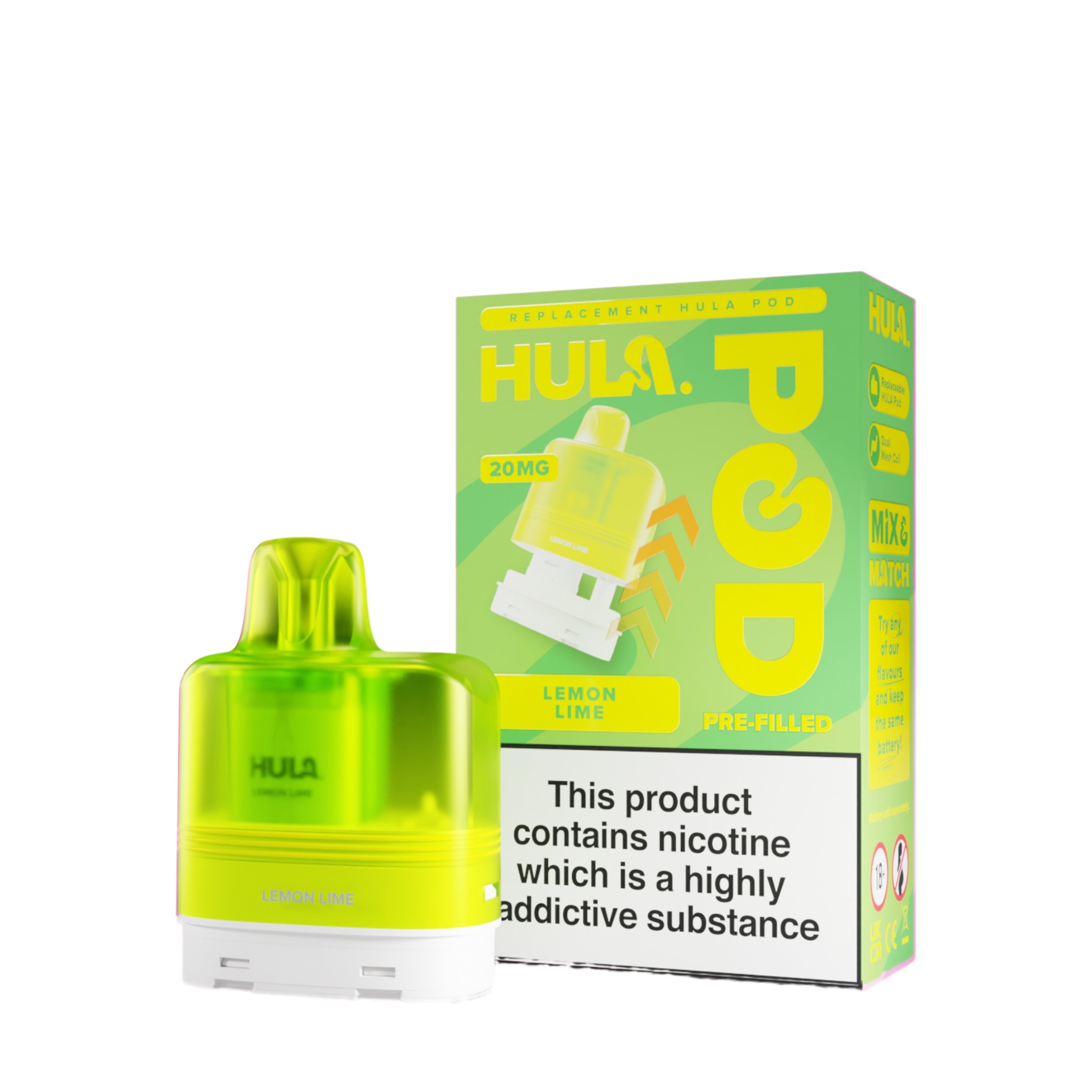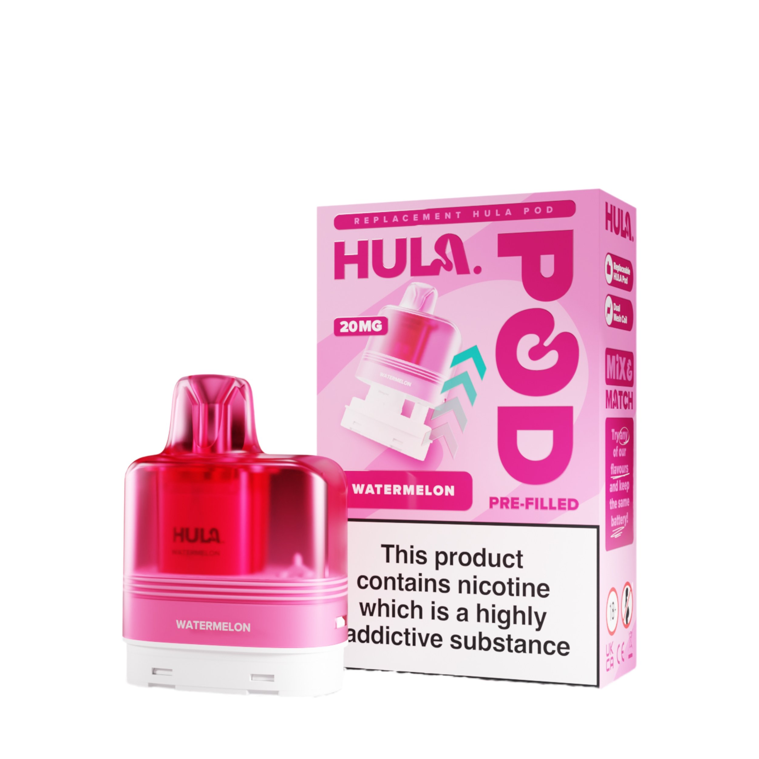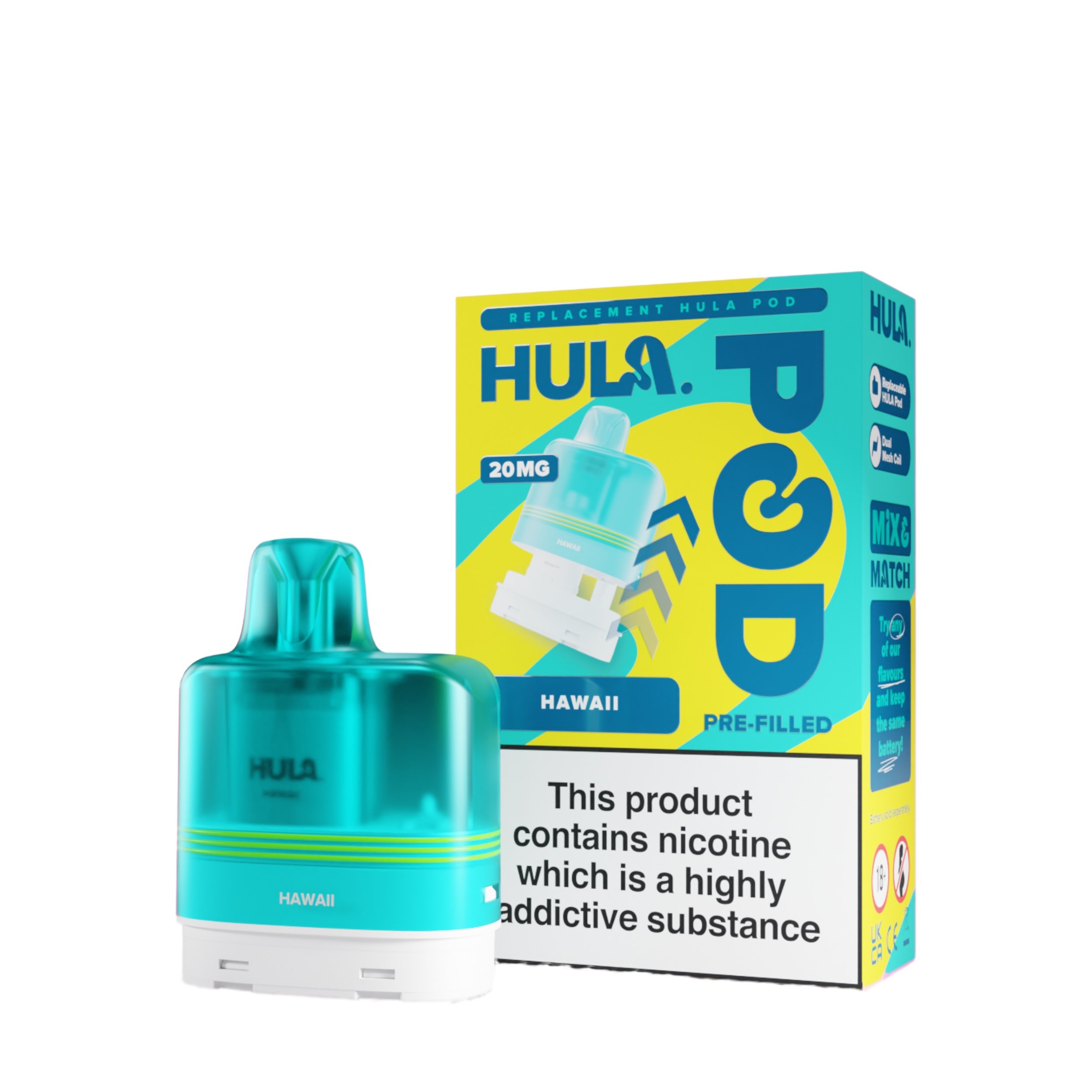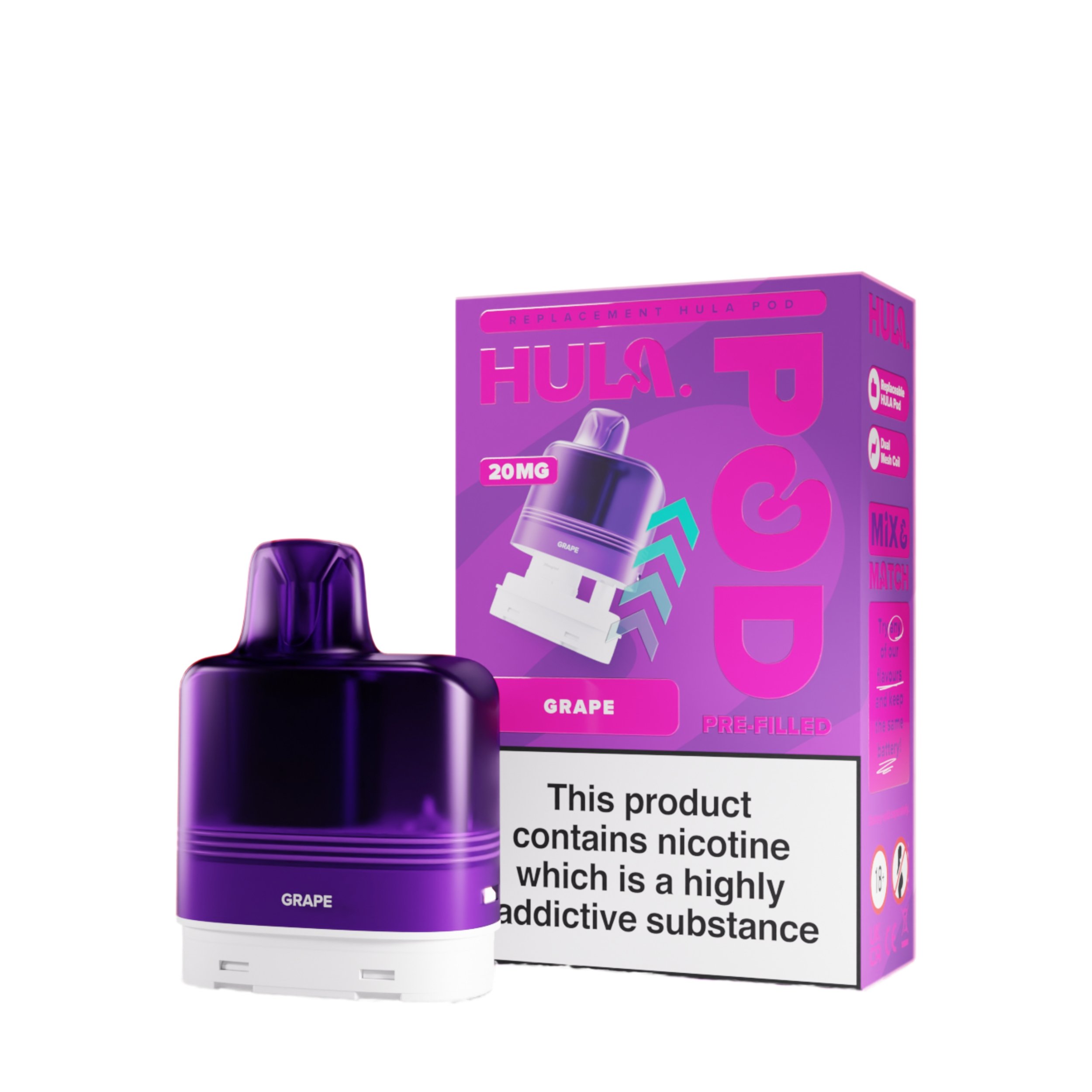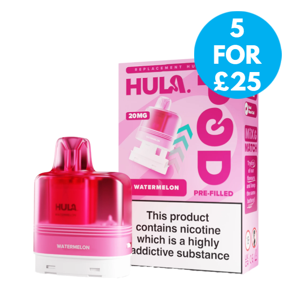 The liquid inside the Hula replacement pods is a 20mg high strength nicotine salt e-liquid that has it’s flavour amplified by the integrated dual mesh coil. Nic salt e-liquids have been designed to quickly relieve cravings and are the perfect formulation for those moving away from cigarettes and onto vaping. You get 12ml total of this nic salt e-liquid, 2ml prefilled into the main pod with a 10ml refill tank that auto feeds into the 2ml tank as it starts to run low, completely removing the need for any messy refills!
