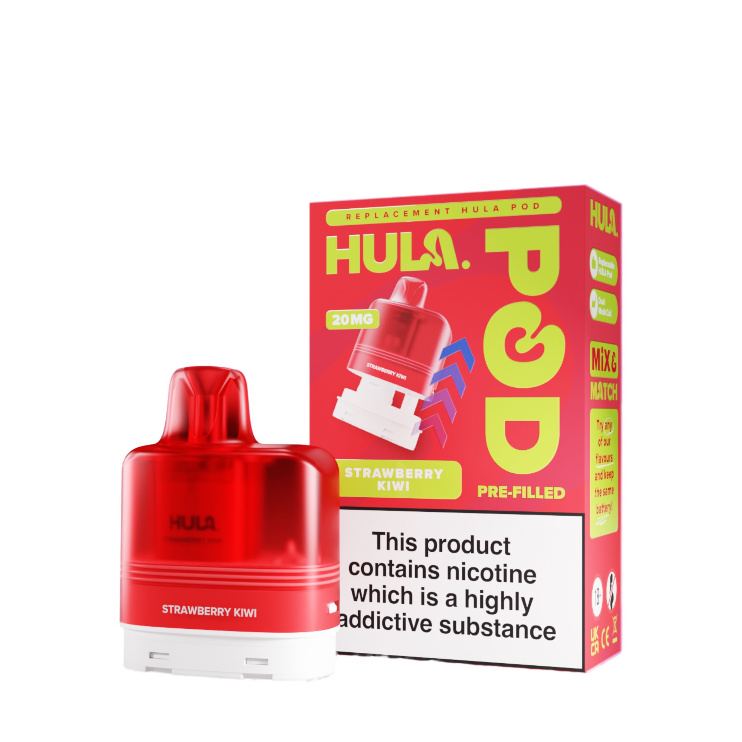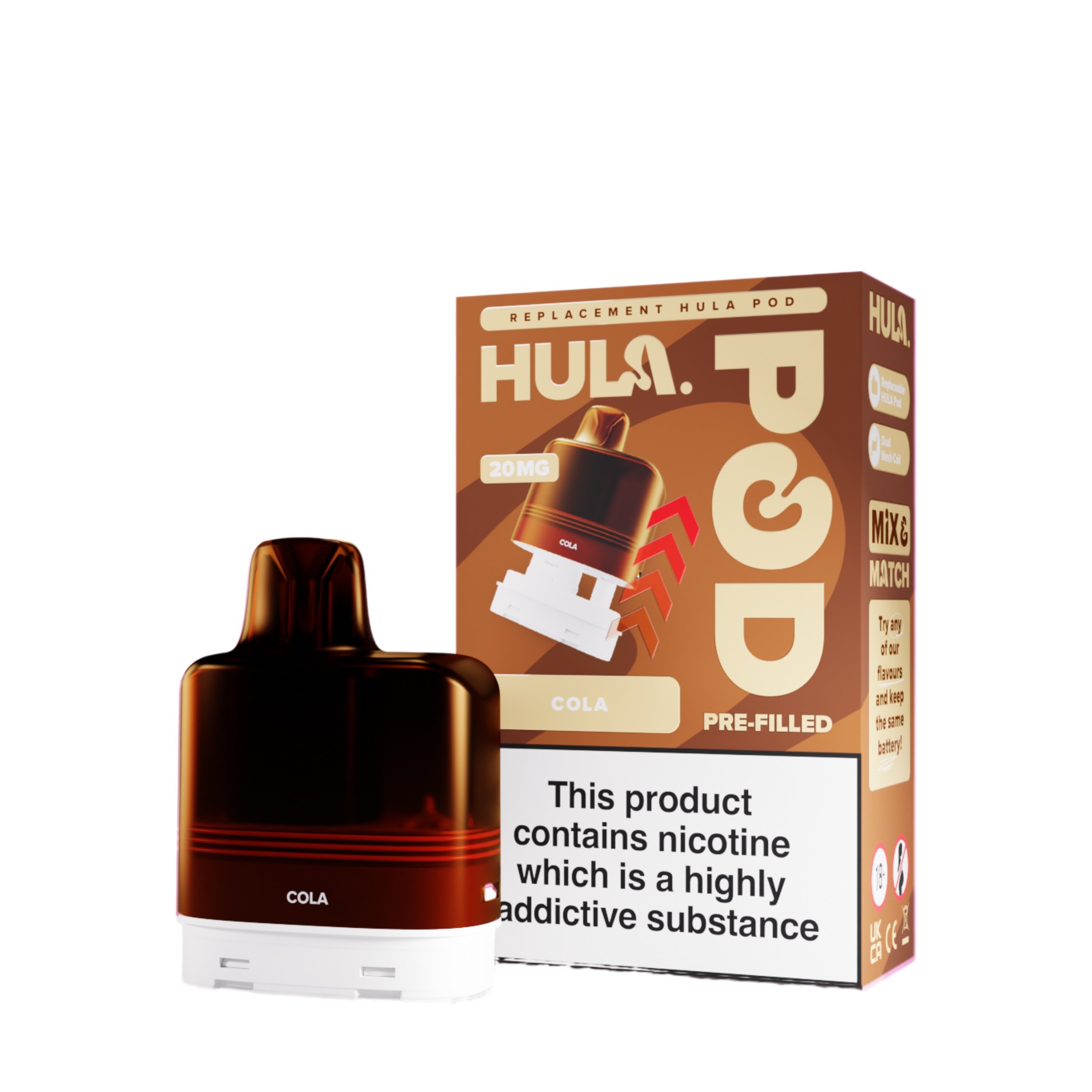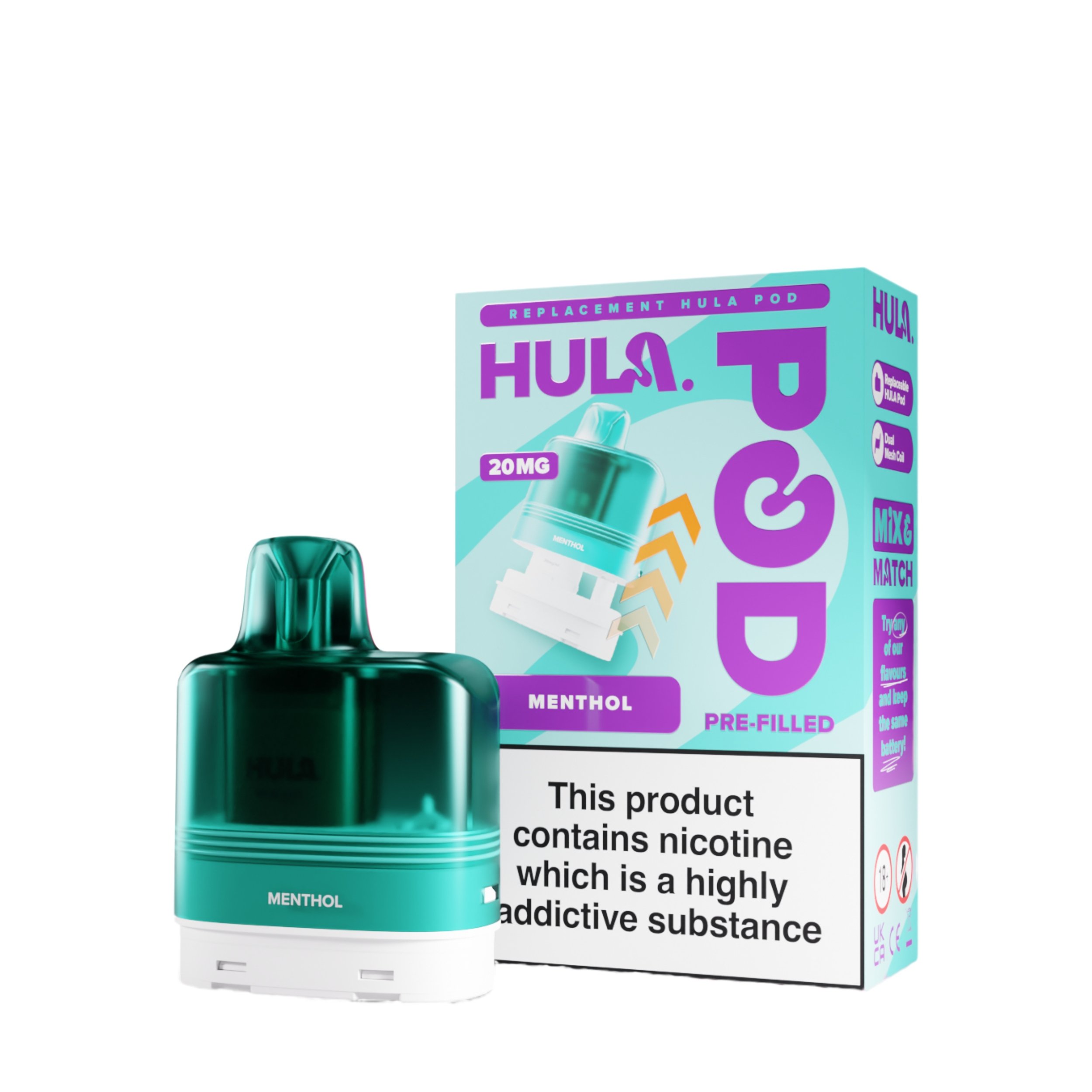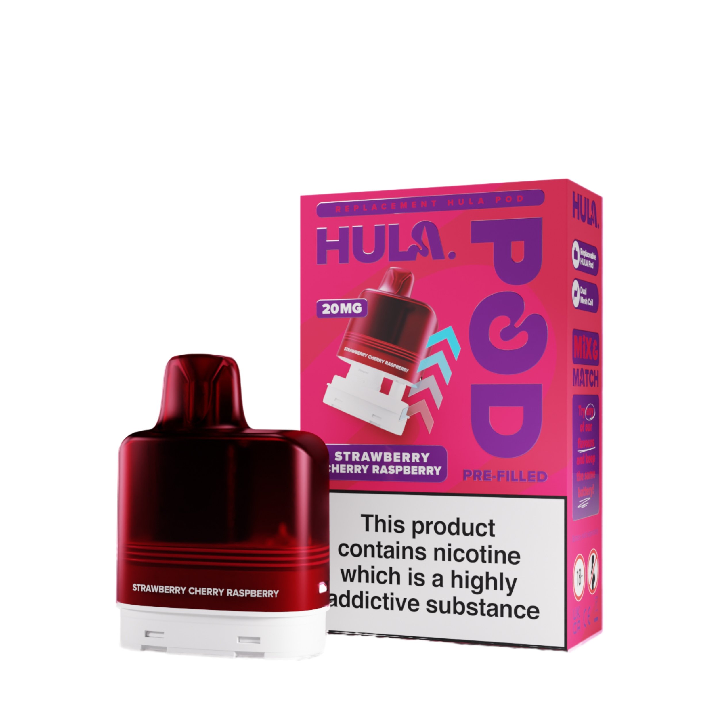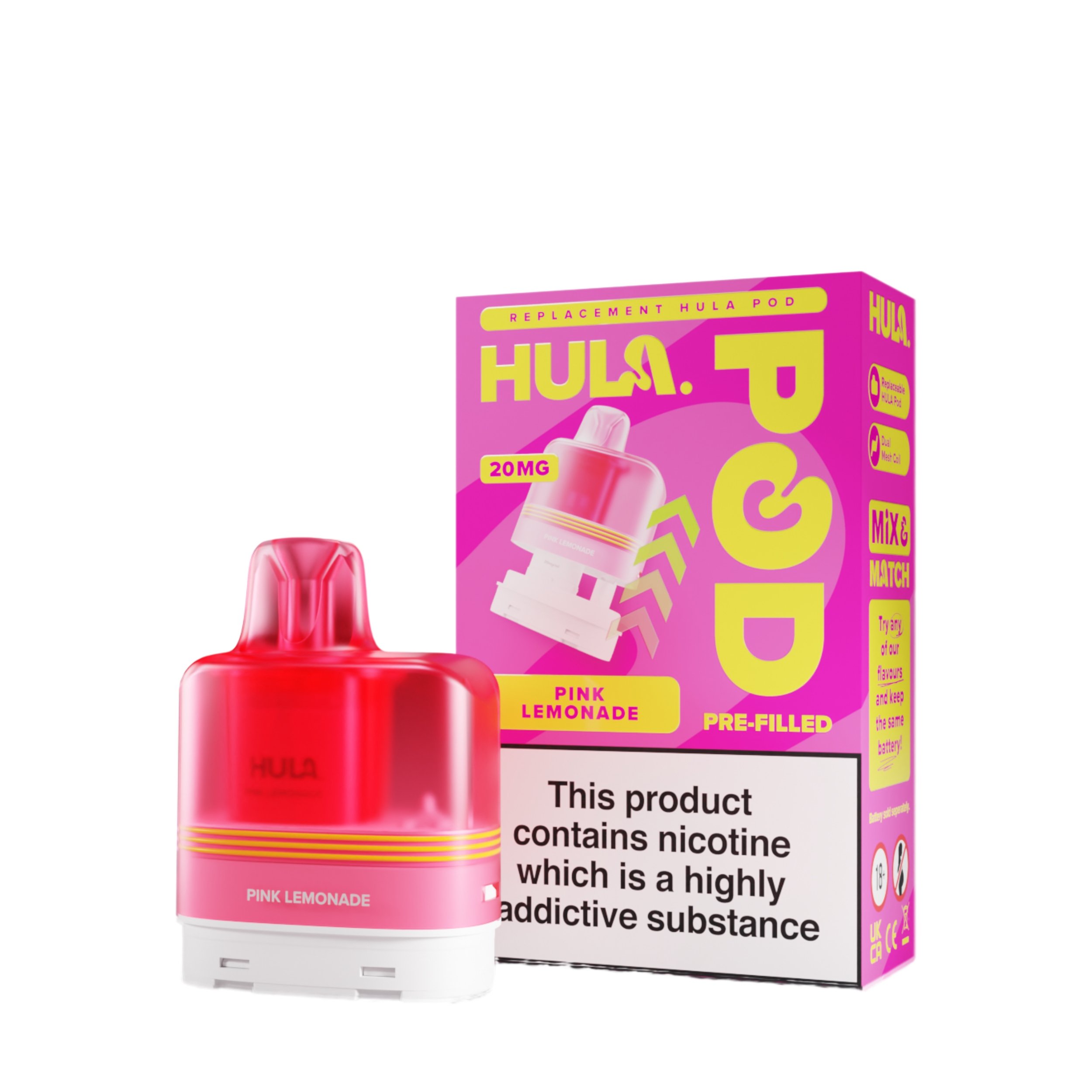 The liquid inside the Hula replacement pods is a 20mg high strength nicotine salt e-liquid that has it’s flavour amplified by the integrated dual mesh coil. Nic salt e-liquids have been designed to quickly relieve cravings and are the perfect formulation for those moving away from cigarettes and onto vaping. You get 12ml total of this nic salt e-liquid, 2ml prefilled into the main pod with a 10ml refill tank that auto feeds into the 2ml tank as it starts to run low, completely removing the need for any messy refills!