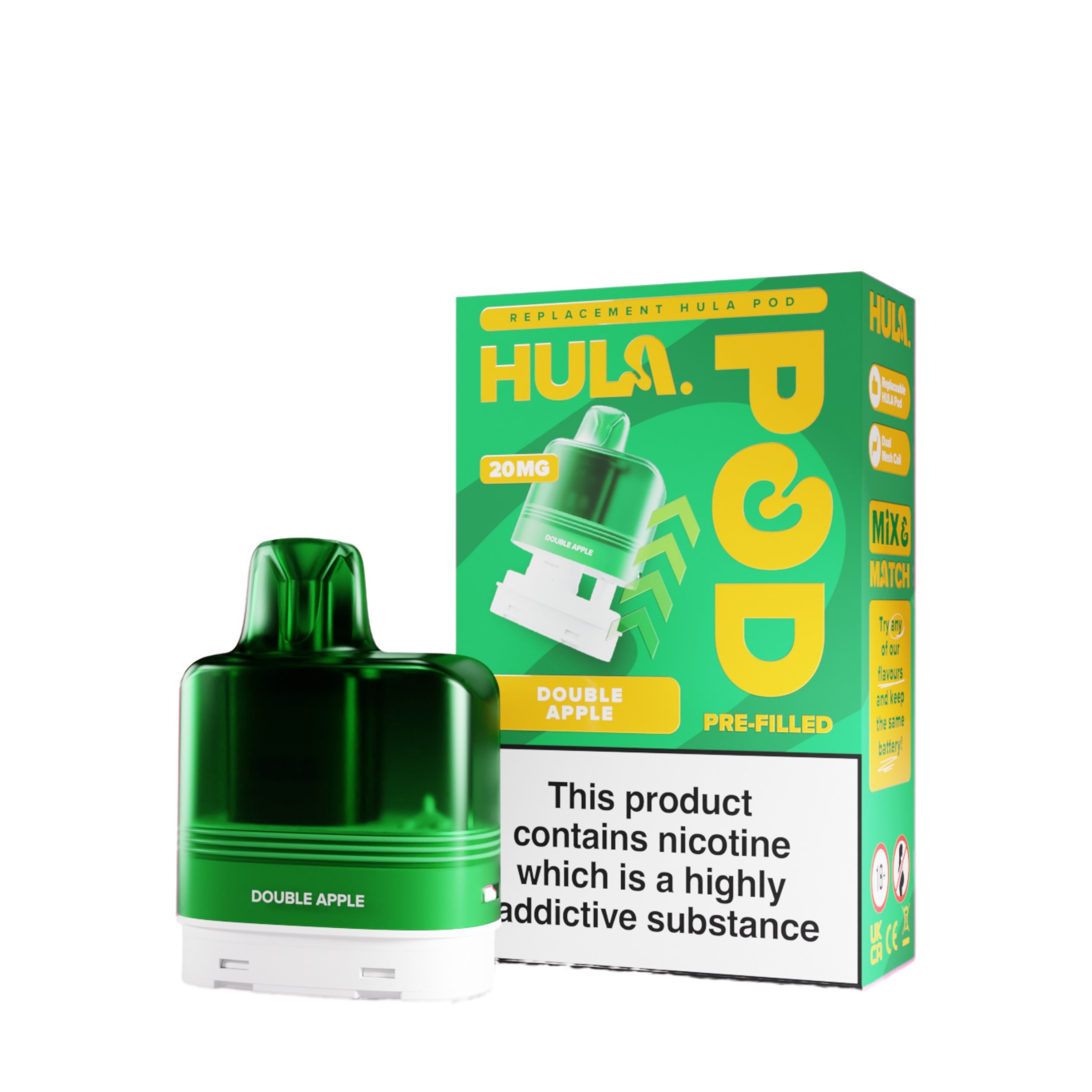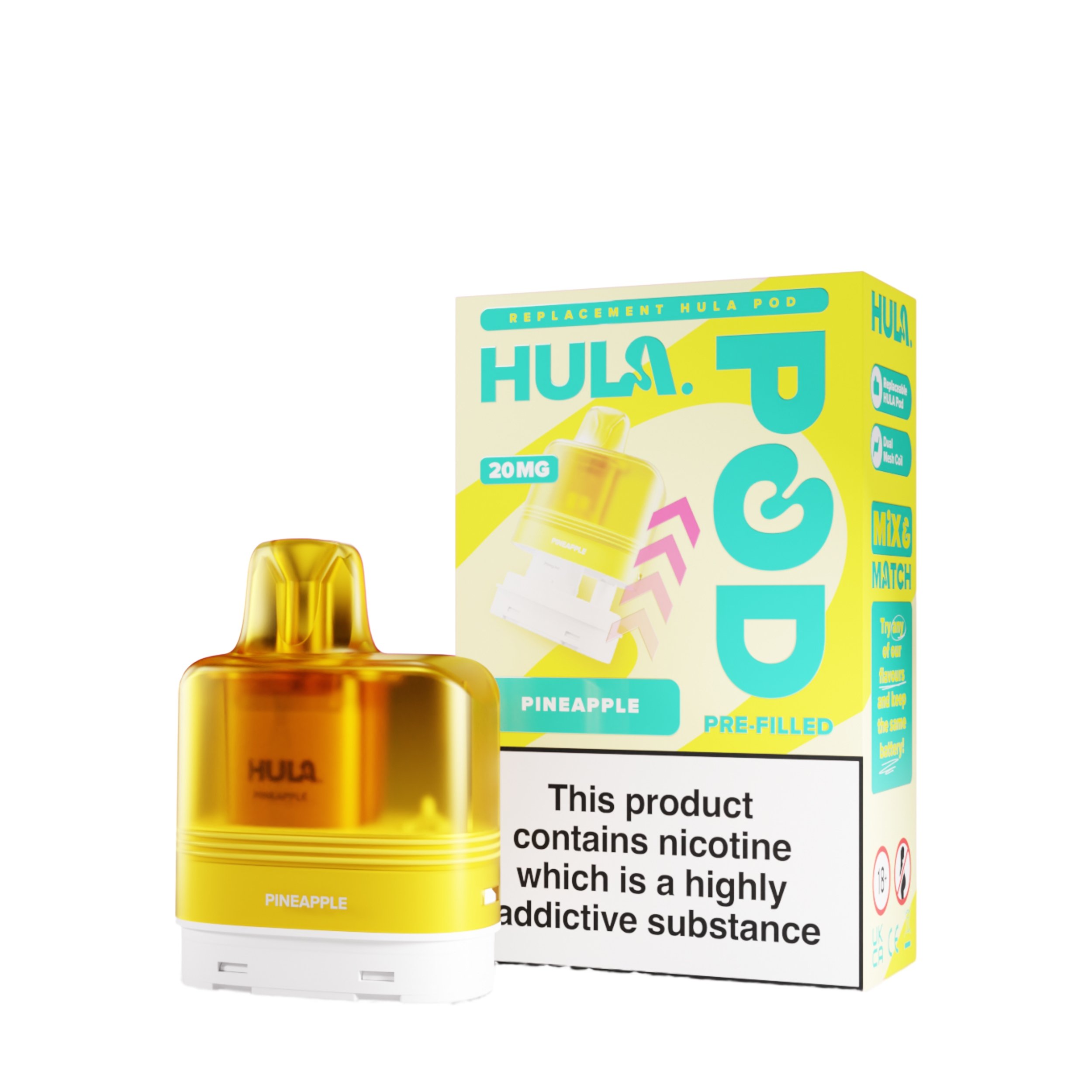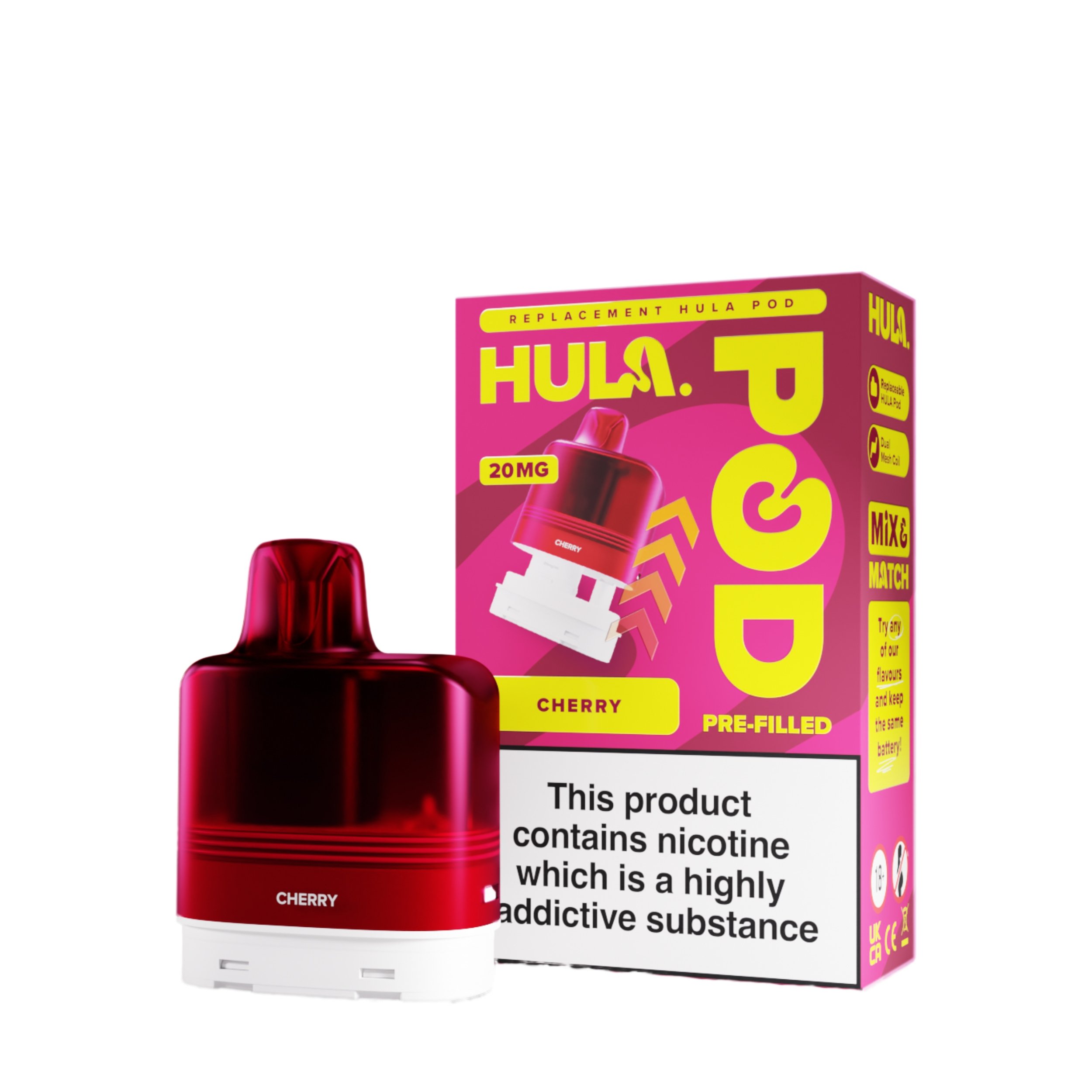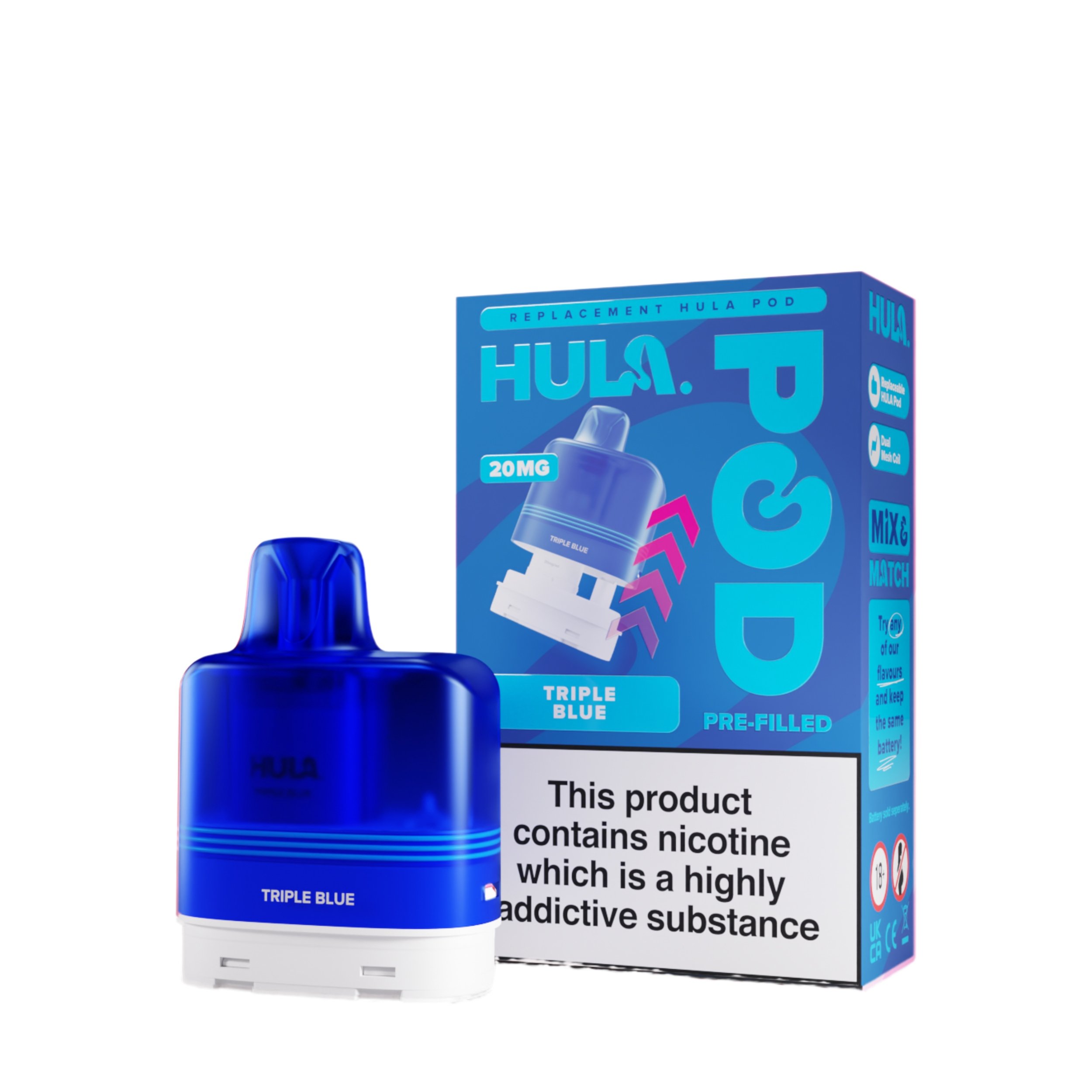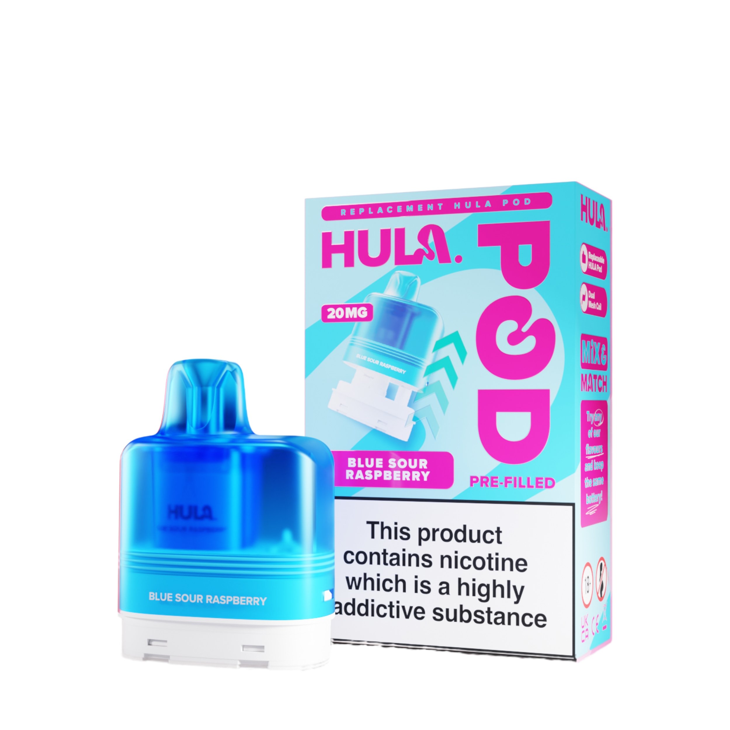 The liquid inside the Hula replacement pods is a 20mg high strength nicotine salt e-liquid that has it’s flavour amplified by the integrated dual mesh coil. Nic salt e-liquids have been designed to quickly relieve cravings and are the perfect formulation for those moving away from cigarettes and onto vaping. You get 12ml total of this nic salt e-liquid, 2ml prefilled into the main pod with a 10ml refill tank that auto feeds into the 2ml tank as it starts to run low, completely removing the need for any messy refills!