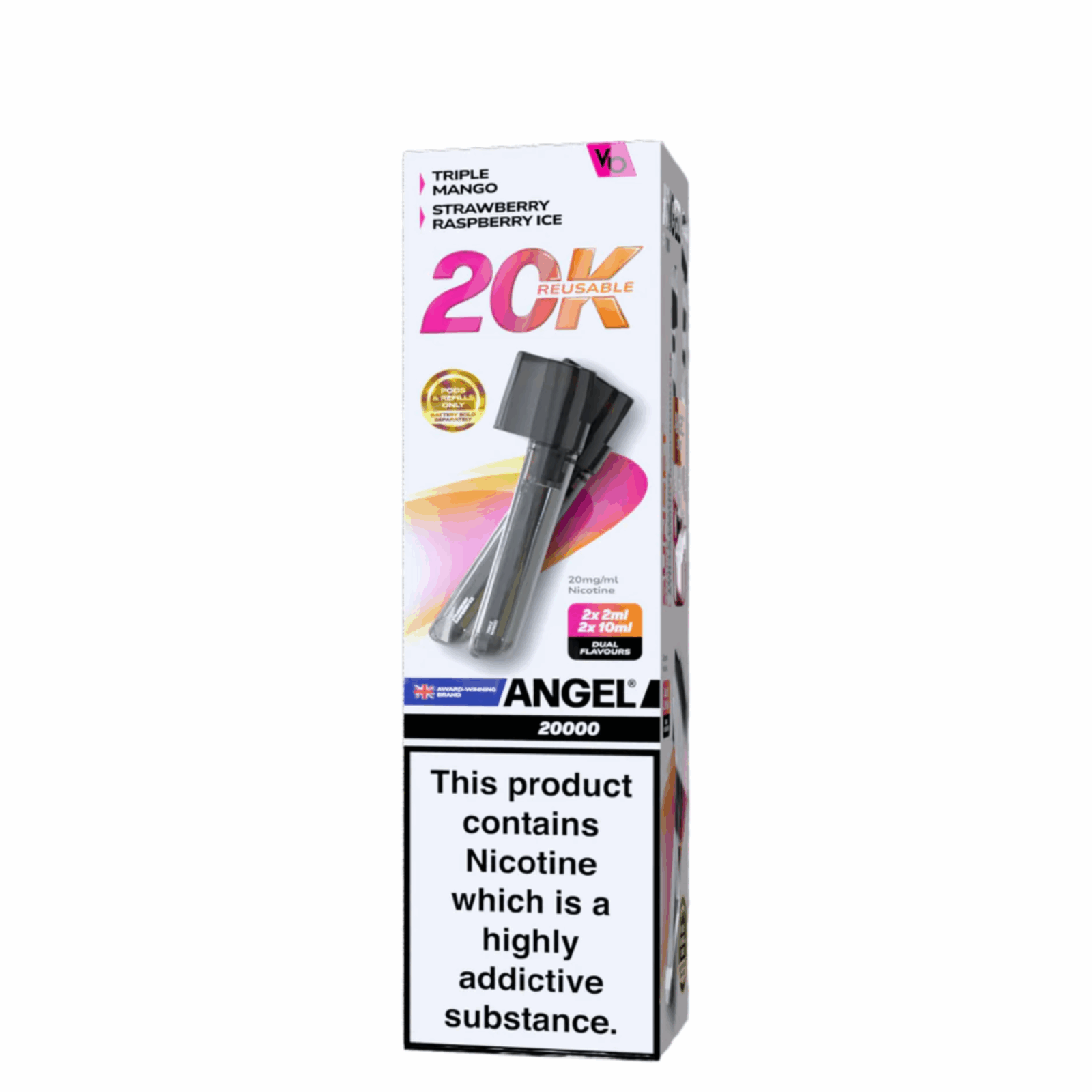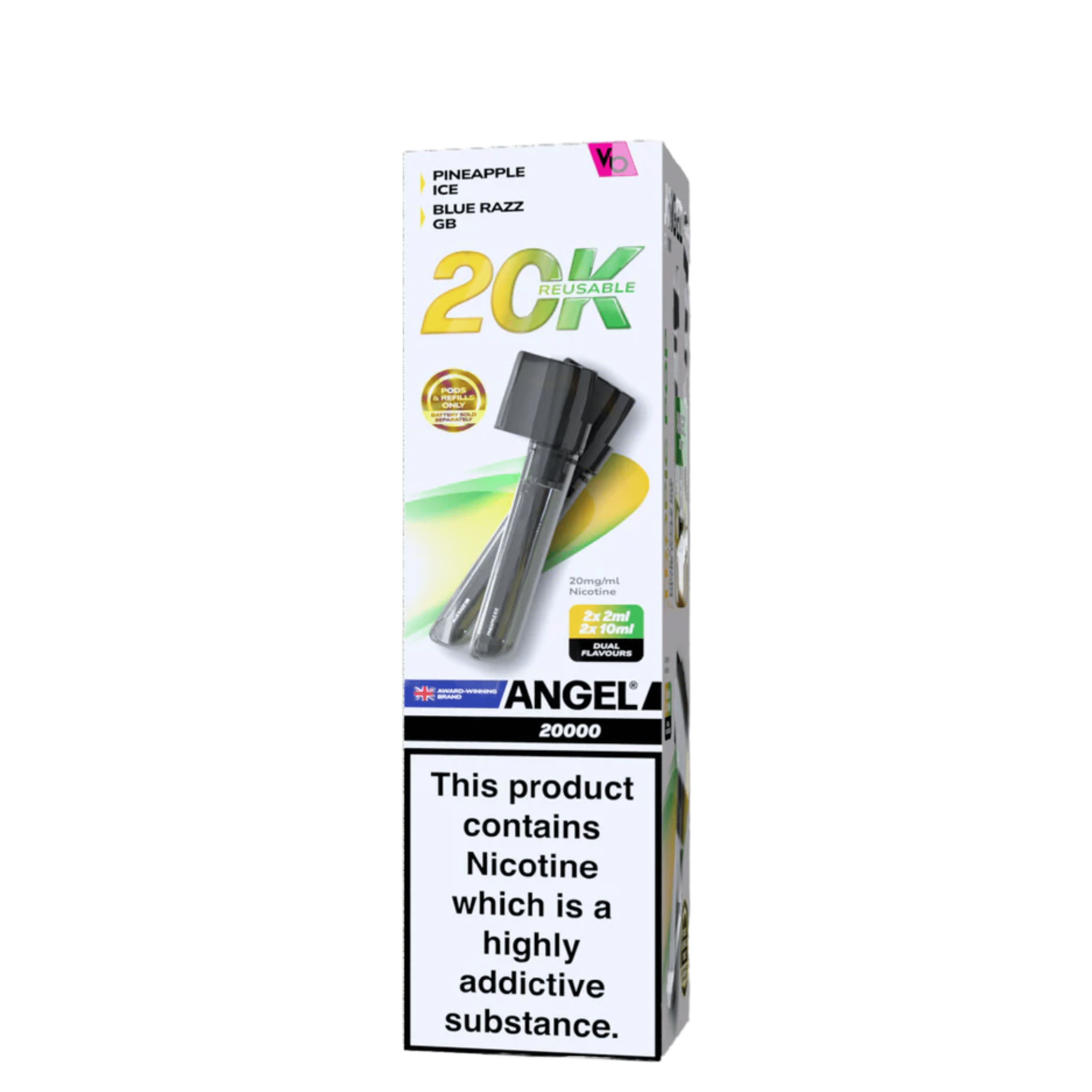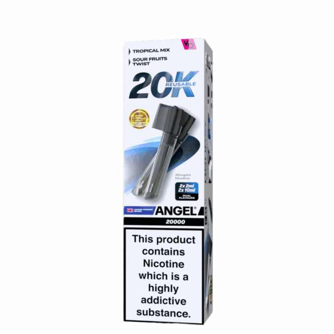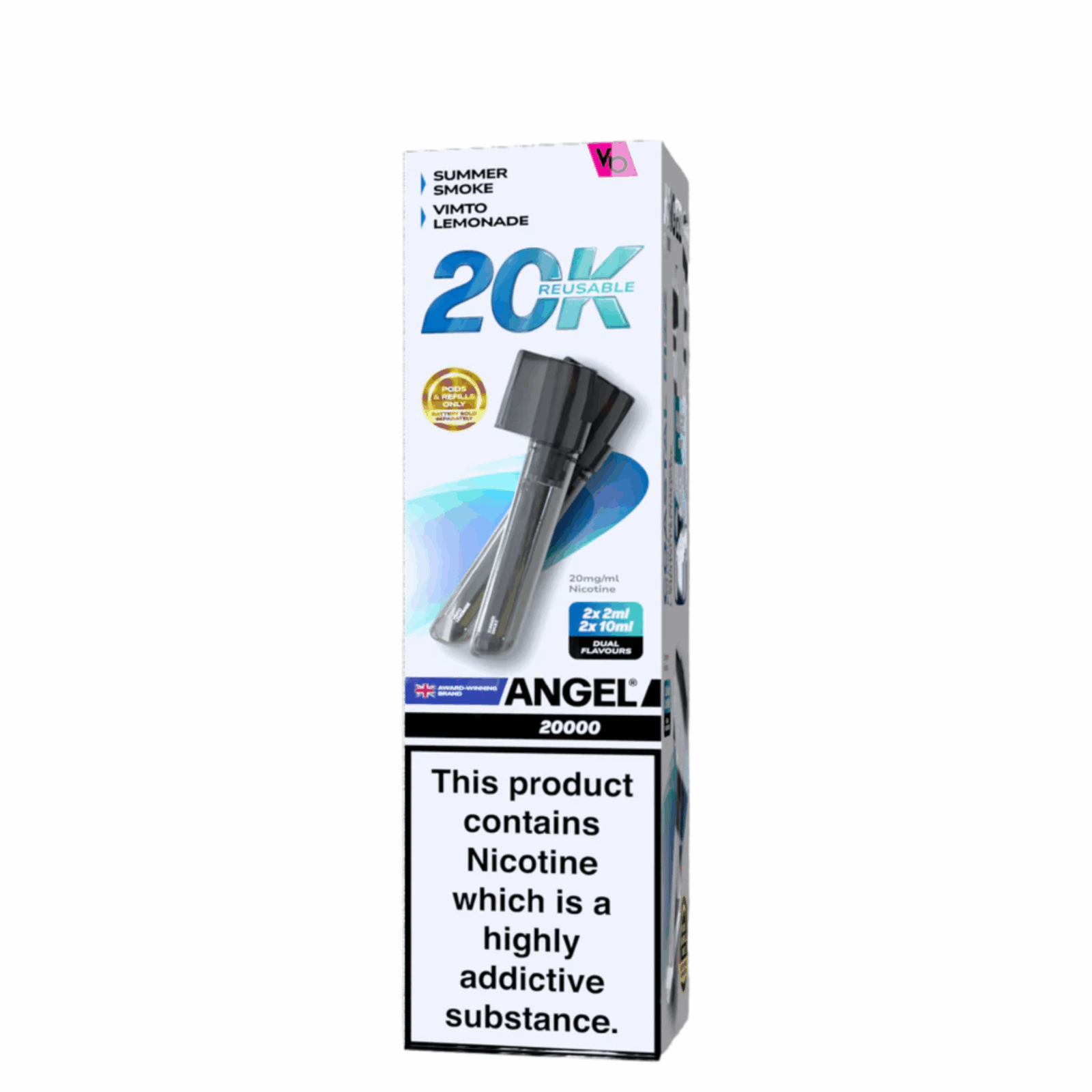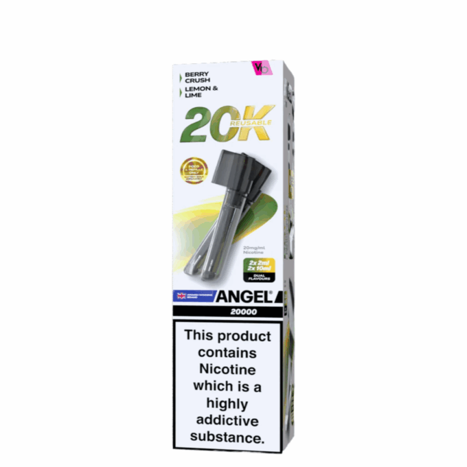 Following the release and success of the Angel 2400, Vapes Bars have now released the Angel 20k big puff vape kit that can deliver up to a whopping 20K puffs (Approx.)! It features a dual flavour system that you can easily switch between by twisting the mouthpiece so that you can enjoy 2 different flavours at the same time without any fuss or messy refills. There are 2 x 2ml pods that are already prefilled with Vapes Bars classic Angel nic salt e-liquid in a 20mg strength, and you also have 2 x 10ml refilling containers for when those 2ml tanks run low. To refill, simply hold the device upside down for 10 seconds and away you go!