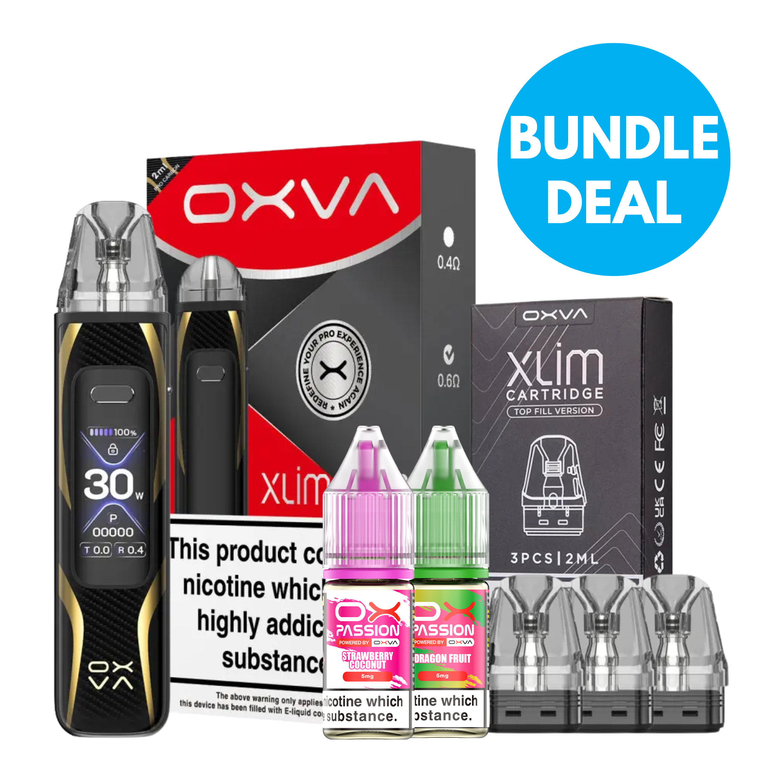 This is a bundle including 1 x Oxva Xlim Pro 3 Pod Kit, 1 x Oxva Xlim V3 Pod, and 2 x 5mg (0.5%) Oxva Ox Passion Nic Salts, all for just £37.99!