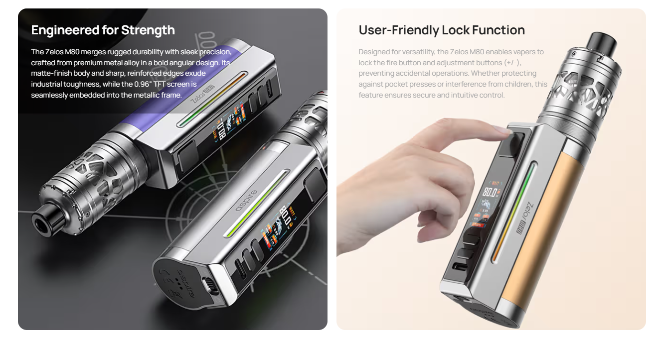 The Aspire Zelos M80 is a cutting egdge vape kit built for convenience, reliability, and longevity. From airflow to brightness settings, this device gives you the freedom to personalise nearly every aspect of your vaping experience, making it both powerful and user friendly.
