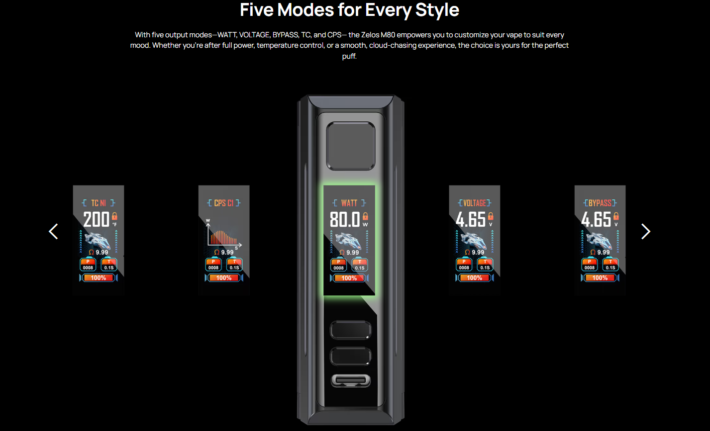 Equipped with five output modes, the Aspire Zelos M80 is designed with user friendliness in mind, giving vapers full control to customise their experience and find what best suits their style or mood. By tailoring the settings, you can expect the perfect puff every time, ensuring the best possible vaping experience.