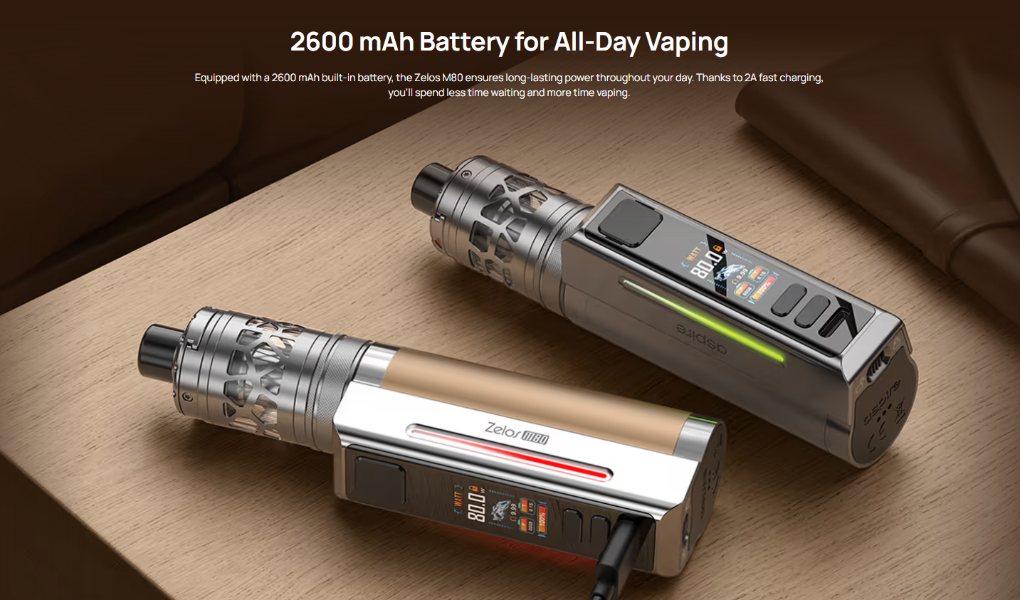 The Aspire Zelos M80 is powered by a robust 2600mAh built-in battery, designed for longevity so you can receive multiple days of use before needing a recharge. And if the battery does run low, it can be quickly recharged with a USB Type-C cable, meaning less waiting around and more time vaping.