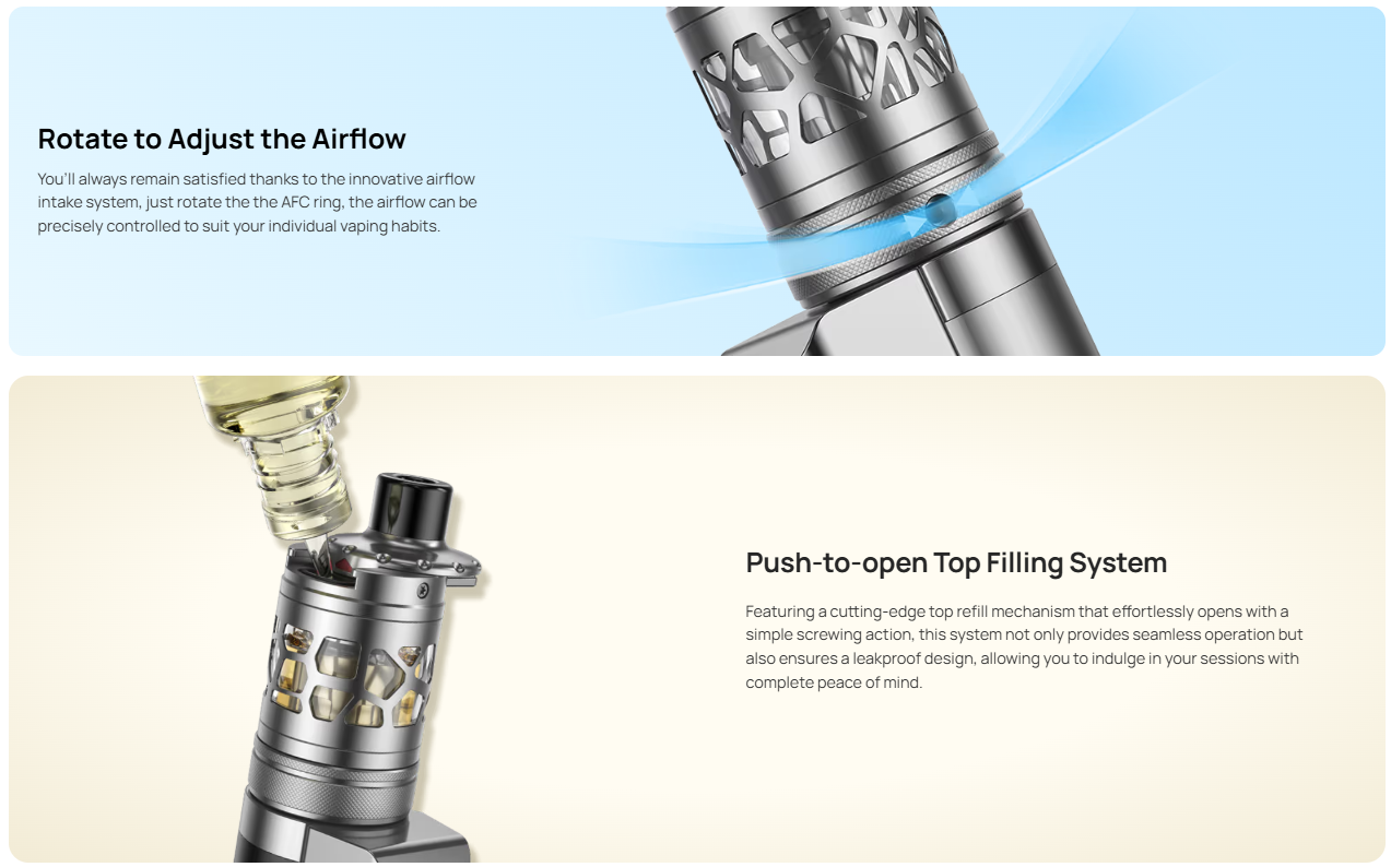 At the heart of the Zelos M80 is a 0.96 TFT display screen, paired with two LED indicators offering 6 lighting effects and 8 adjustable brightness levels. This extra layer of personalisation lets you tailor the device to your liking. The kit also features an adjustable rotating AFC ring, allowing you to control the airflow to match your vaping habits.