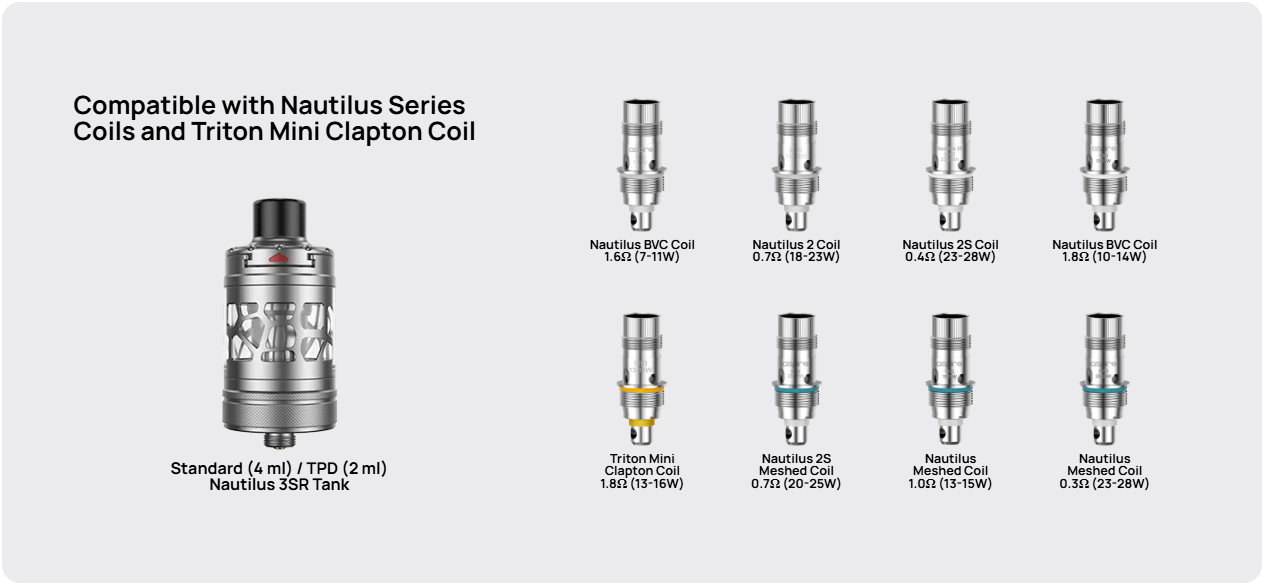 The Aspire Zelos M80 is compatible with Aspire Nautilus BVC Coils, Aspire Nautilus 2S Coil 0.4Ohms, and Aspire Nautilus 2S Mesh Coil 0.7Ohms. As well as being compatible with other accessories such as the Aspire Nautilus 3 Tank, the Aspire Nautilus 3 Replacement Pyrex Glass Tube 2ml, and the Aspire Nautilus 3 Replacement Pyrex Glass Tube 4ml.