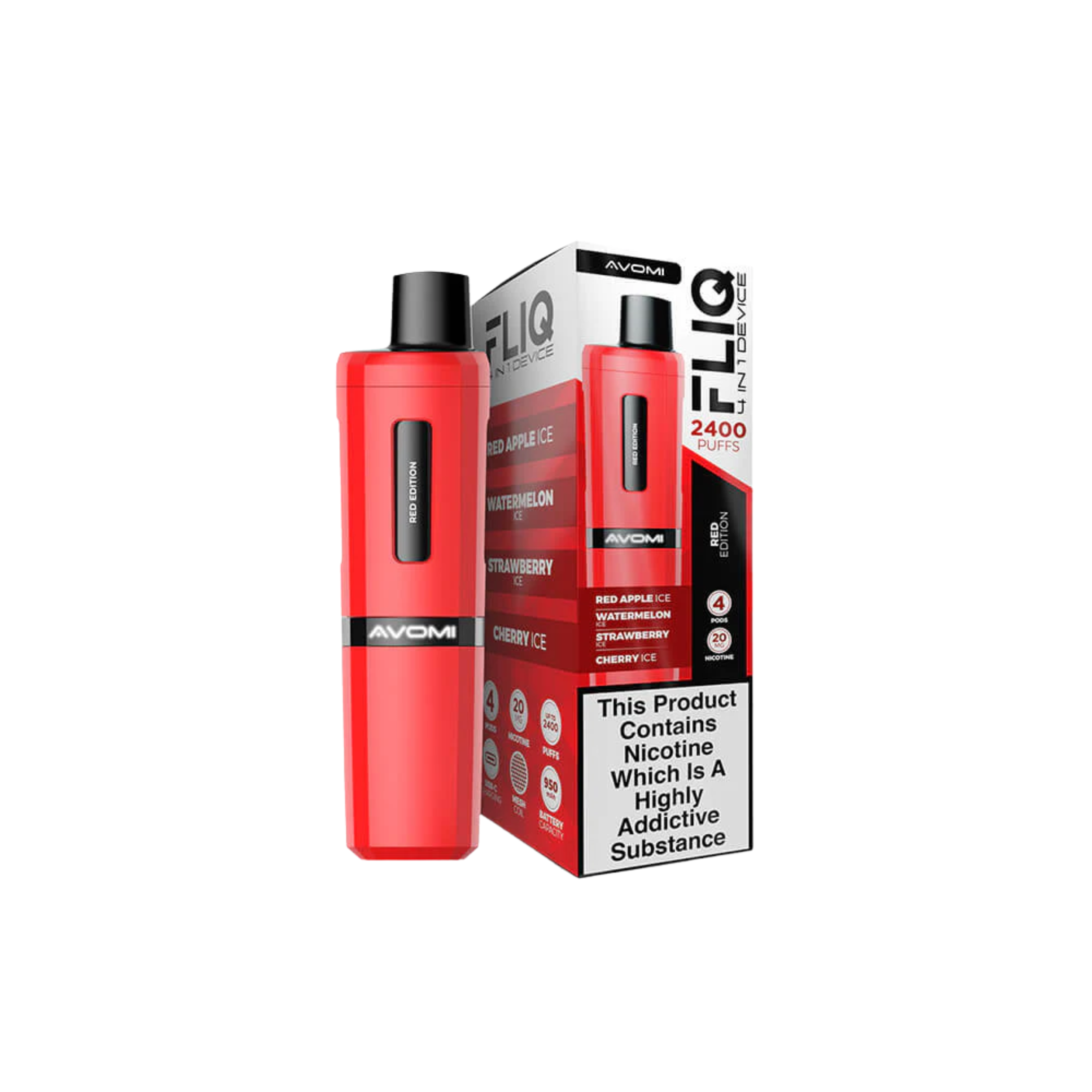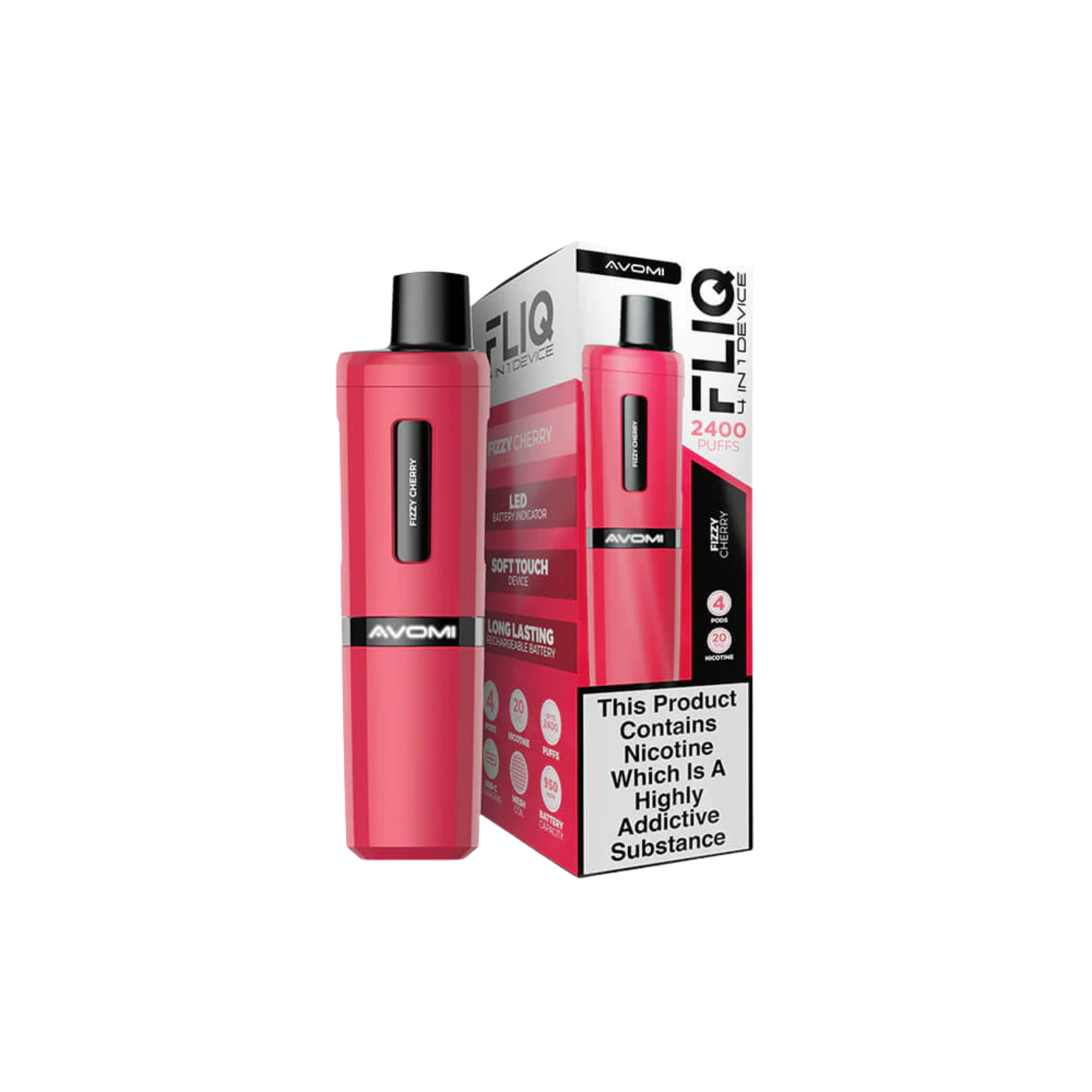 Avomi Fliq vape kit four 2ml pods, 950mAh built-in battery, USB-C charging, LED indicator
