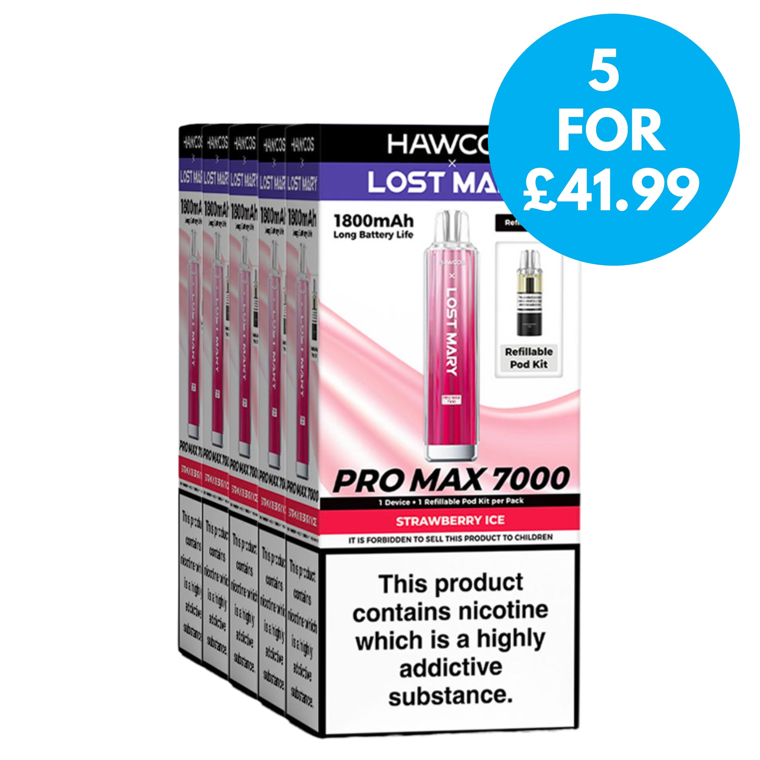 This is a multipack deal which includes 5 boxes of the Hawcos x Lost Mary Pro Max 7000 Vape Kit, all for just £41.99.