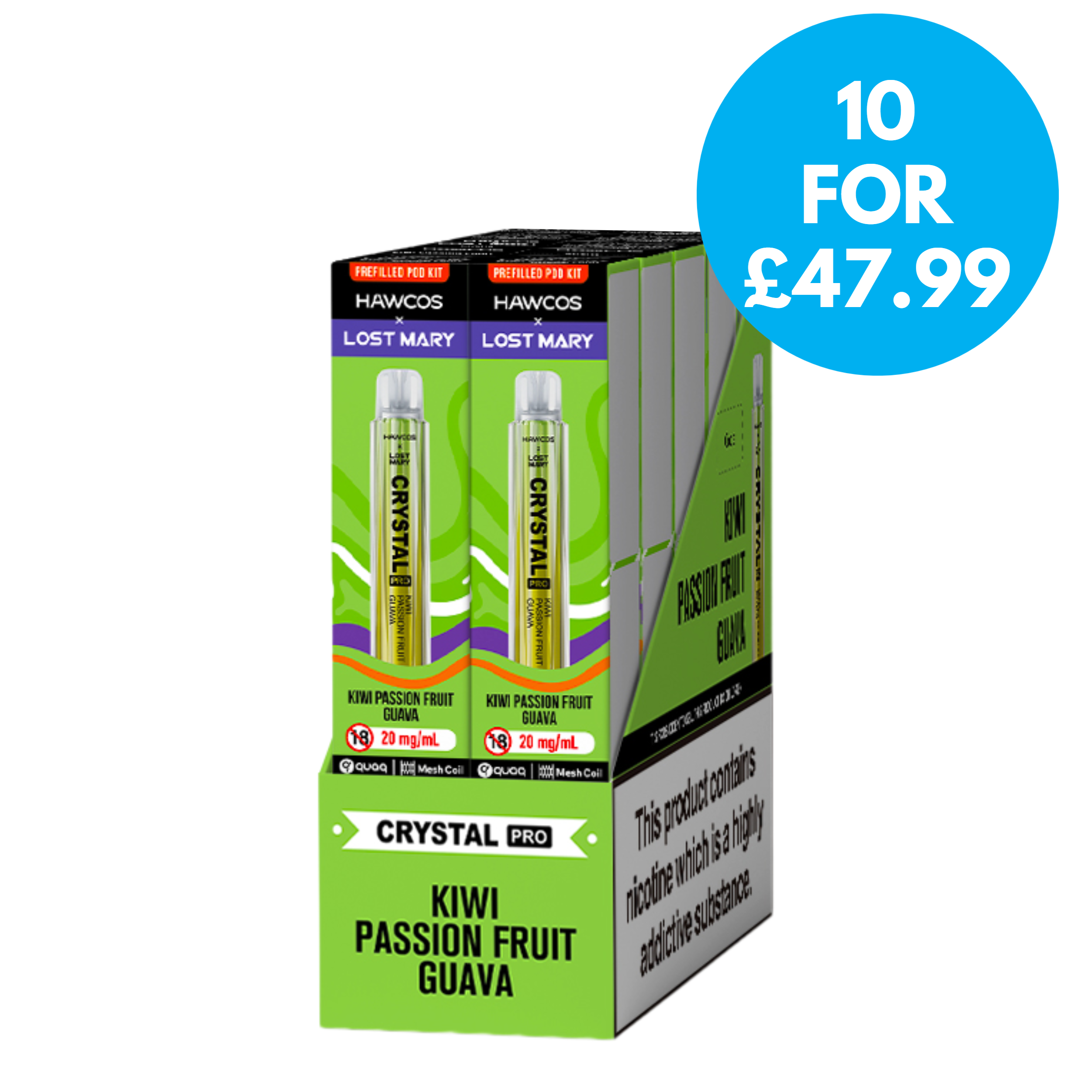This is a multipack deal which includes 10 boxes of Hawcos x Lost Mary Crystal Pro Prefilled Vape Kit, all for just £47.99.