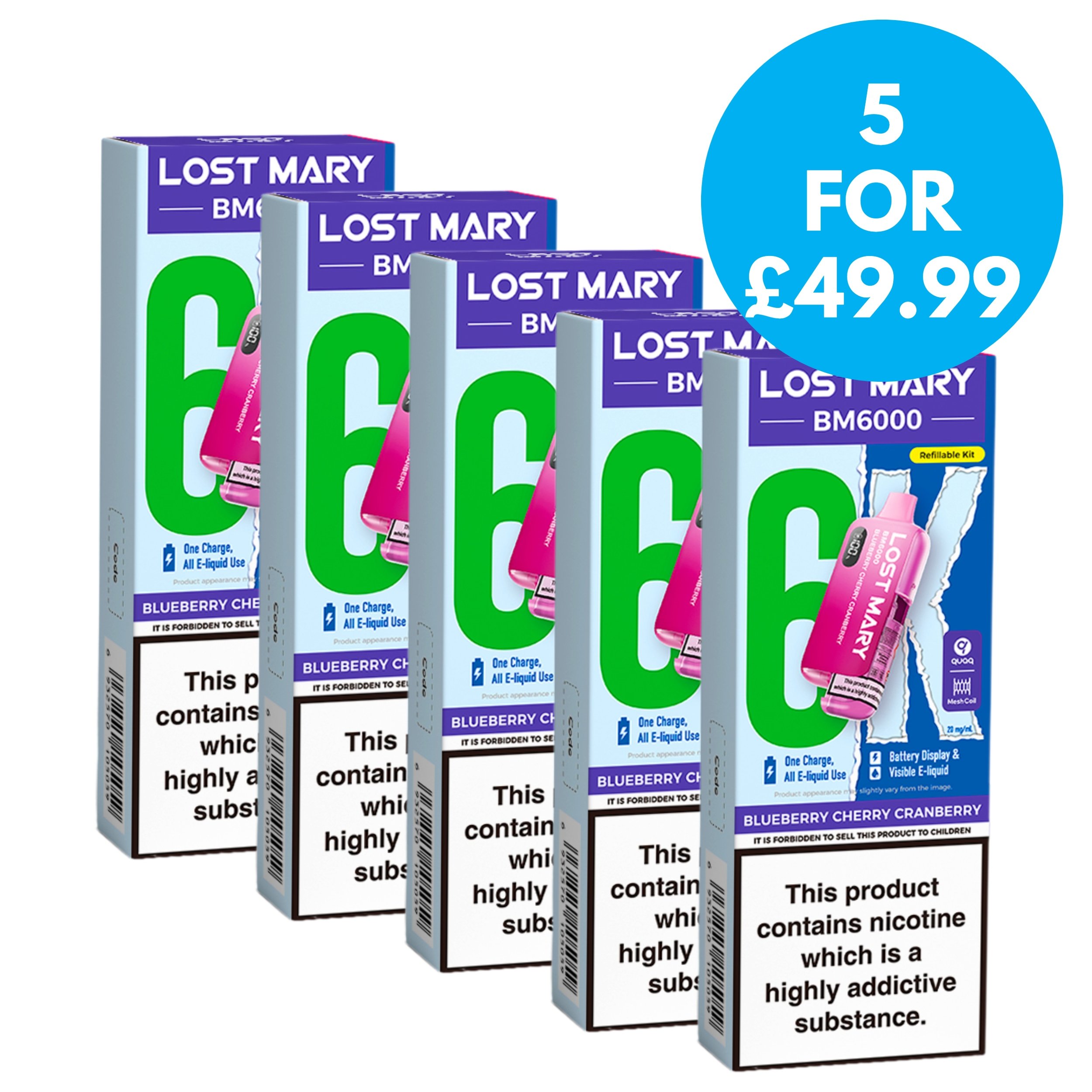 This is a multipack deal which includes 5 boxes of the Lost Mary BM6000 Prefilled Vape Kit, all for just £49.99.