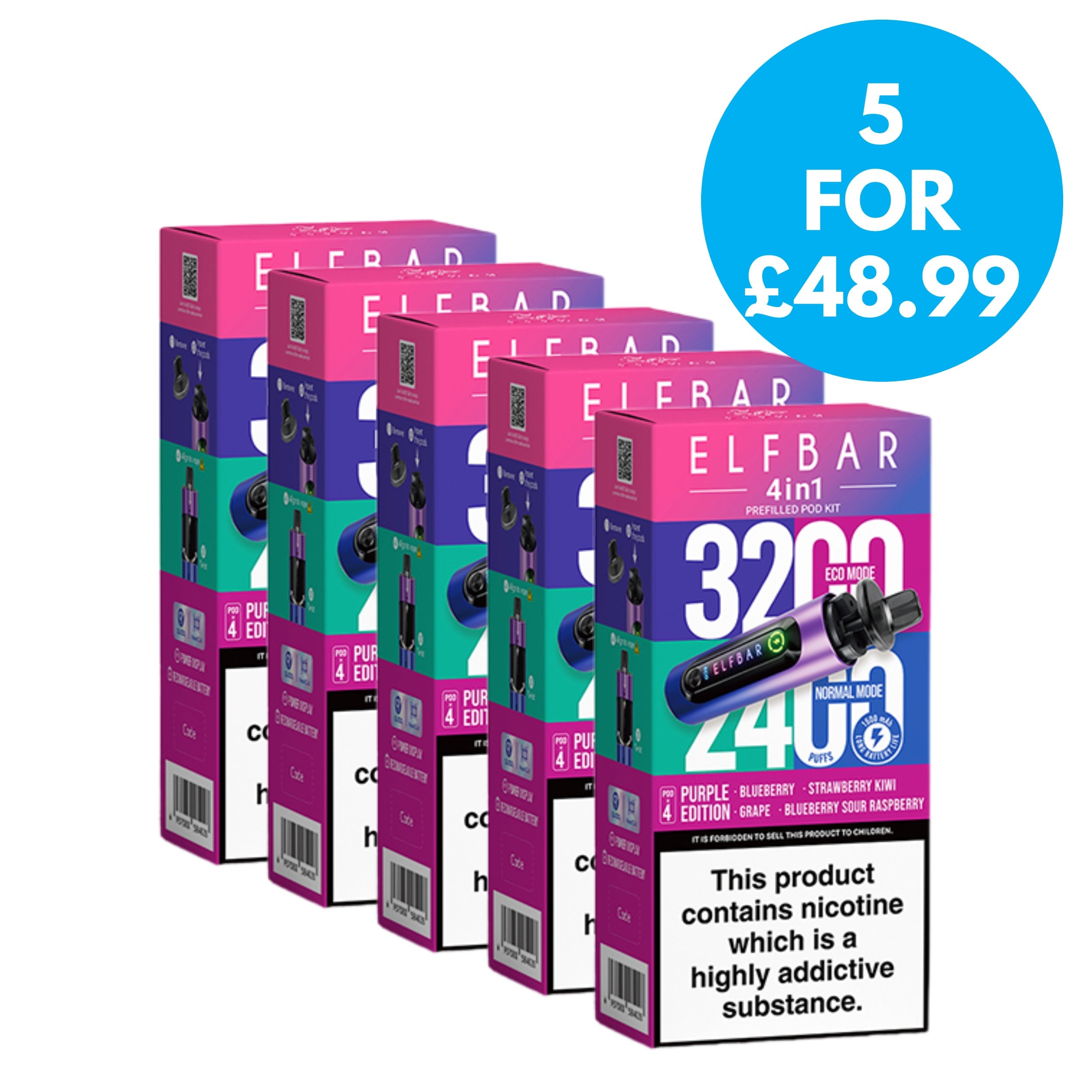 This is a multipack deal which includes 5 boxes of the Elf Bar 4 in 1 Vape Kit, for only £48.99.