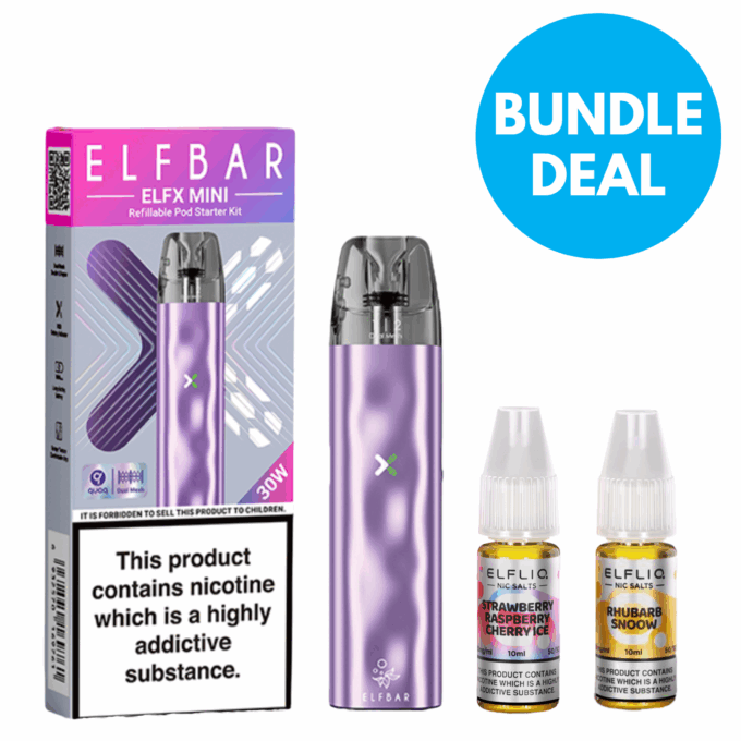 With this bundle, you’ll get 1 x Elf Bar Elfx Mini Vape Kit with a 0.6Ohm pod along with 2 x 10ml bottles of 20mg Elfliq Nic Salt. Both the kit and e-liquids are made by Elf Bar, the same trusted brand behind the hugely popular disposable vapes. All this for just £8.99!