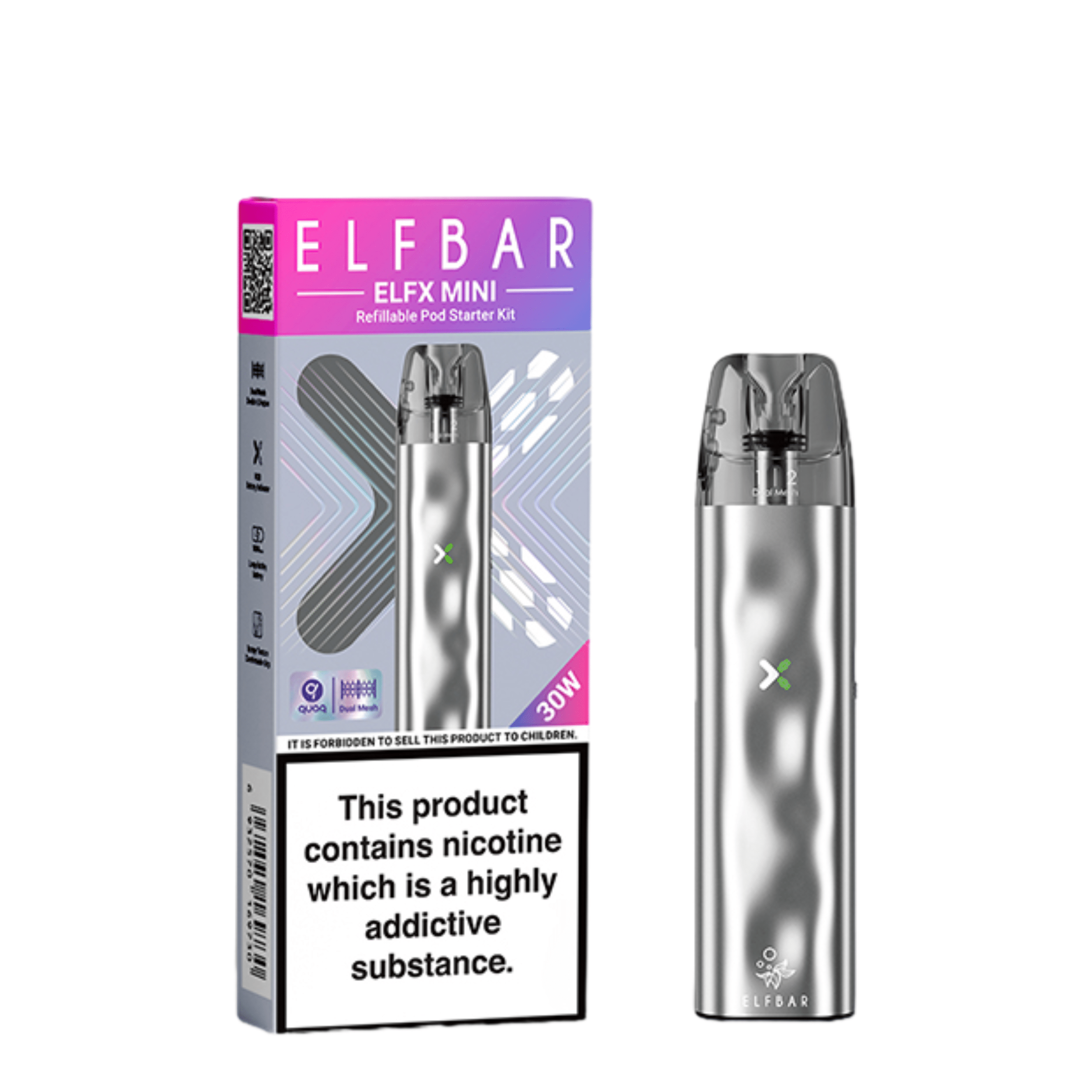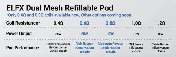 The Elf Bar Elfx Mini is compatible with the Elf Bar Elfx Replacement Pods. This bundle only includes a 0.6Ohm pod.