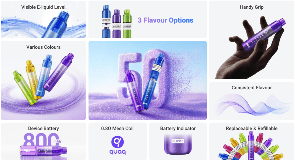Preloaded with Elf Bar’s top rated Elfliq e-liquid, the Plus 50 offers a premium vaping experience. Whether you’re a beginner or a seasoned vaper, this kit is an excellent choice for anyone seeking simplicity, flavour, and satisfaction.