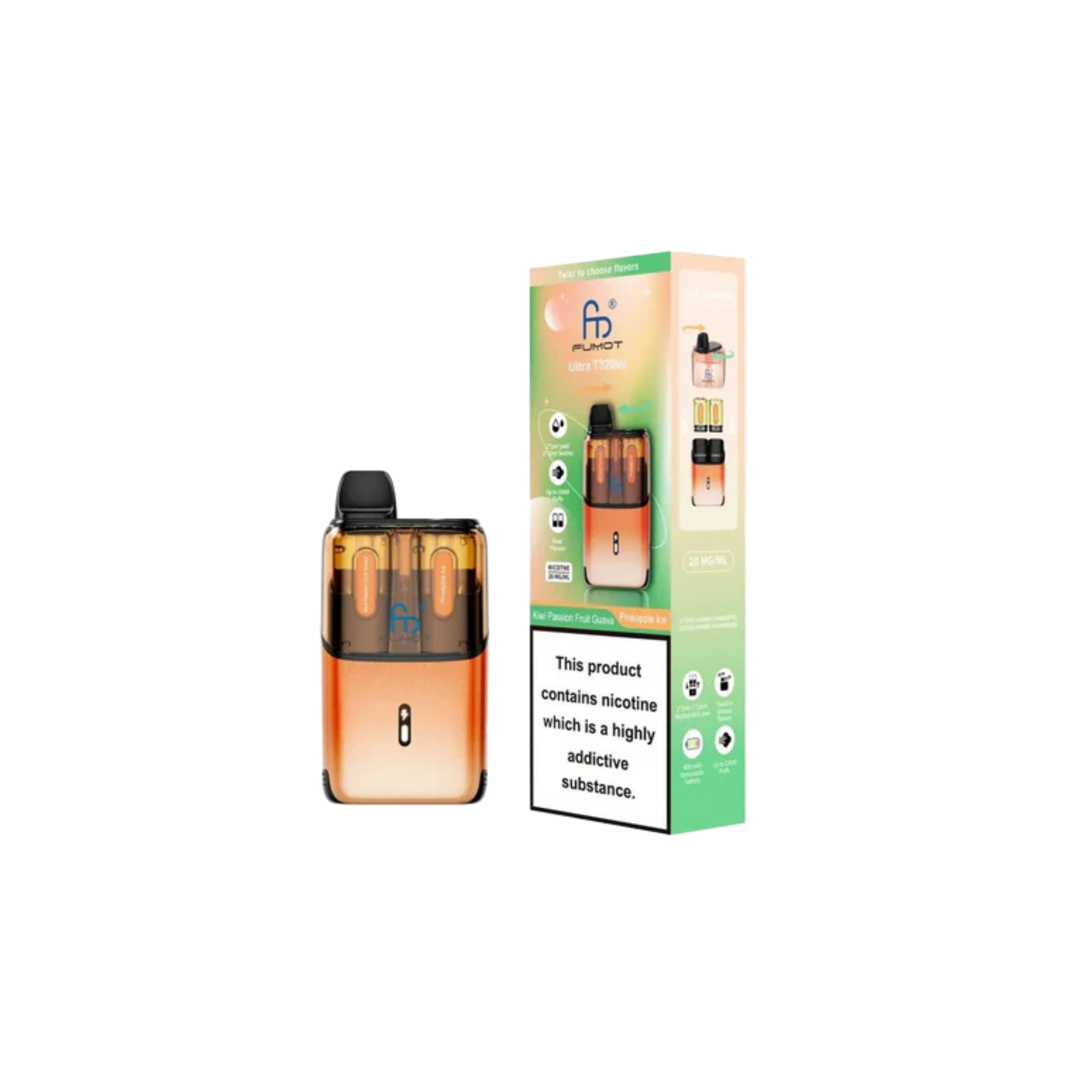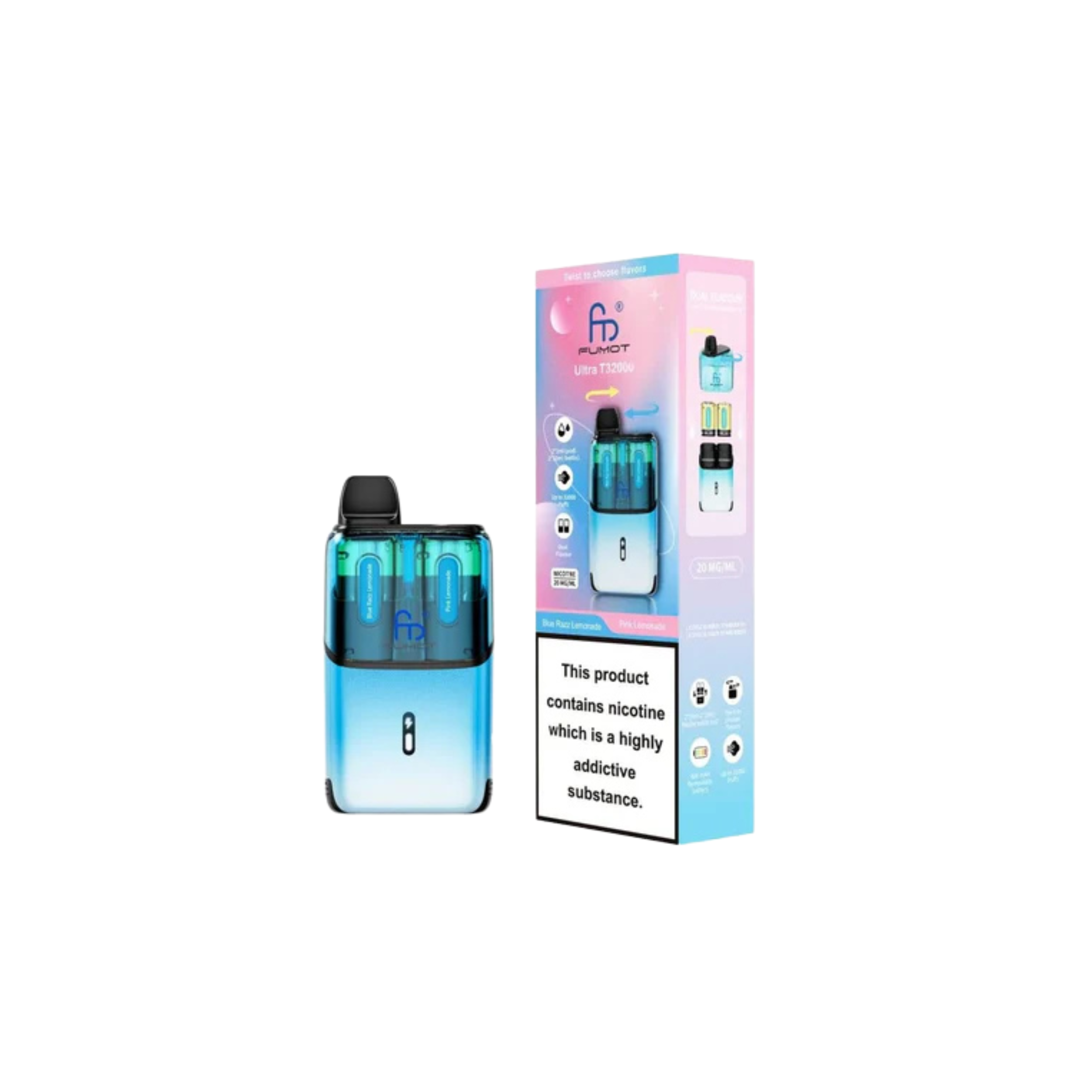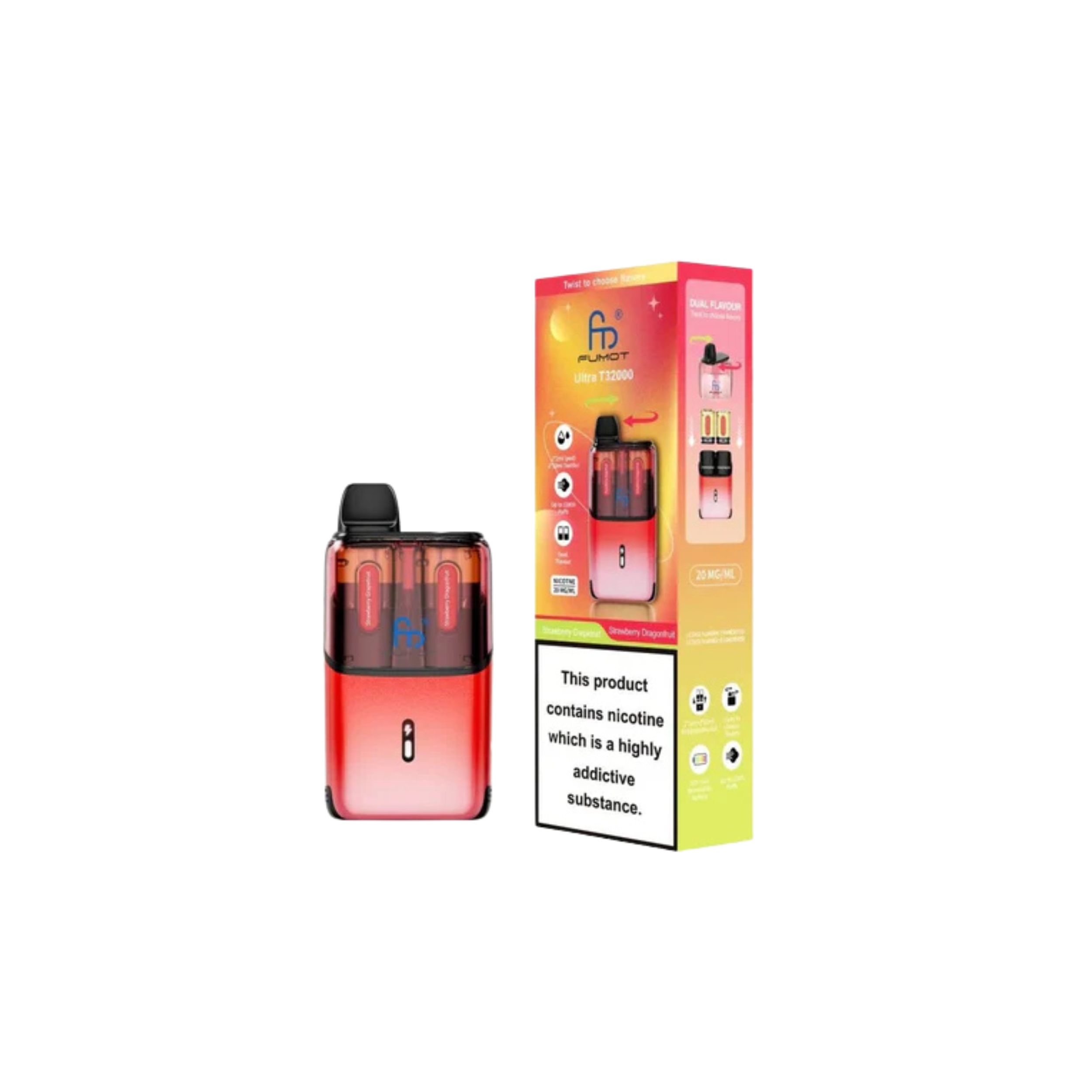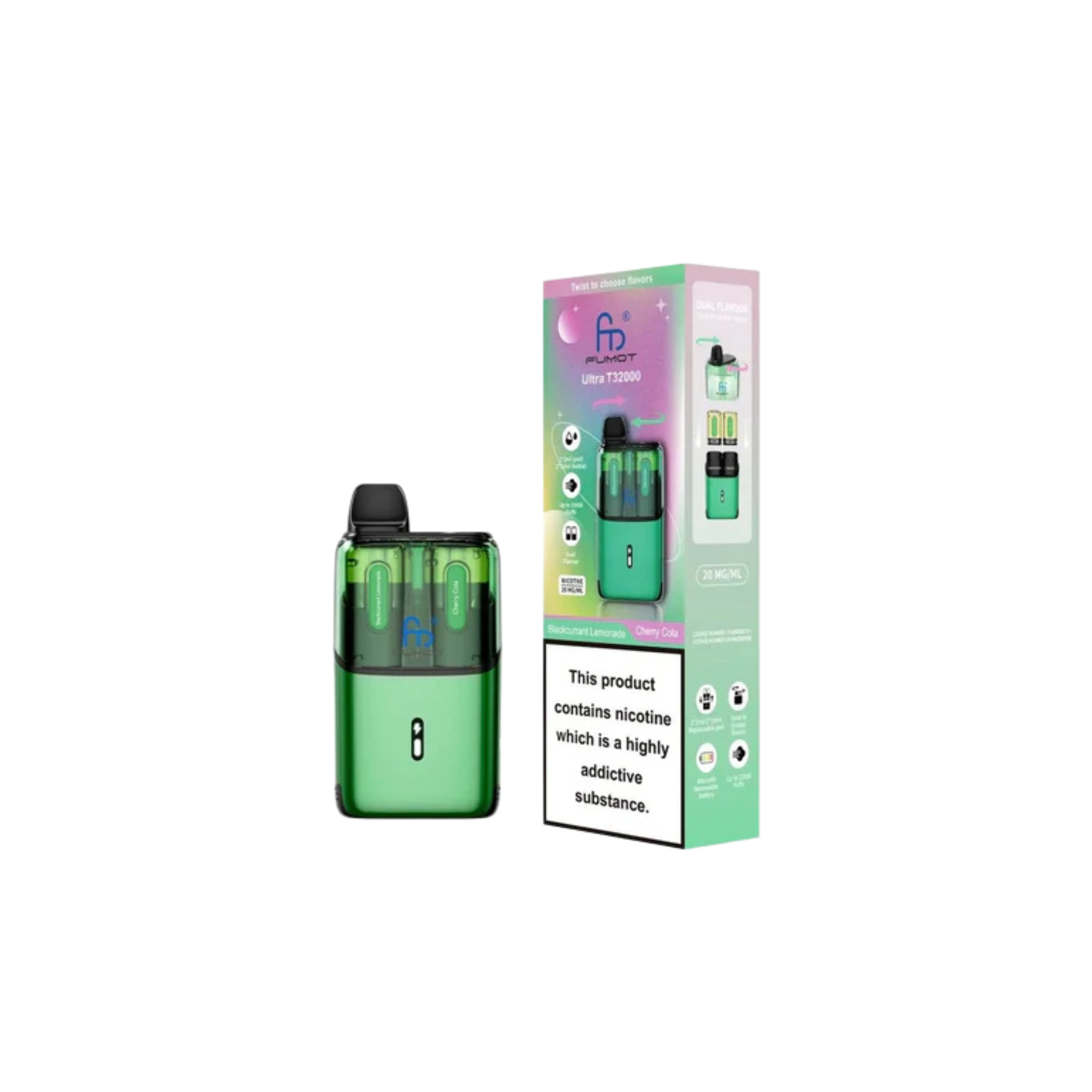 With up to 32,000 puffs, the Fumot Ultra T32000 ranks among the highest in puff capacity, allowing for long-lasting use. Each kit includes a total of 24ml of e-liquid for extended vaping sessions without frequent refills. Enjoy dual-flavour pods, enabling you to switch between two flavours for a varied and enjoyable experience. Every 2ml pod and 10ml refill container comes prefilled with 20mg nicotine salt e-liquid, offering a smooth and satisfying MTL (mouth-to-lung) draw. The advanced mesh coil technology ensures consistent flavour and performance with every puff, while the auto-vape feature allows effortless vaping with no buttons required. Once the pod is empty, simply swap to the Fumot T32000 refill pack to continue vaping.