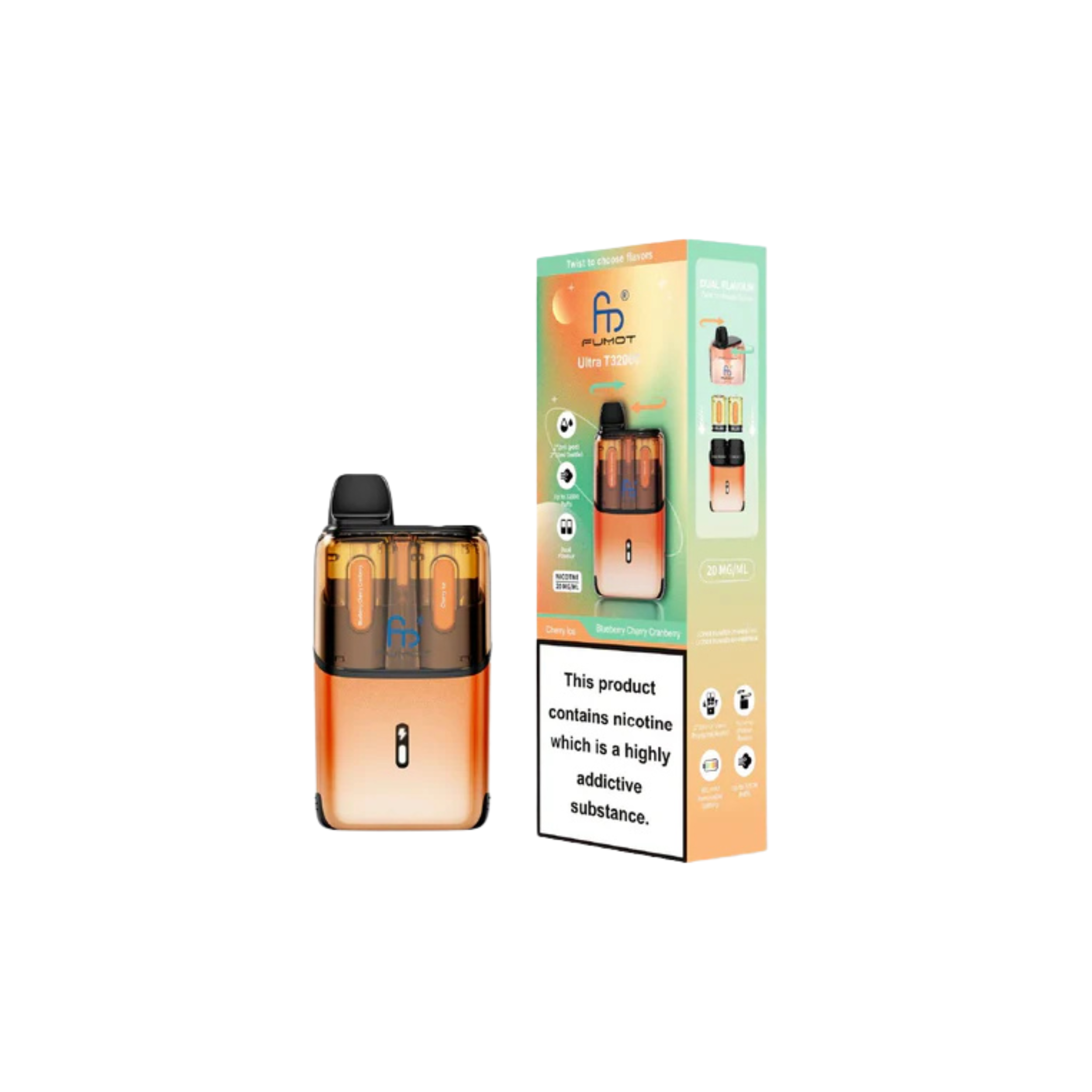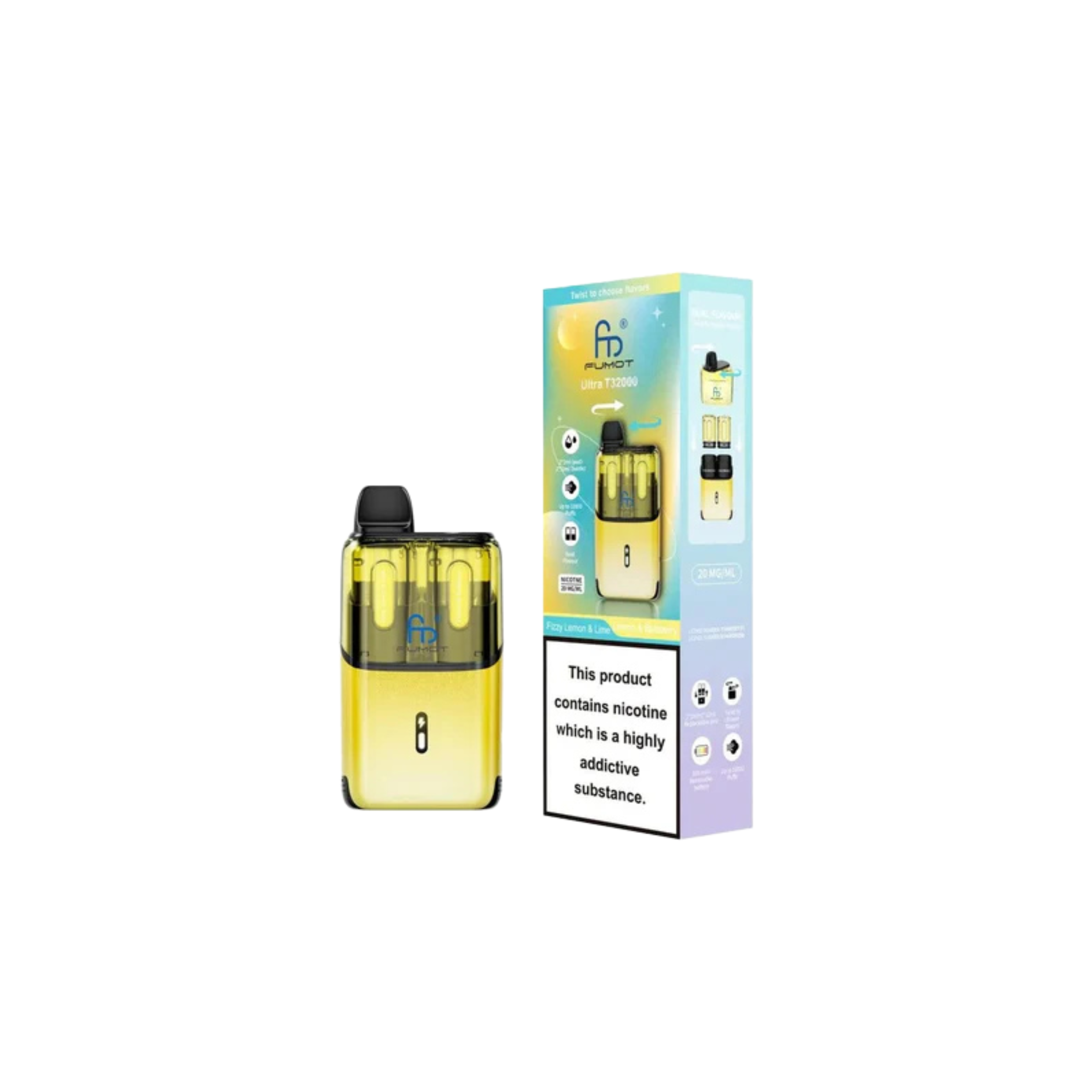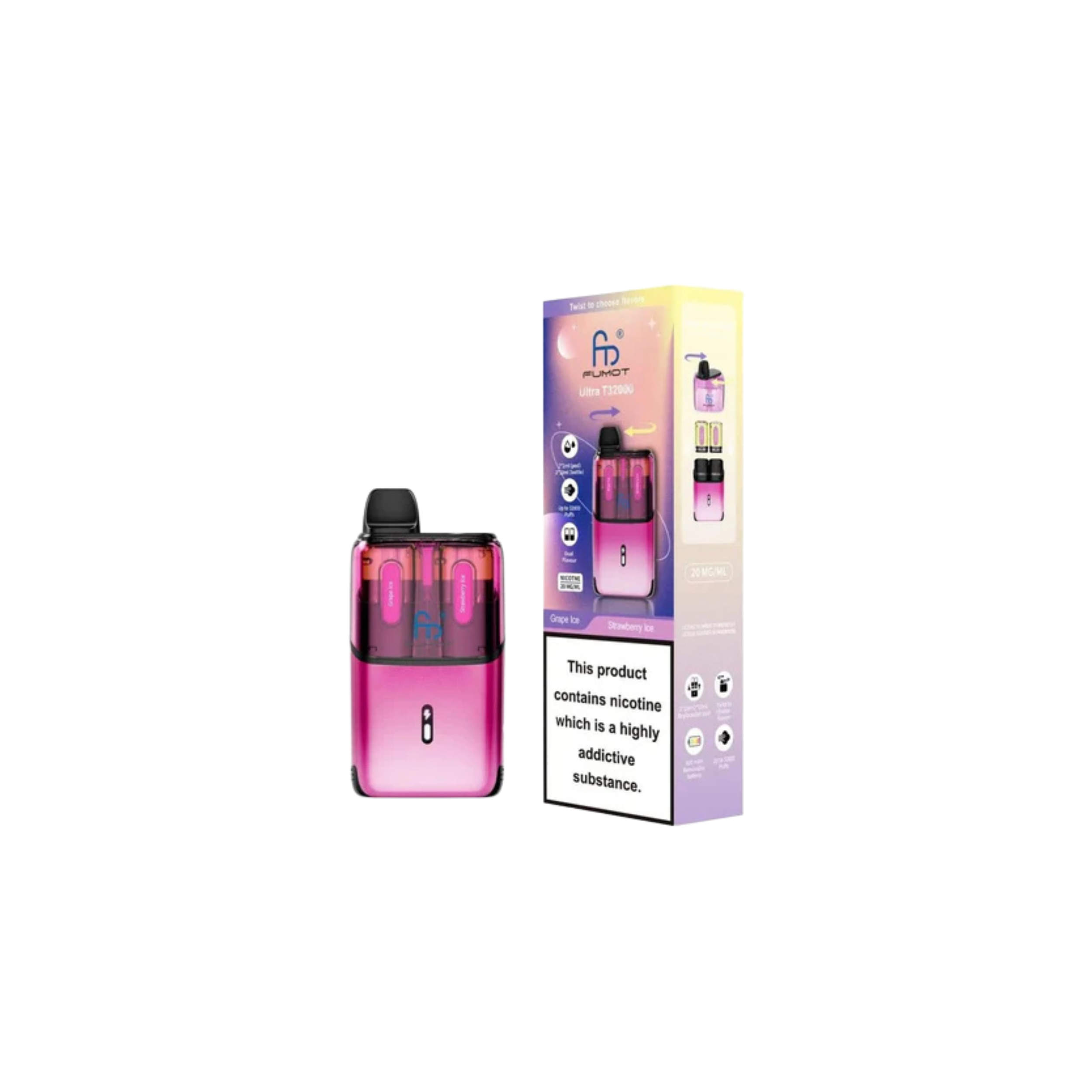 With up to 32,000 puffs, the Fumot Ultra T32000 ranks among the highest in puff capacity, allowing for long-lasting use. Each kit includes a total of 24ml of e-liquid for extended vaping sessions without frequent refills. Enjoy dual-flavour pods, enabling you to switch between two flavours for a varied and enjoyable experience. Every 2ml pod and 10ml refill container comes prefilled with 20mg nicotine salt e-liquid, offering a smooth and satisfying MTL (mouth-to-lung) draw. The advanced mesh coil technology ensures consistent flavour and performance with every puff, while the auto-vape feature allows effortless vaping with no buttons required. Once the pod is empty, simply swap to the Fumot T32000 refill pack to continue vaping.