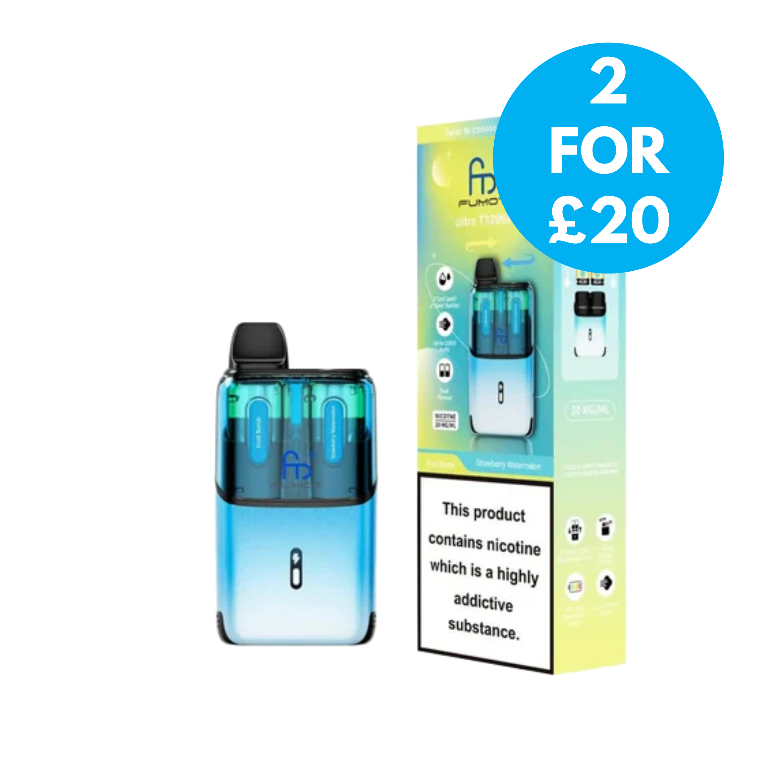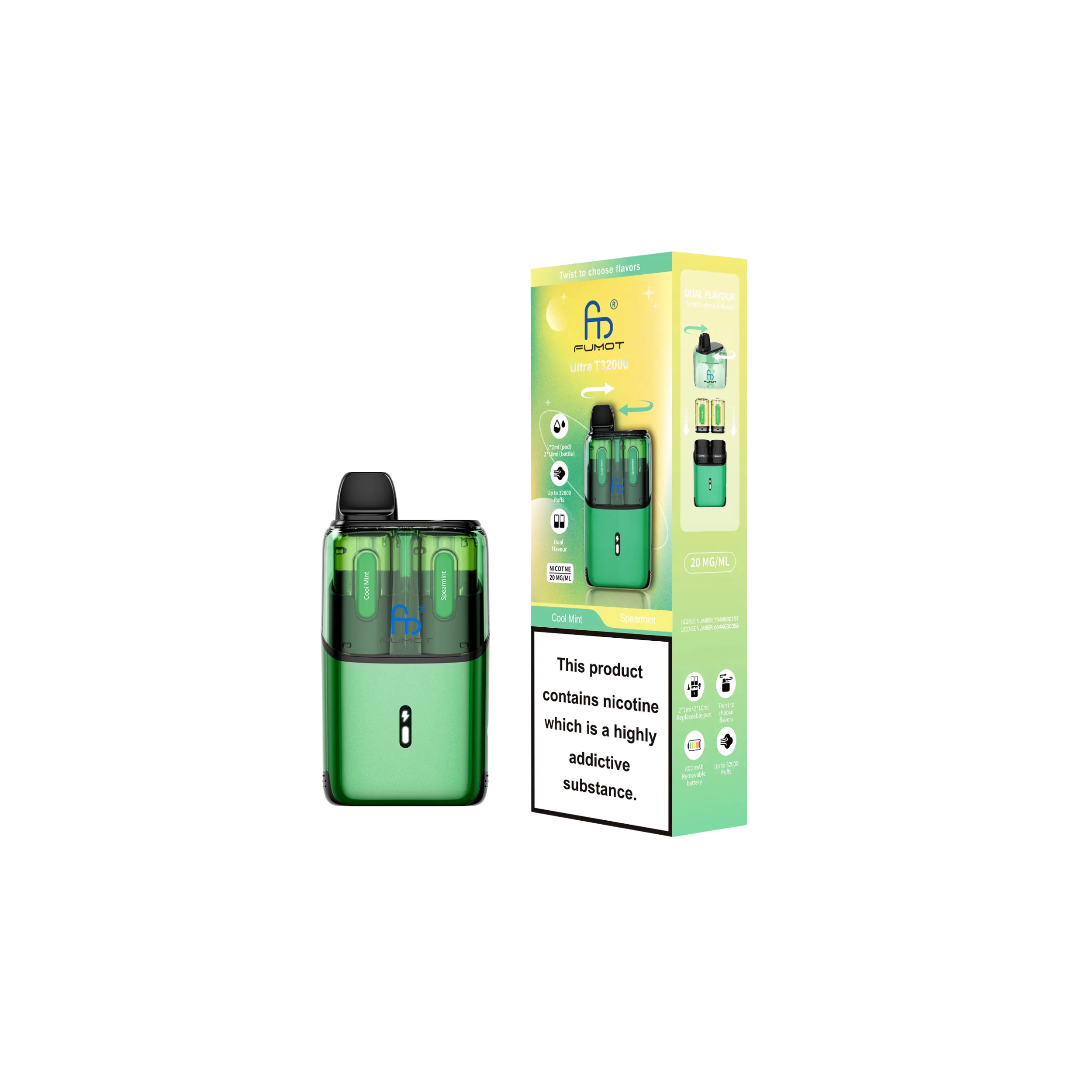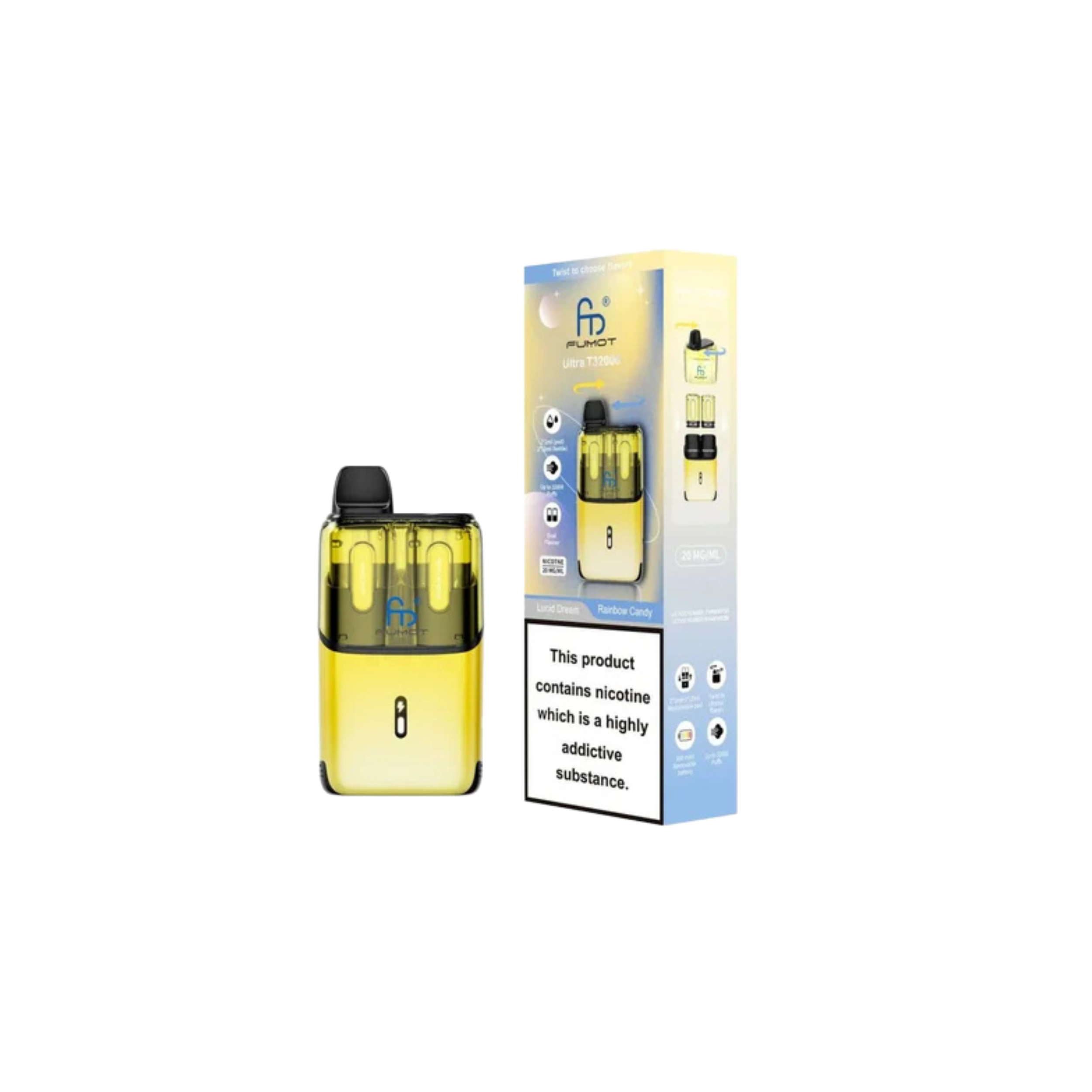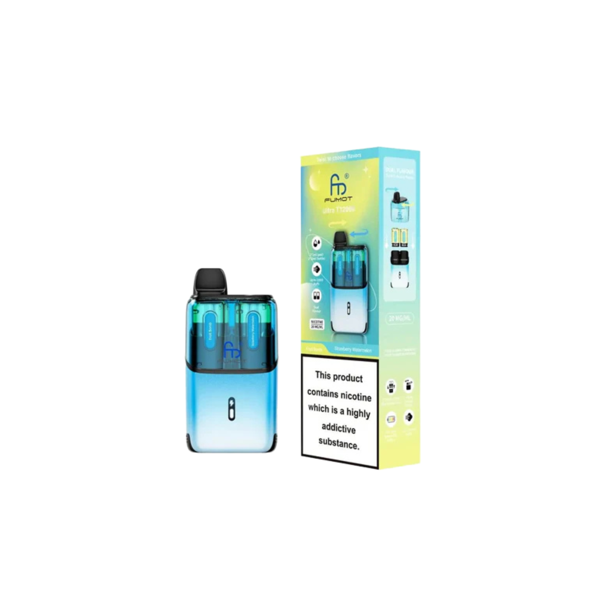 With up to 32,000 puffs, the Fumot Ultra T32000 ranks among the highest in puff capacity, allowing for long-lasting use. Each kit includes a total of 24ml of e-liquid for extended vaping sessions without frequent refills. Enjoy dual-flavour pods, enabling you to switch between two flavours for a varied and enjoyable experience. Every 2ml pod and 10ml refill container comes prefilled with 20mg nicotine salt e-liquid, offering a smooth and satisfying MTL (mouth-to-lung) draw. The advanced mesh coil technology ensures consistent flavour and performance with every puff, while the auto-vape feature allows effortless vaping with no buttons required. Once the pod is empty, simply swap to the Fumot T32000 refill pack to continue vaping.
