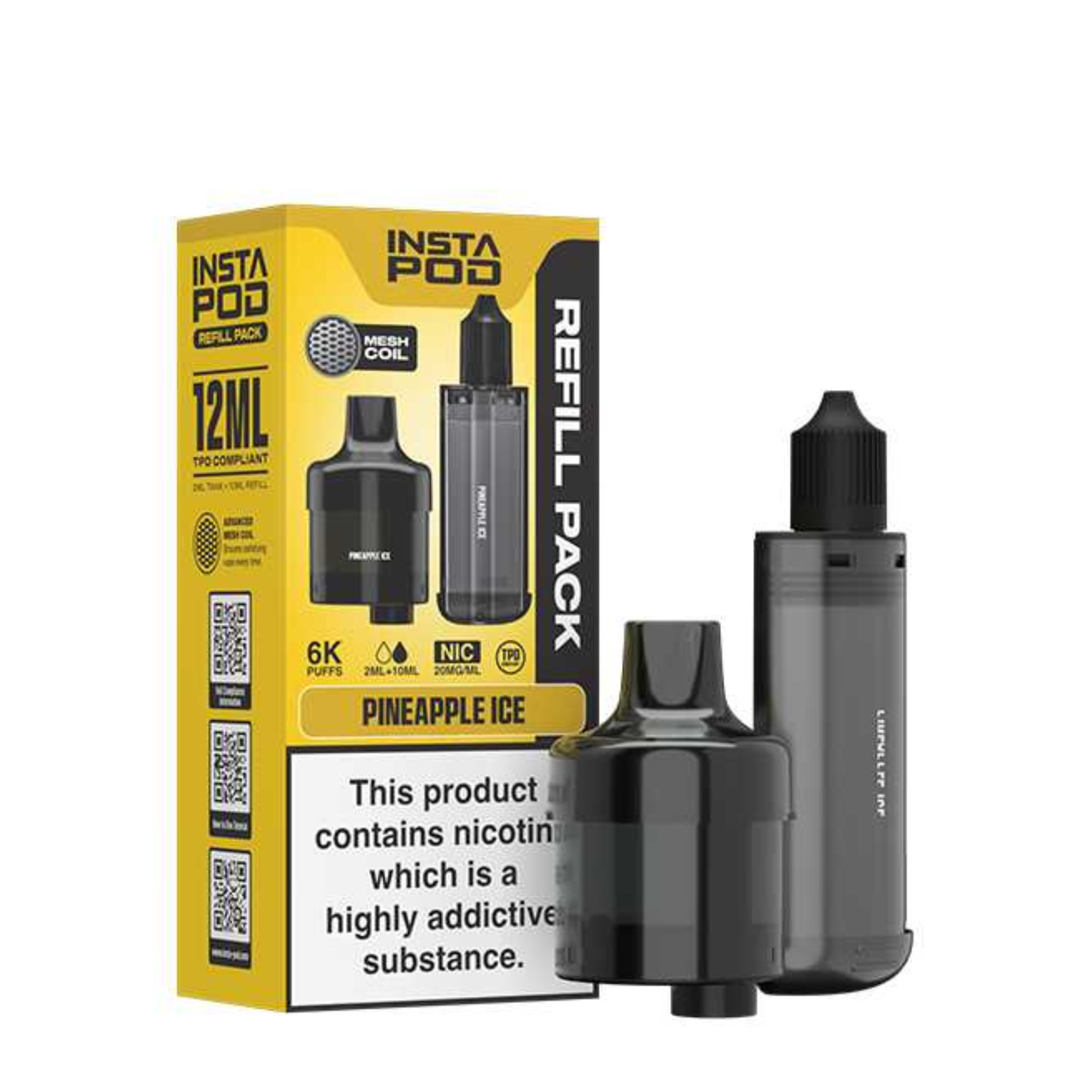 These are replacement pods for the Instapod 6000 Prefilled pod vape kit. The main tank comes prefilled with 2ml of liquid, and the refill container comes with 10ml, so you’re getting a total of 12ml of nicotine salt e-liquid in a 20mg strength with one of these packs.