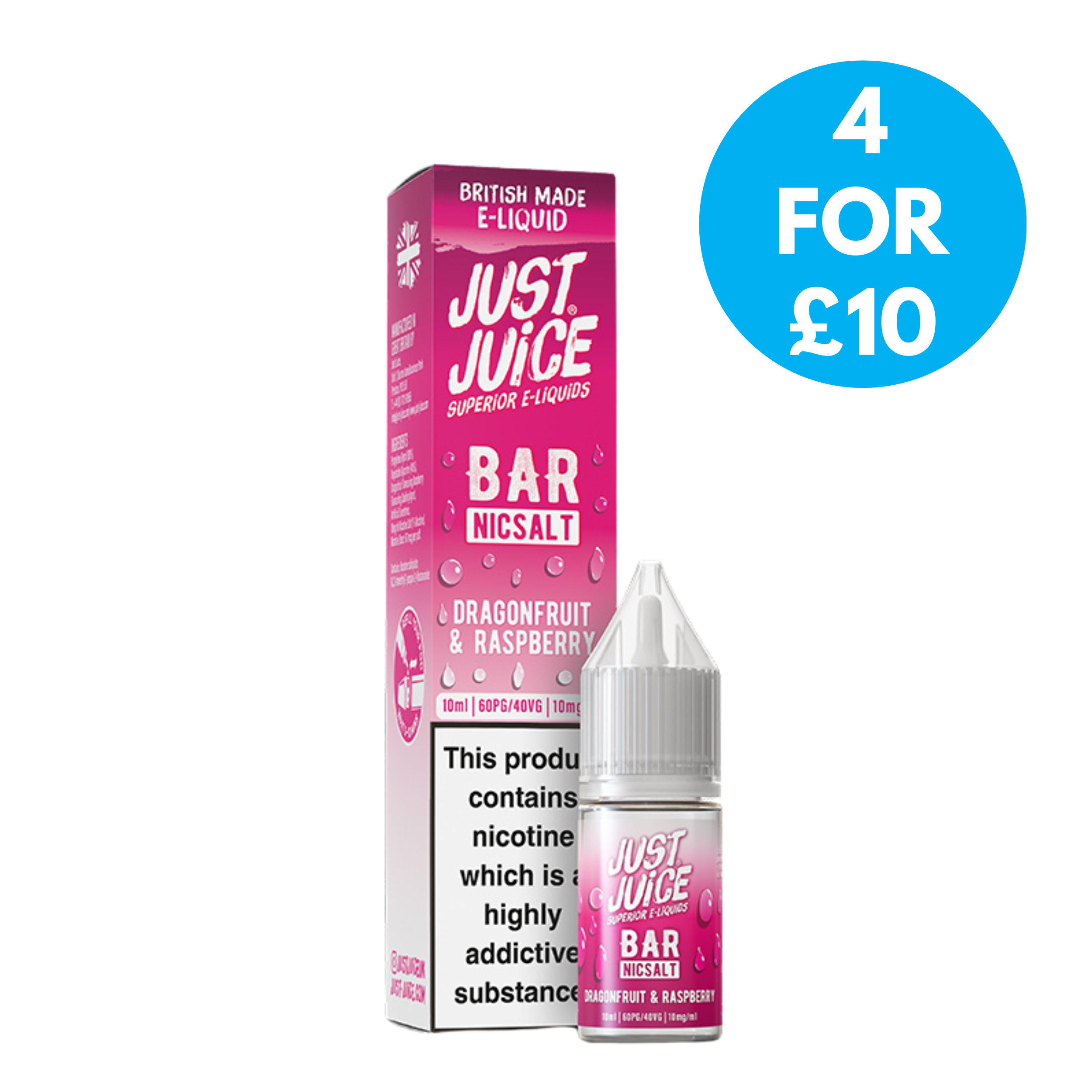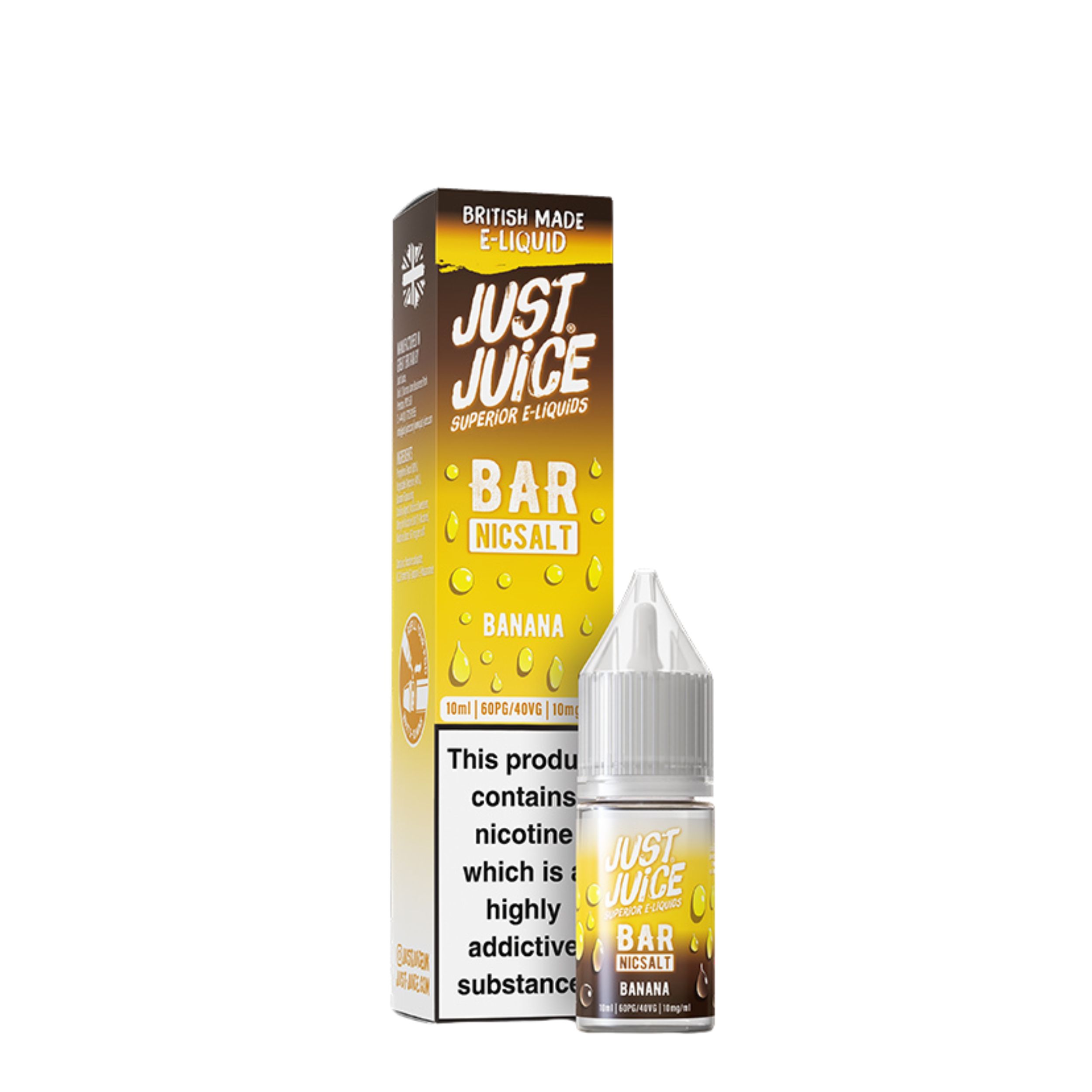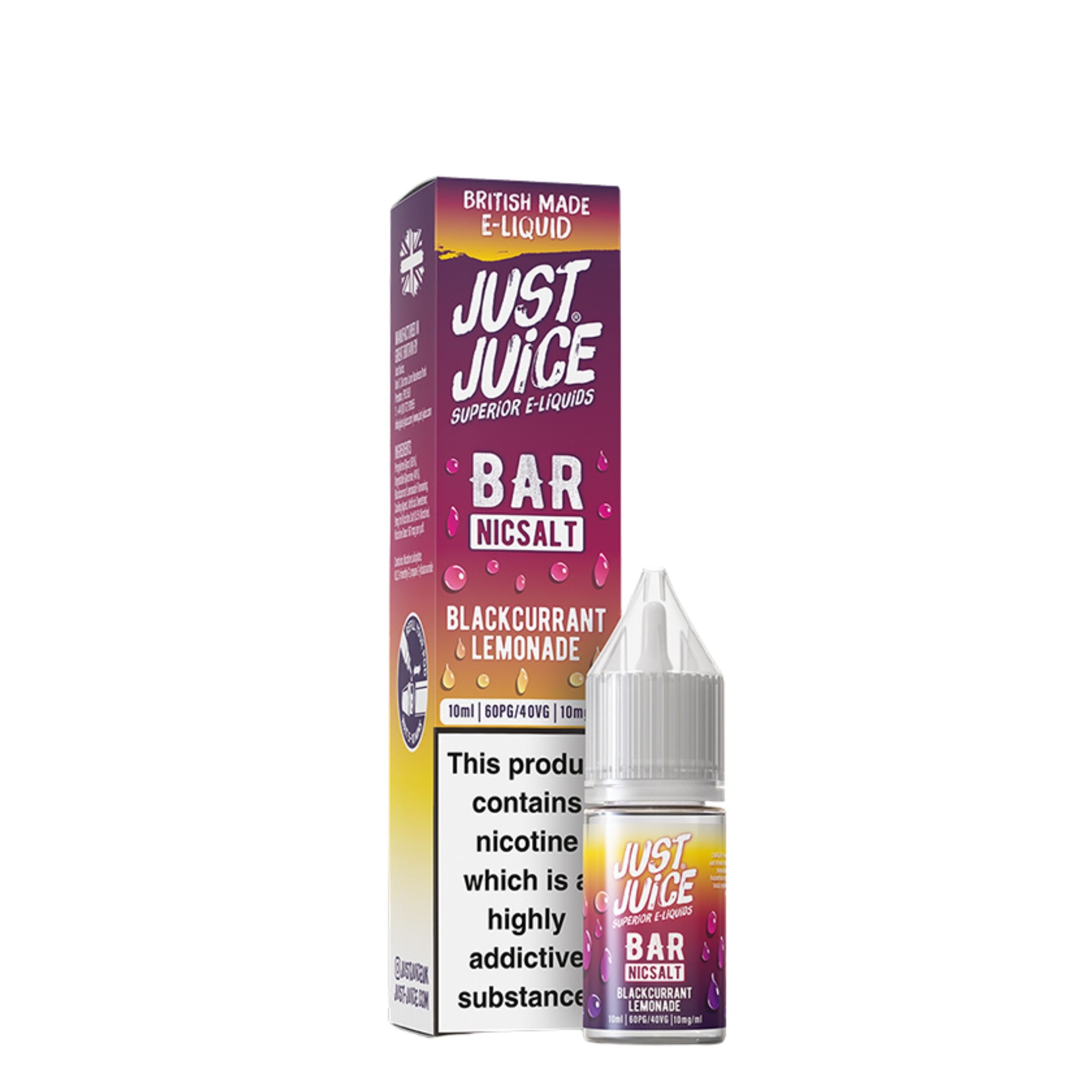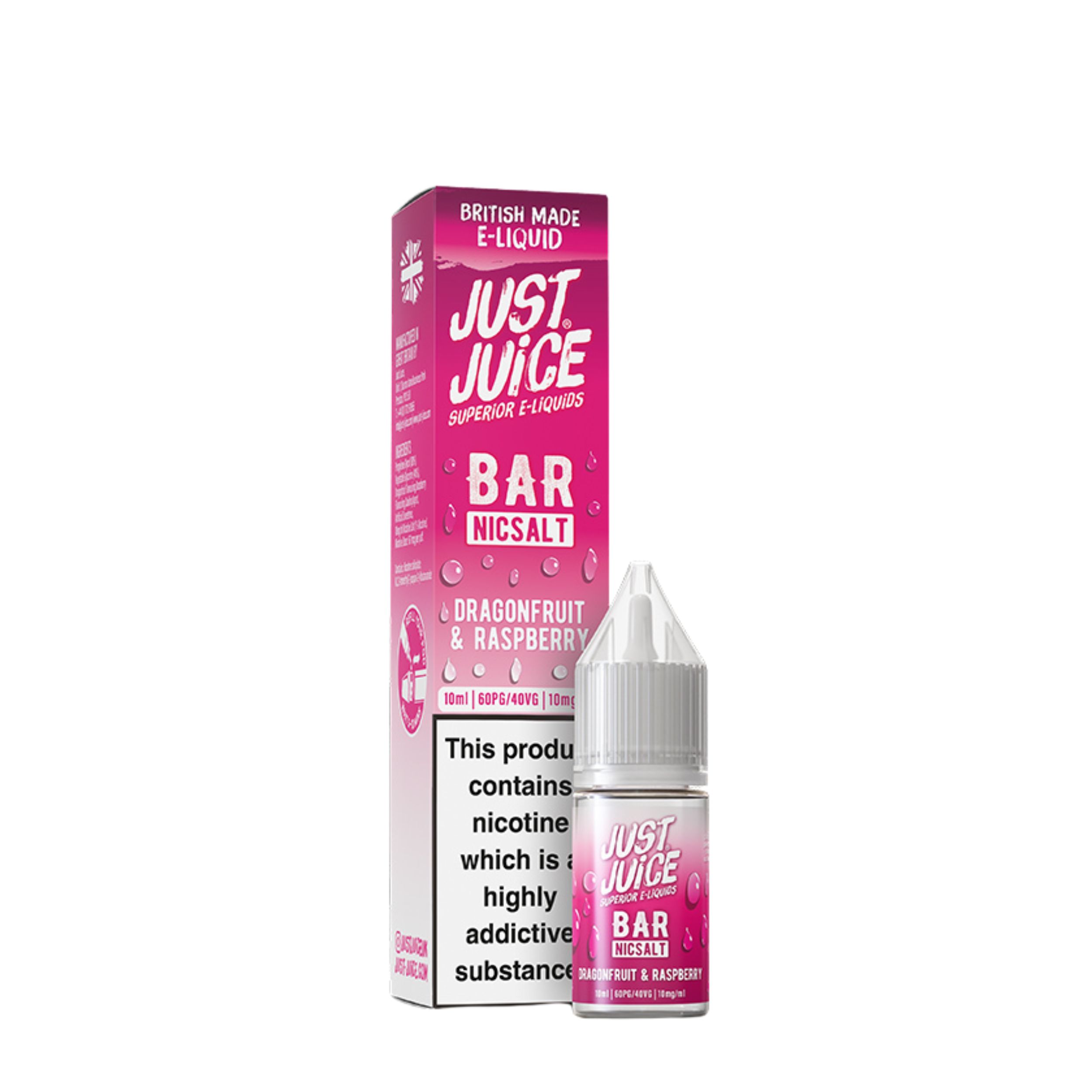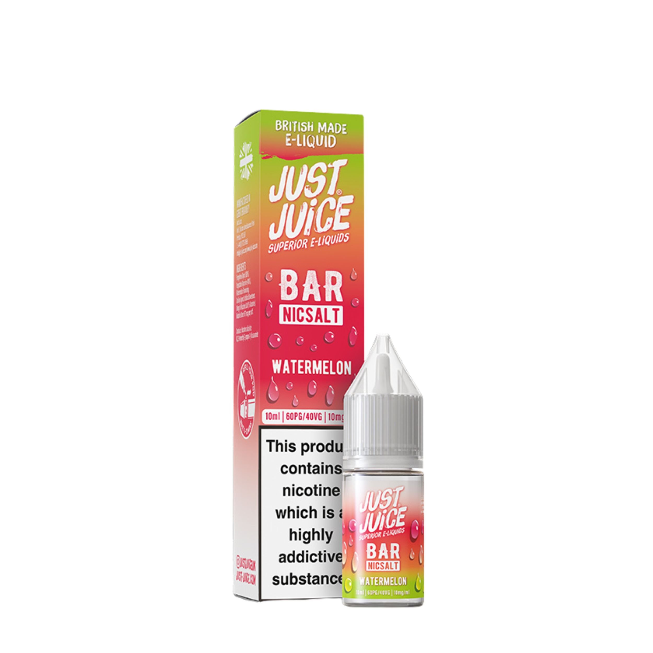 The Just Juice Bar Salts range is available in 10mg and 20mg nicotine strengths, giving you the choice to select which nicotine strength suits your smoke free journey best. They also feature a convenient drip tip nozzle that makes refilling your device mess free and hassle free, as well as being cost effective vaping solution since you are getting more for your money and it can last longer.