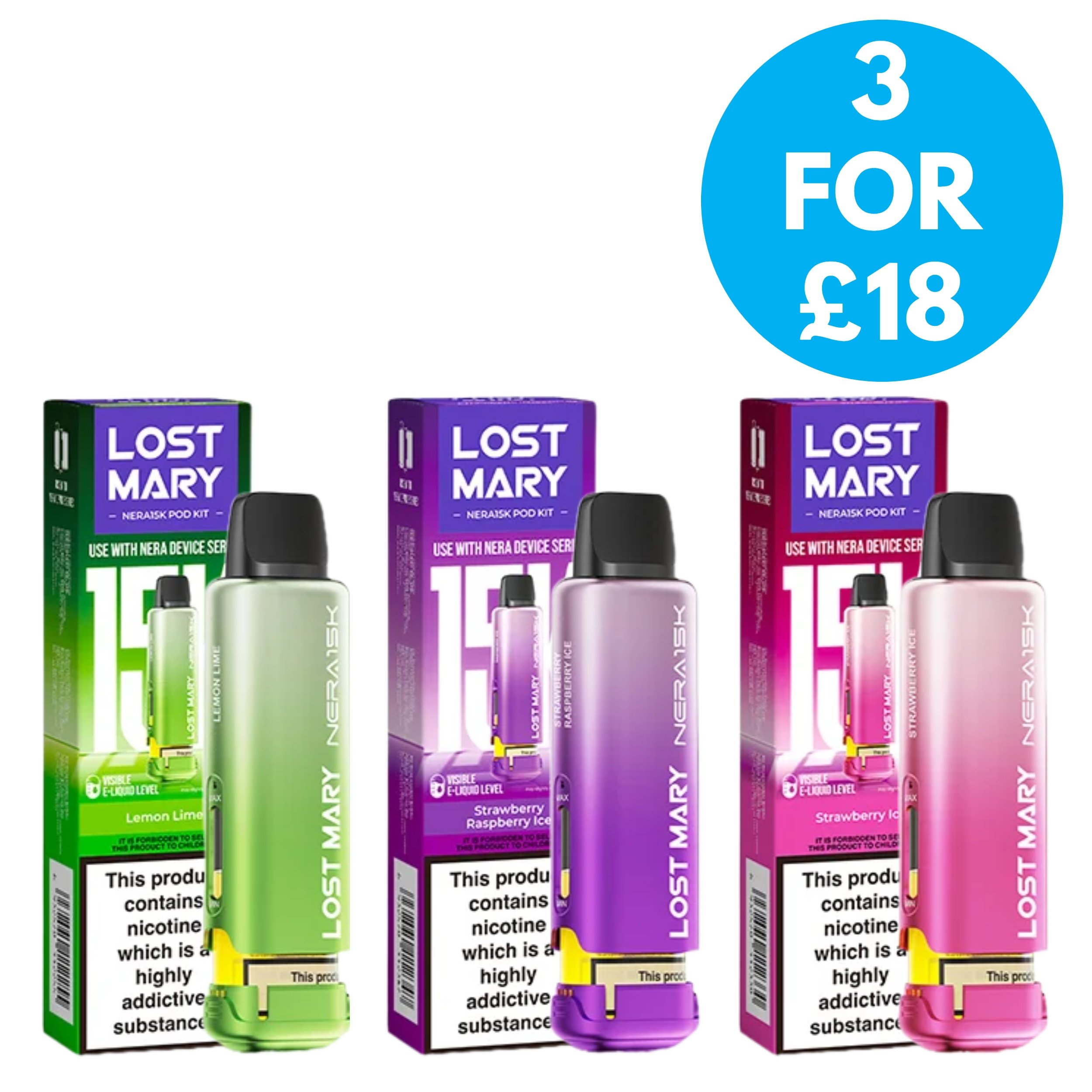 Each single pod provides up to 15,000 (15K) puffs, with 2 needed for the Nera kit. With each pack you’ll receive a 2ml prefilled pod and an additional 10ml refill container prefilled with Lost Marys famous Maryliq nic salt e-liquid in a 20mg strength.