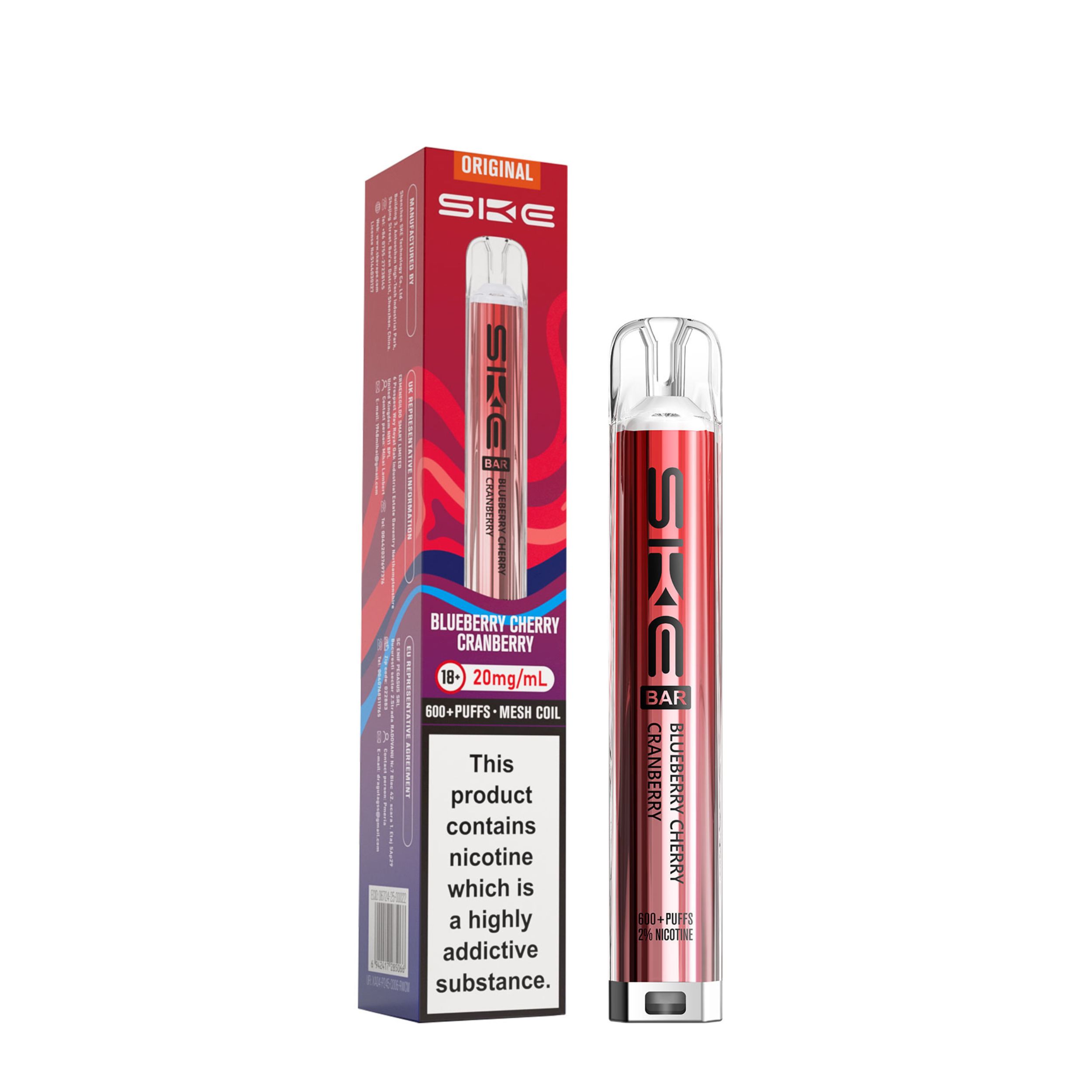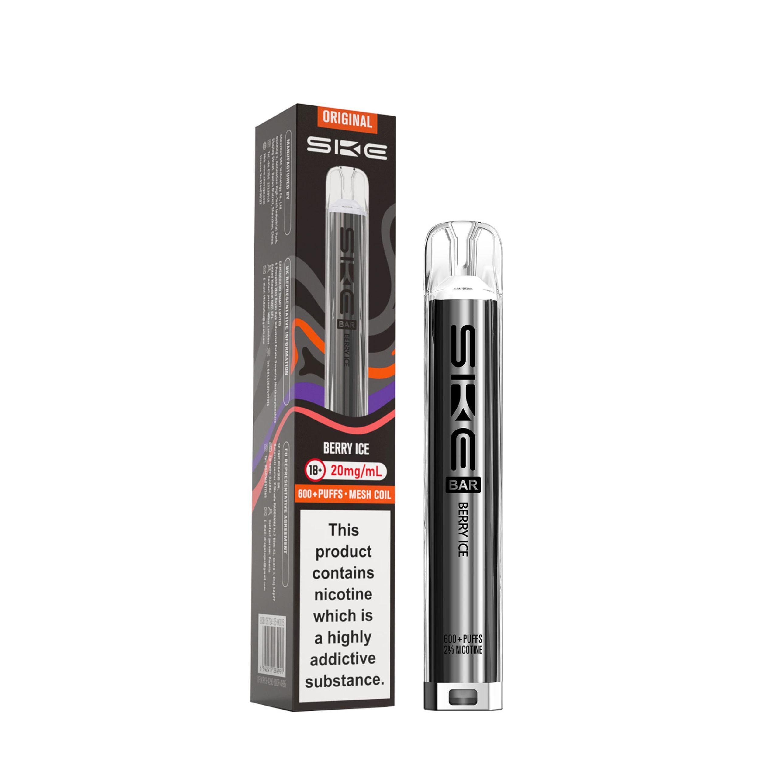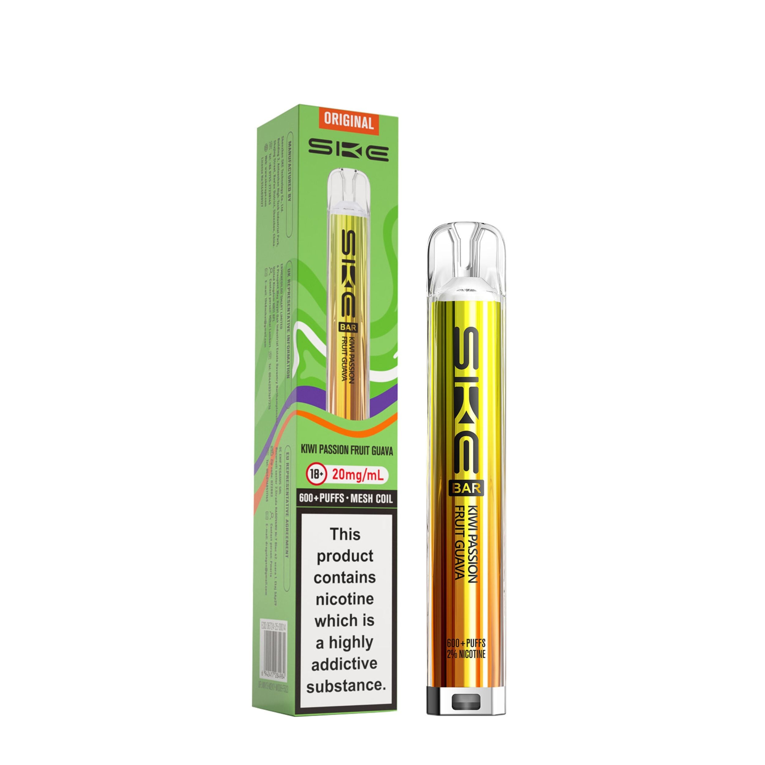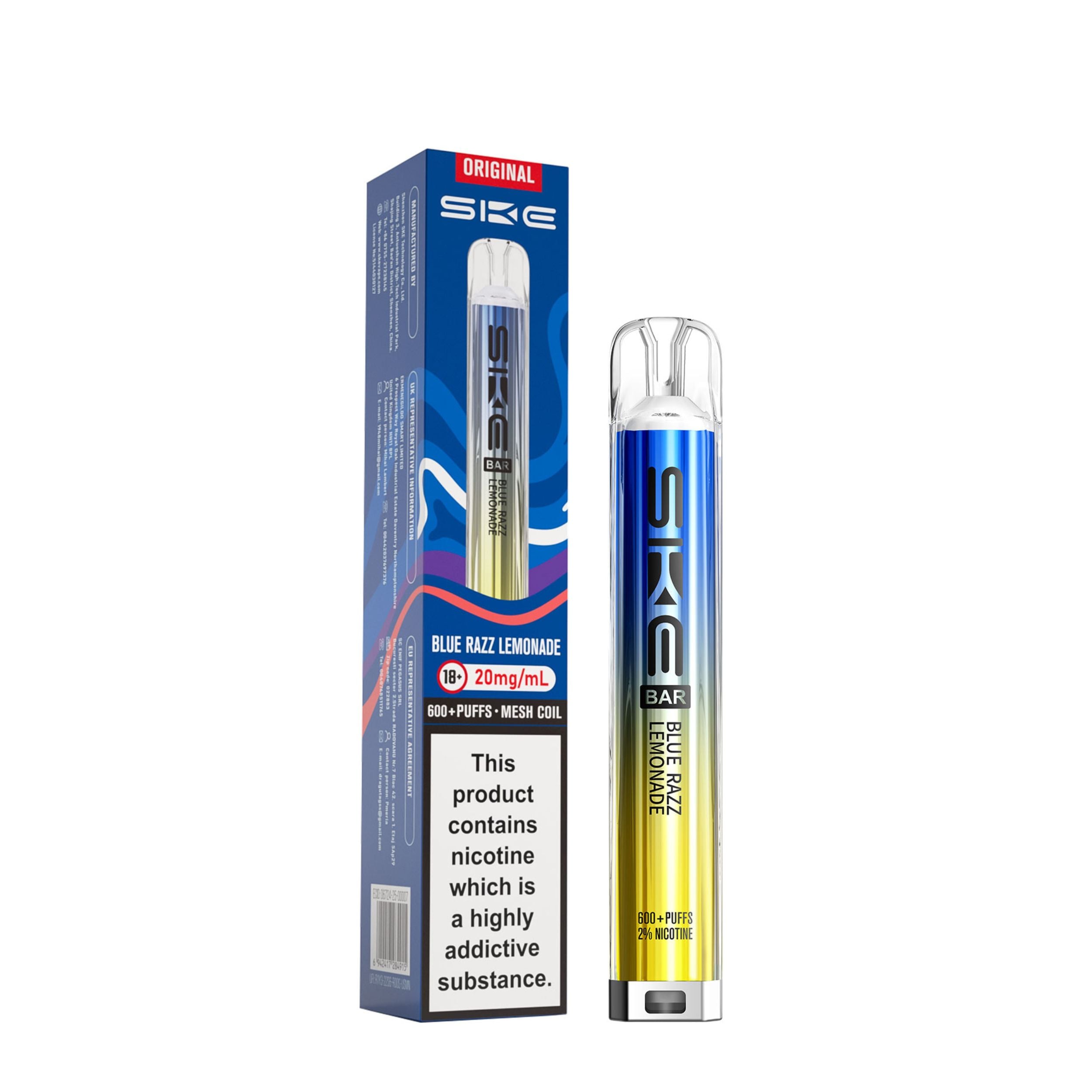 Each kit comes with a 2ml prefilled pod and the SKE Crystal battery device. Once the 2ml pod has run out, simply click the two buttons at the bottom of the device and slide the old pod off, then slide a new SKE Crystal Bar 600 pod on. This kit is a great user friendly vape, best suited to beginners looking to transition from smoking as well as regular vapers. It’s a compact device that is easy to use on the go and is also discreet.