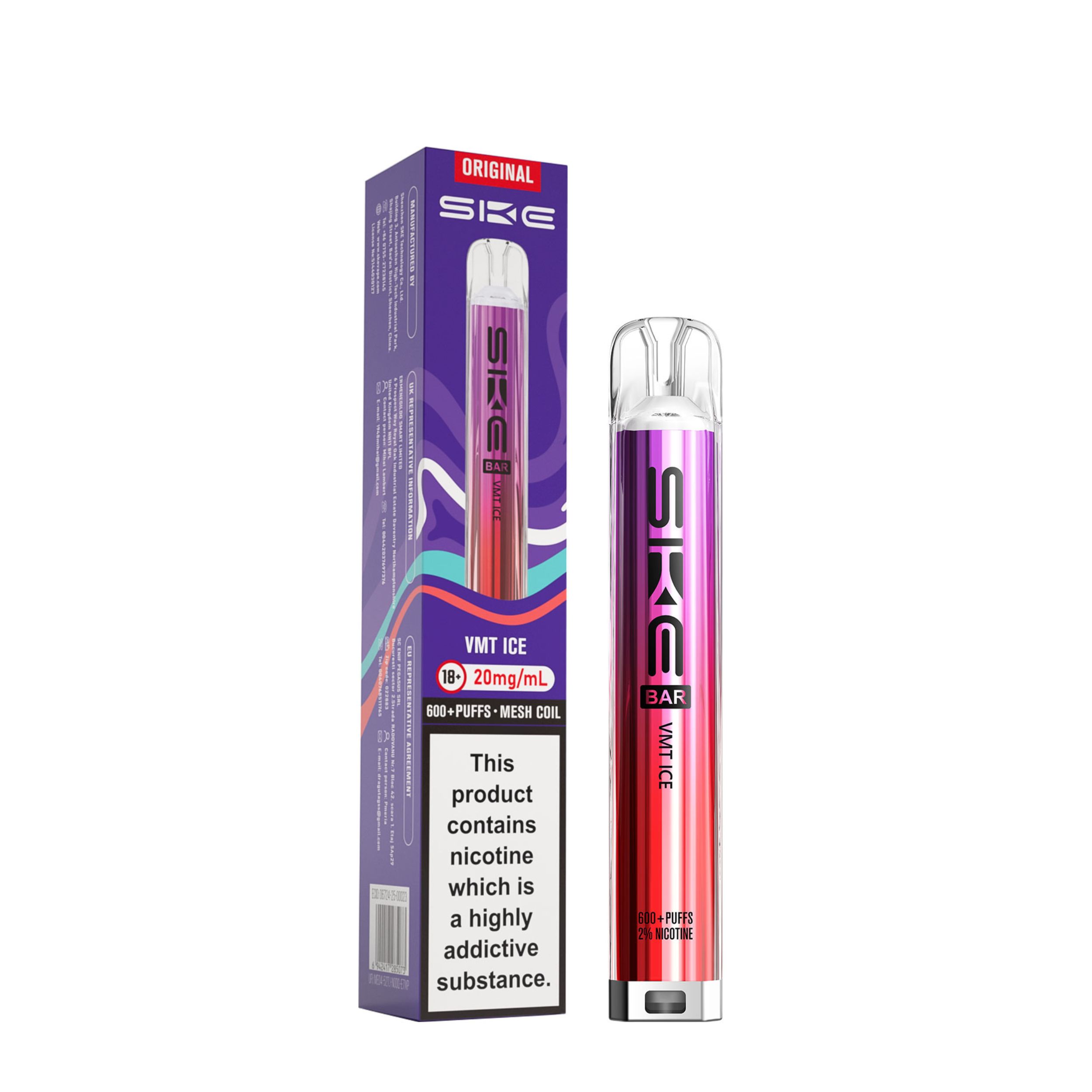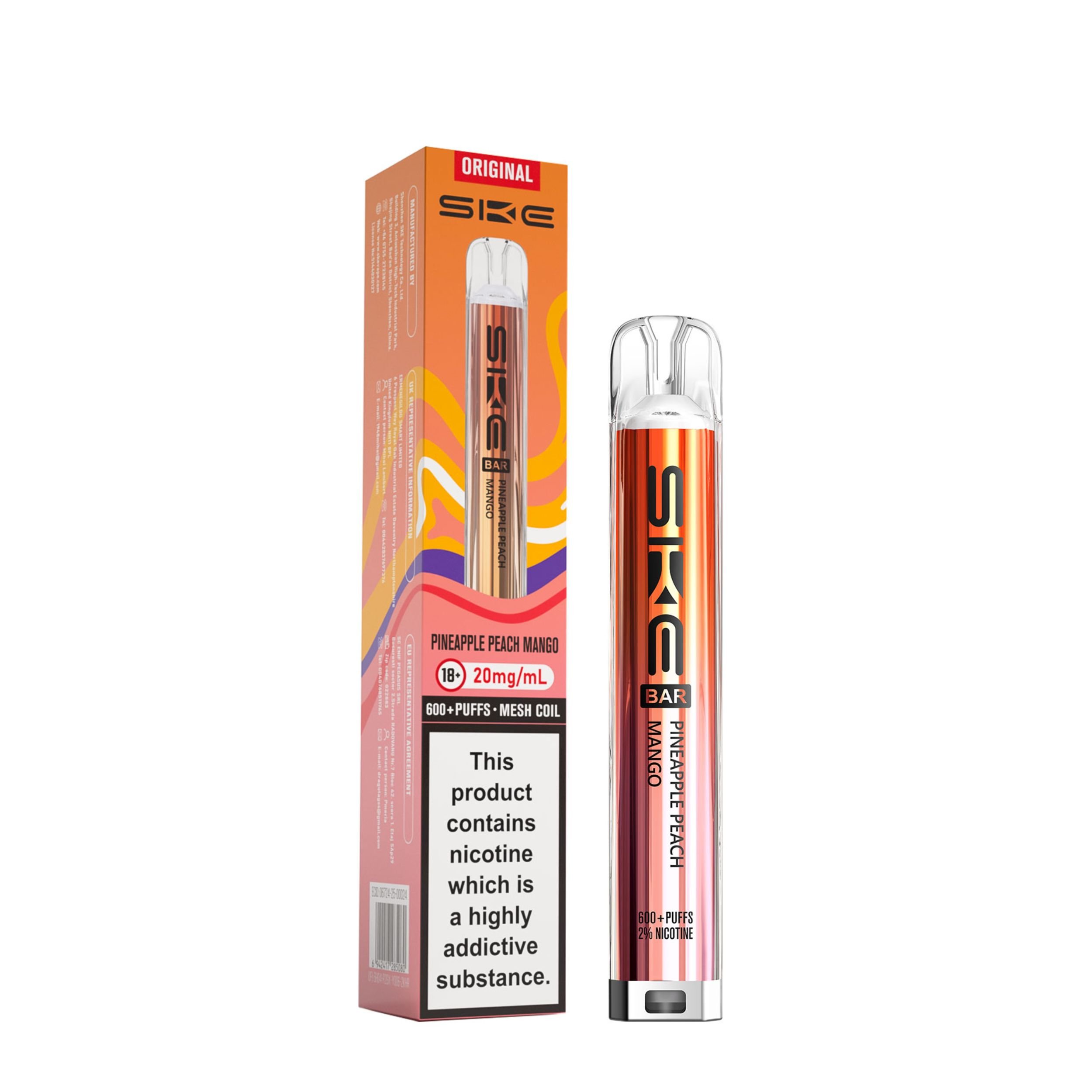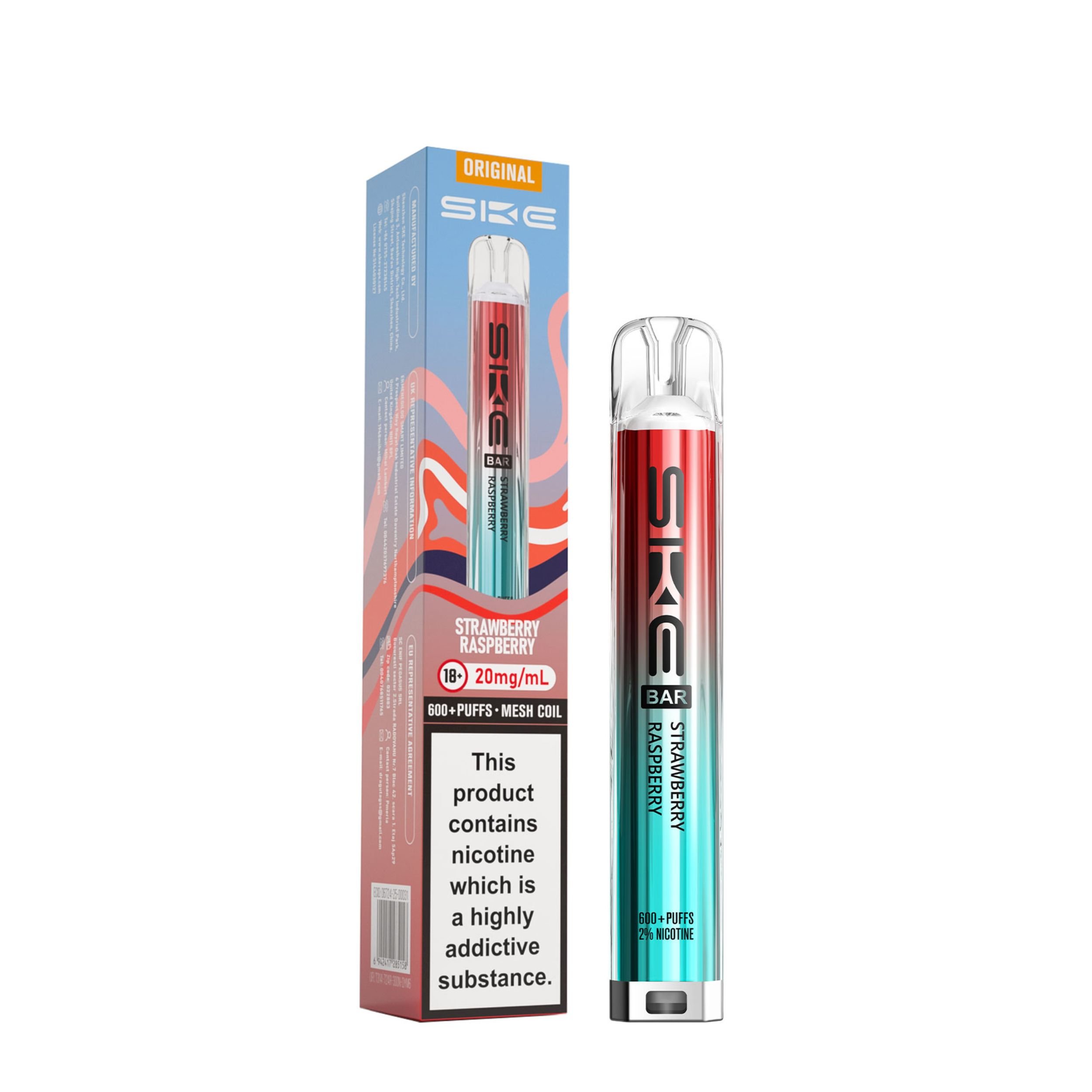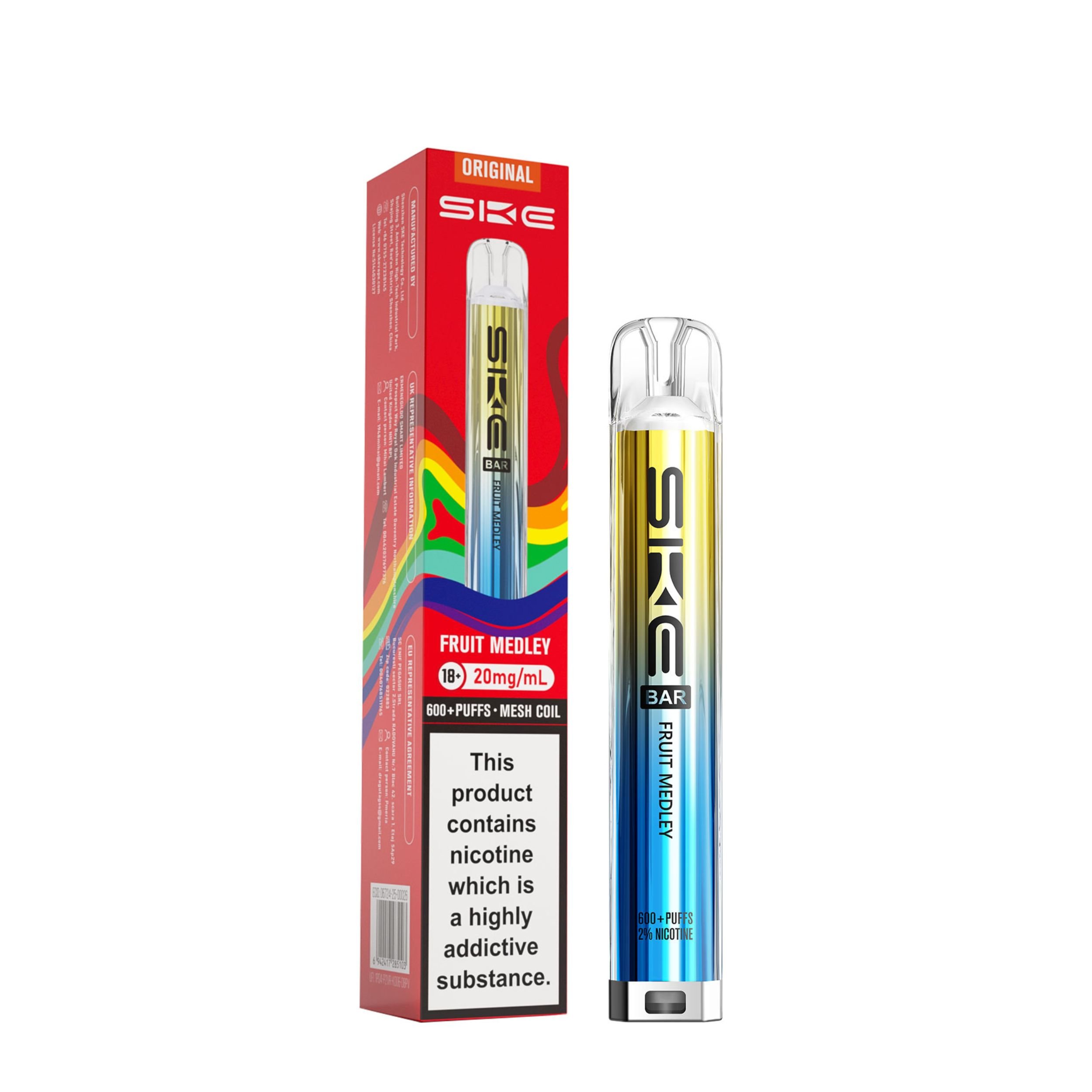 Each kit comes with a 2ml prefilled pod and the SKE Crystal battery device. Once the 2ml pod has run out, simply click the two buttons at the bottom of the device and slide the old pod off, then slide a new SKE Crystal Bar 600 pod on. This kit is a great user friendly vape, best suited to beginners looking to transition from smoking as well as regular vapers. It’s a compact device that is easy to use on the go and is also discreet.