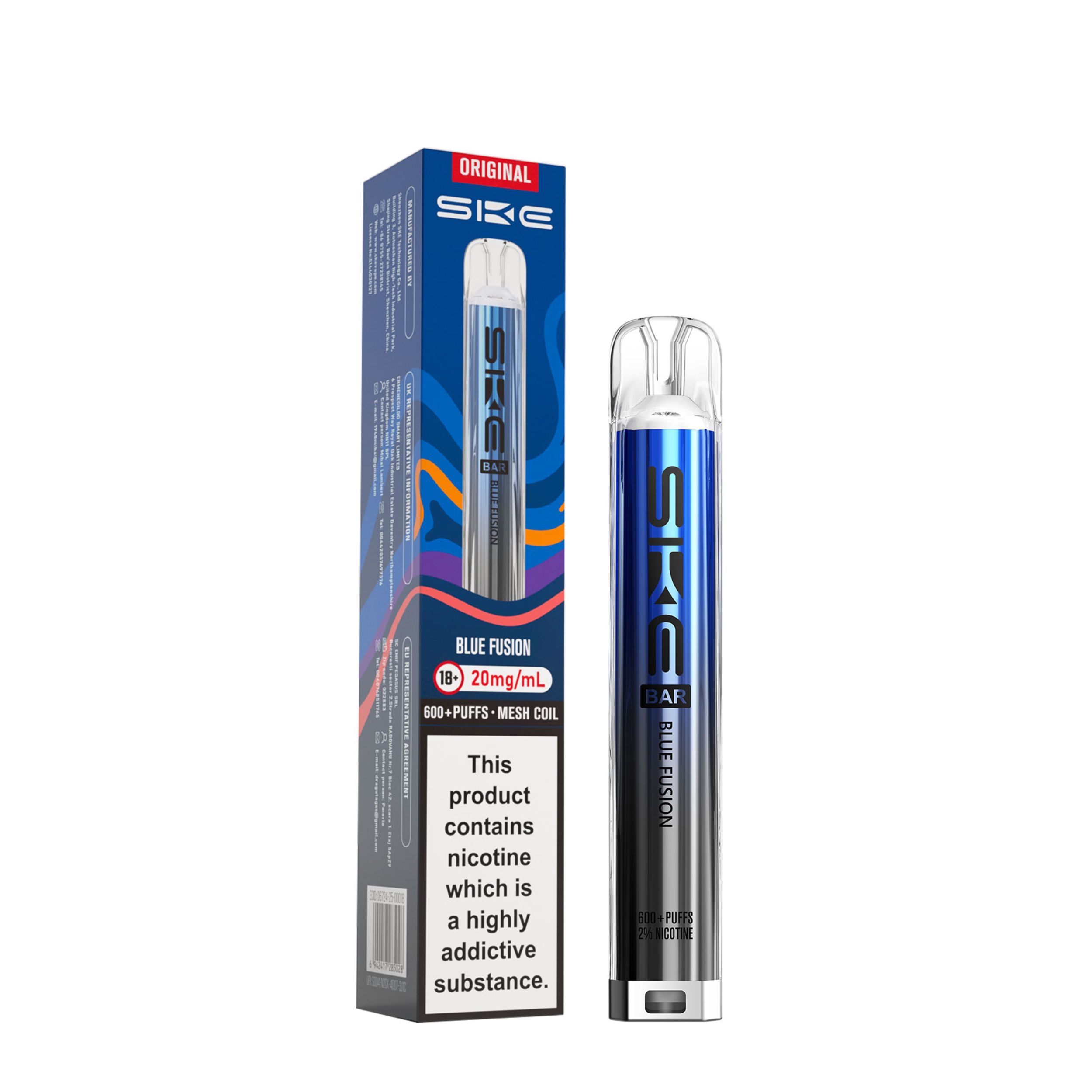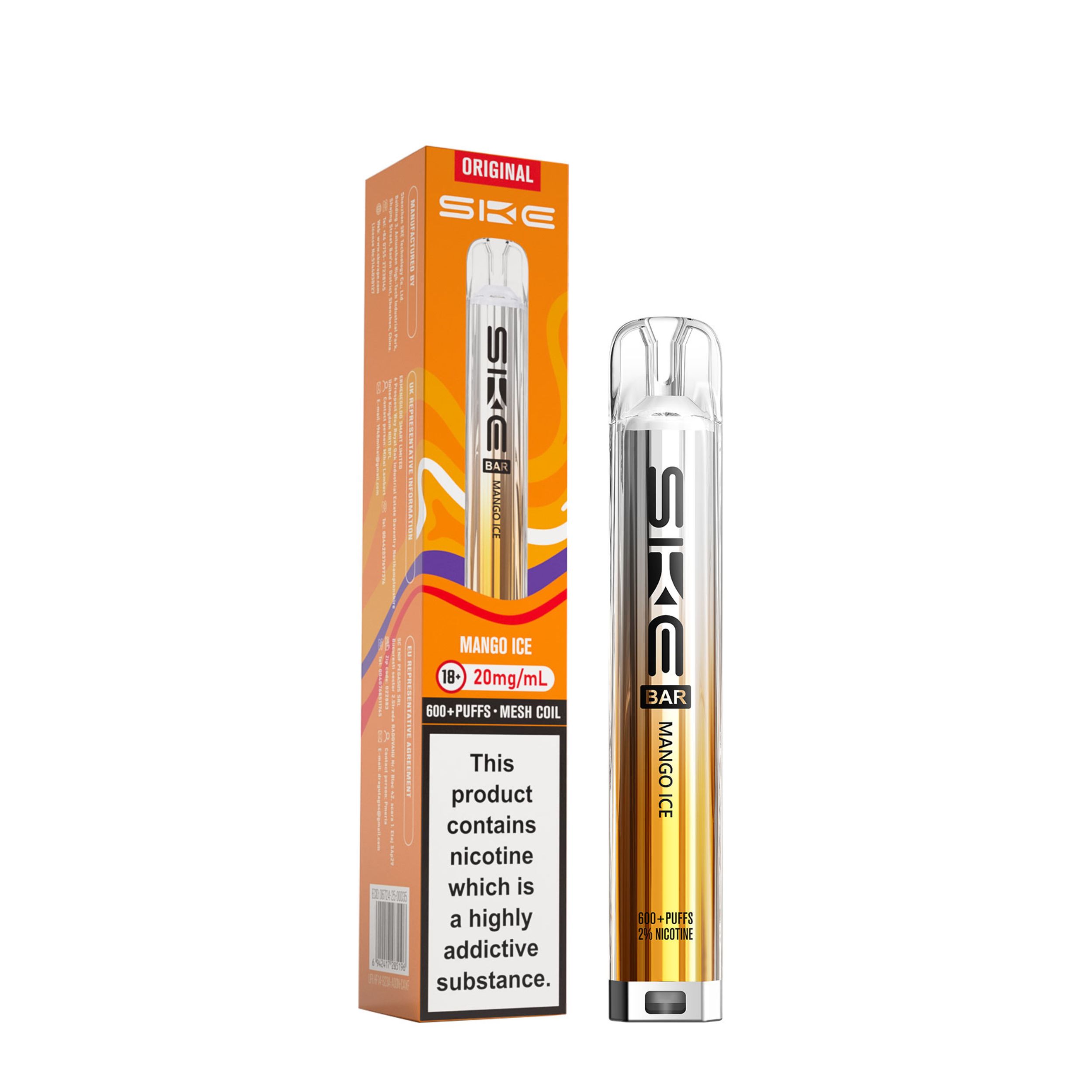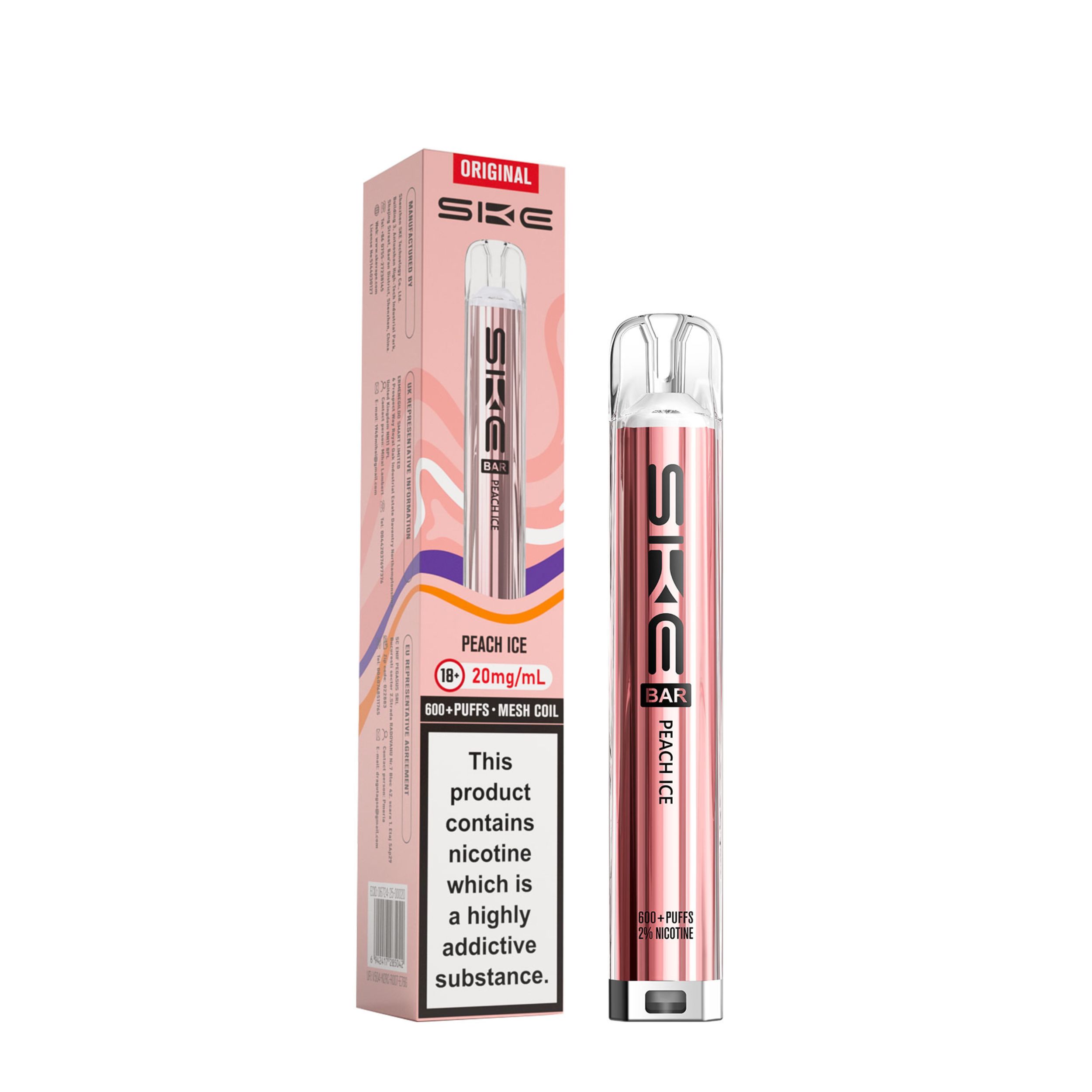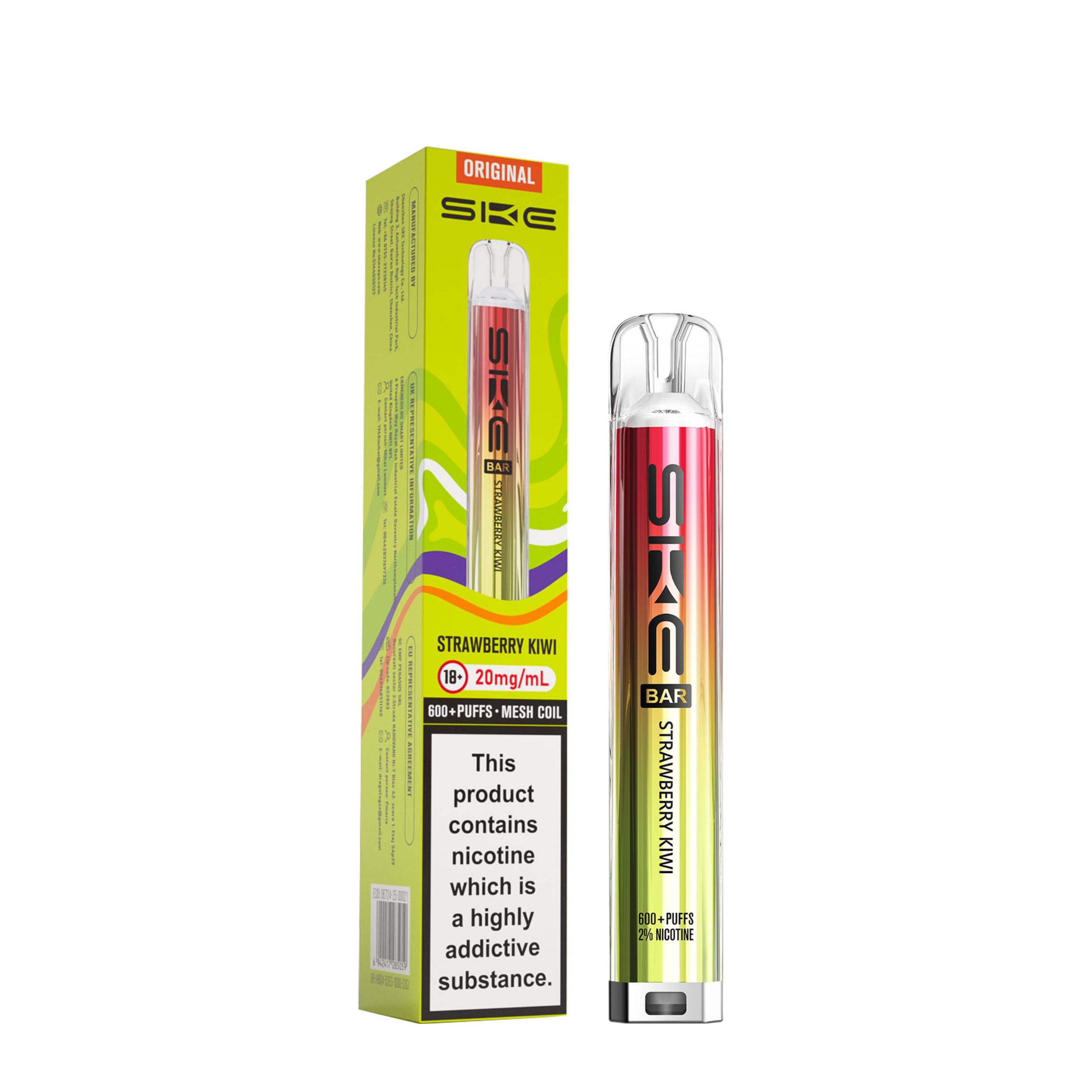 Each kit comes with a 2ml prefilled pod and the SKE Crystal battery device. Once the 2ml pod has run out, simply click the two buttons at the bottom of the device and slide the old pod off, then slide a new SKE Crystal Bar 600 pod on. This kit is a great user friendly vape, best suited to beginners looking to transition from smoking as well as regular vapers. It’s a compact device that is easy to use on the go and is also discreet.