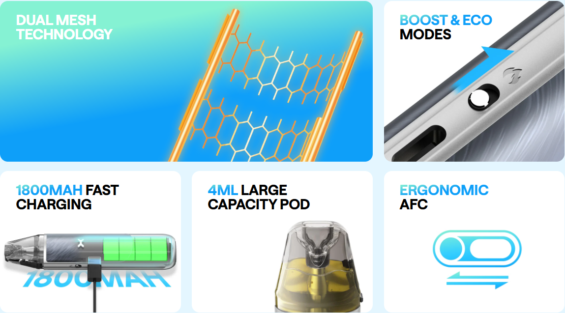 The OXVA Nexlim Go offers two vaping modes to suit your preferences, Boost Mode and Eco Mode. Boost Mode delivers higher power, allowing the mesh coils to heat the e-liquid more intensely for greater vapour production and richer flavour. Eco Mode, on the other hand, focuses on efficiency, extending the lifespan of your refill.