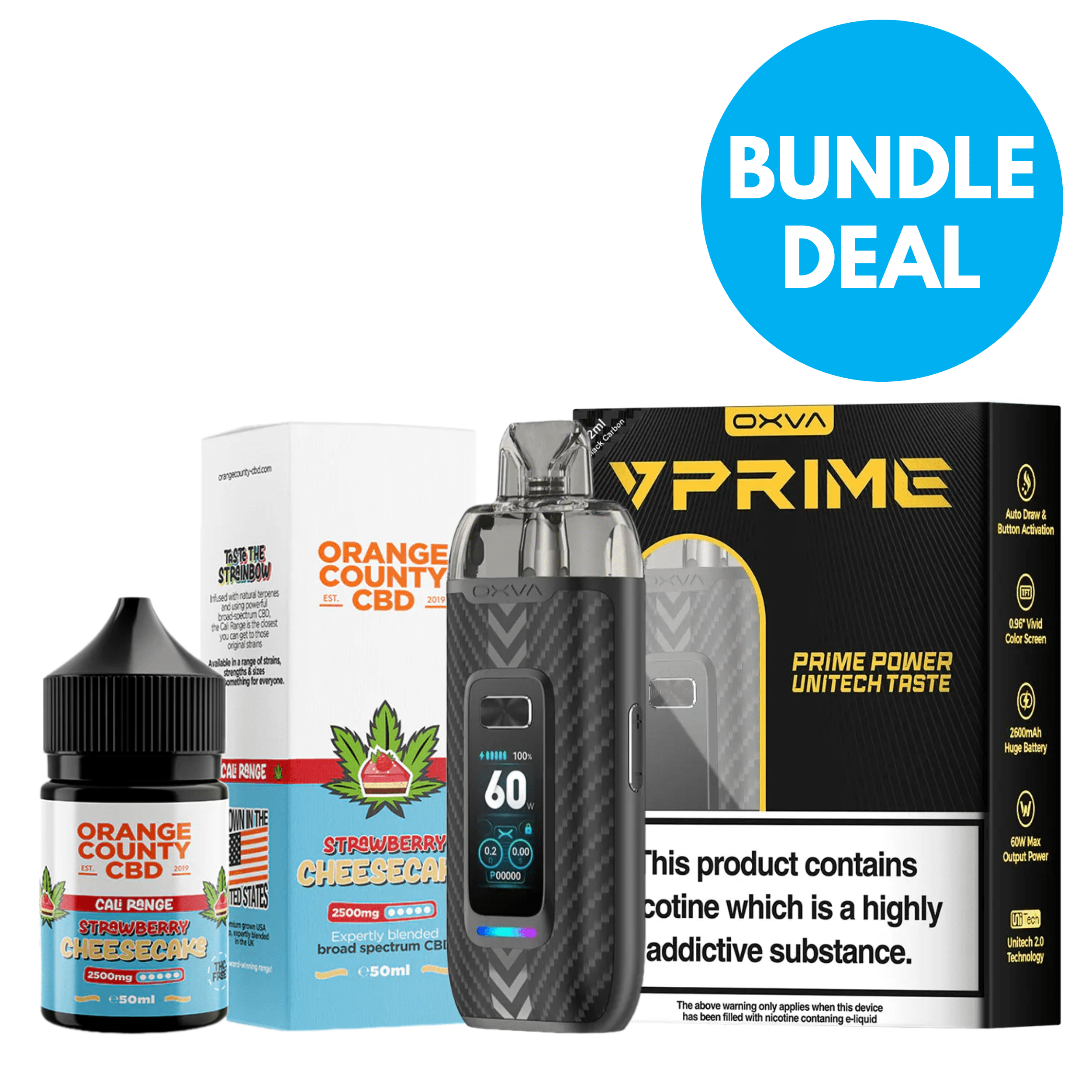 This is a bundle including 1 x OXVA Vprime pod vape kit, which comes with a 0.2Ohms coil and a 0.6Ohms coil along with 1 x Orange County CBD 2500mg 50ml e-liquid, all for £61.99.