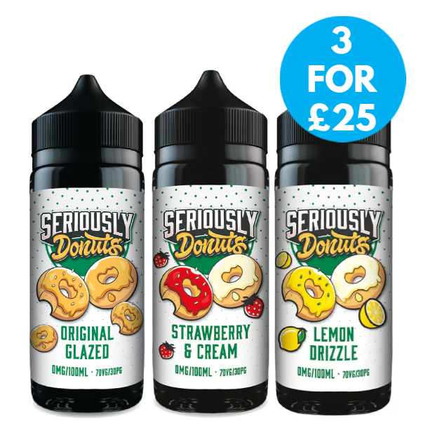 The Seriousl Donuts e-liquids are a range of High VG Liquids from Doozy Vape Co that work best in Sub Ohm Vape Tanks. Each flavoured bottle is a 70% VG/30% VG e-liquid with a 100ml capacity. Each Seriously Donuts shortfill bottle can be used with two 10ml nicotine shots which can be added as required. With 3 fantastic Donutty flavours to choose from you are bound to find your next everyday vape.