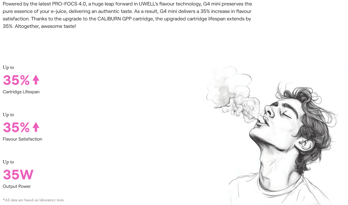 Despite its smaller size, the G4 Mini still delivers impressive performance. It boasts the same powerful 35w maximum output and houses a large 1100mAh built in battery, just like the full sized G4. The main differences come down to size and tech, the G4 Mini offers a more minimalist experience without sacrificing power, making it a great choice for those who want something more discreet and straightforward.