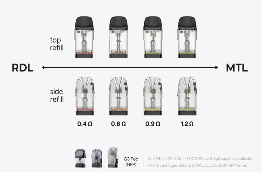 The G3 pods and G4 GPP pods are available in four resistance levels: 0.4Ohms, 0.6Ohm, 0.9Ohm and 1.2Ohm, so you can find the perfect match for your vaping style.