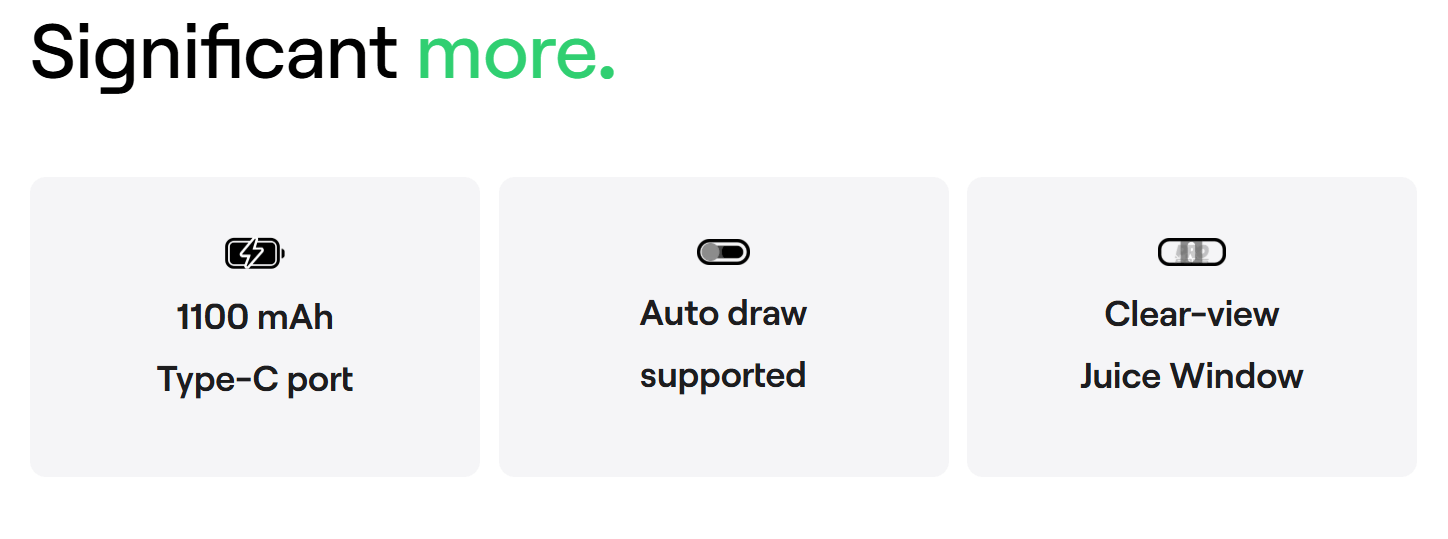 Despite its compact build, the G4 Mini packs a powerful 1100mAh built in battery, delivering extended vaping time so you can enjoy longer sessions without interruptions. When it’s time to recharge, simply plug it in with a fast charging USB Type-C (sold separately).