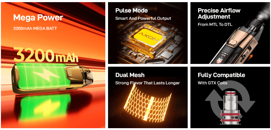 This advanced chip offers a range of features, including pulse mode, which delivers quick bursts or power instead of a continuous stream. This helps maintain the ideal temperature for consistent flavour and can even prolong the lifespan of your coil. Additionally, the Axon chip supports temperature control and incorporates multiple safety protections, giving you a more reliable and enjoyable vape every time.