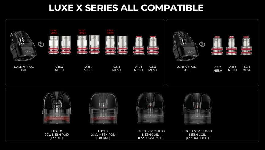 The Vaporesso Luxe XR Max 2 pod vape is compatible with all GTX coils which are designed for the Luxe XR replacement pods. However if you are wanting more convenience, then the Luxe XR Max 2 vape is also compatible with Luxe X pods which come with the built in coils.
