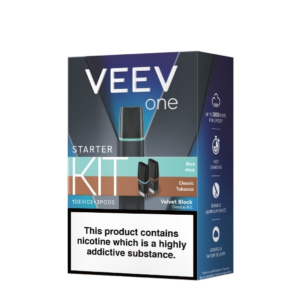 The Veev One Starter Kit is a great choice for anyone seeking convenience and reliability. Compact and easy to use, it’s ideal for beginners and ex-smokers looking for a smooth transition to vaping. Each starter kit includes a reusable Veev One device in its stylish Velvet Black colour, along with two prefilled pods in different flavours. If you get tired of one flavour, simply switch to the other and it’s like having a brand new vape.