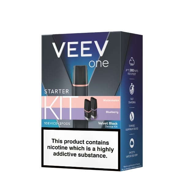 Each starter kit comes with a Veev One device in the colour Velvet Black and two different flavoured pods.